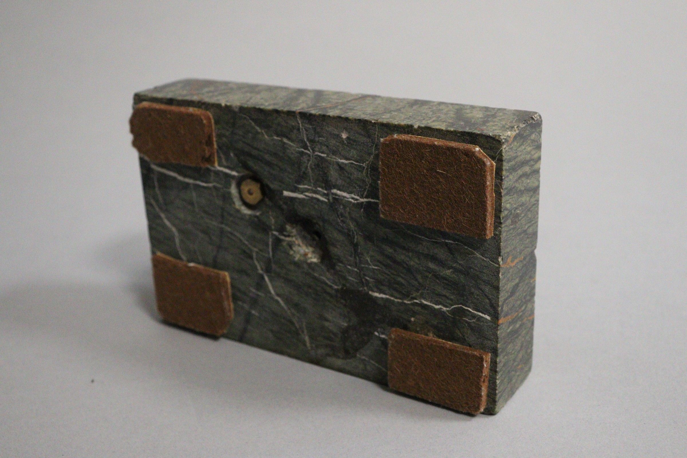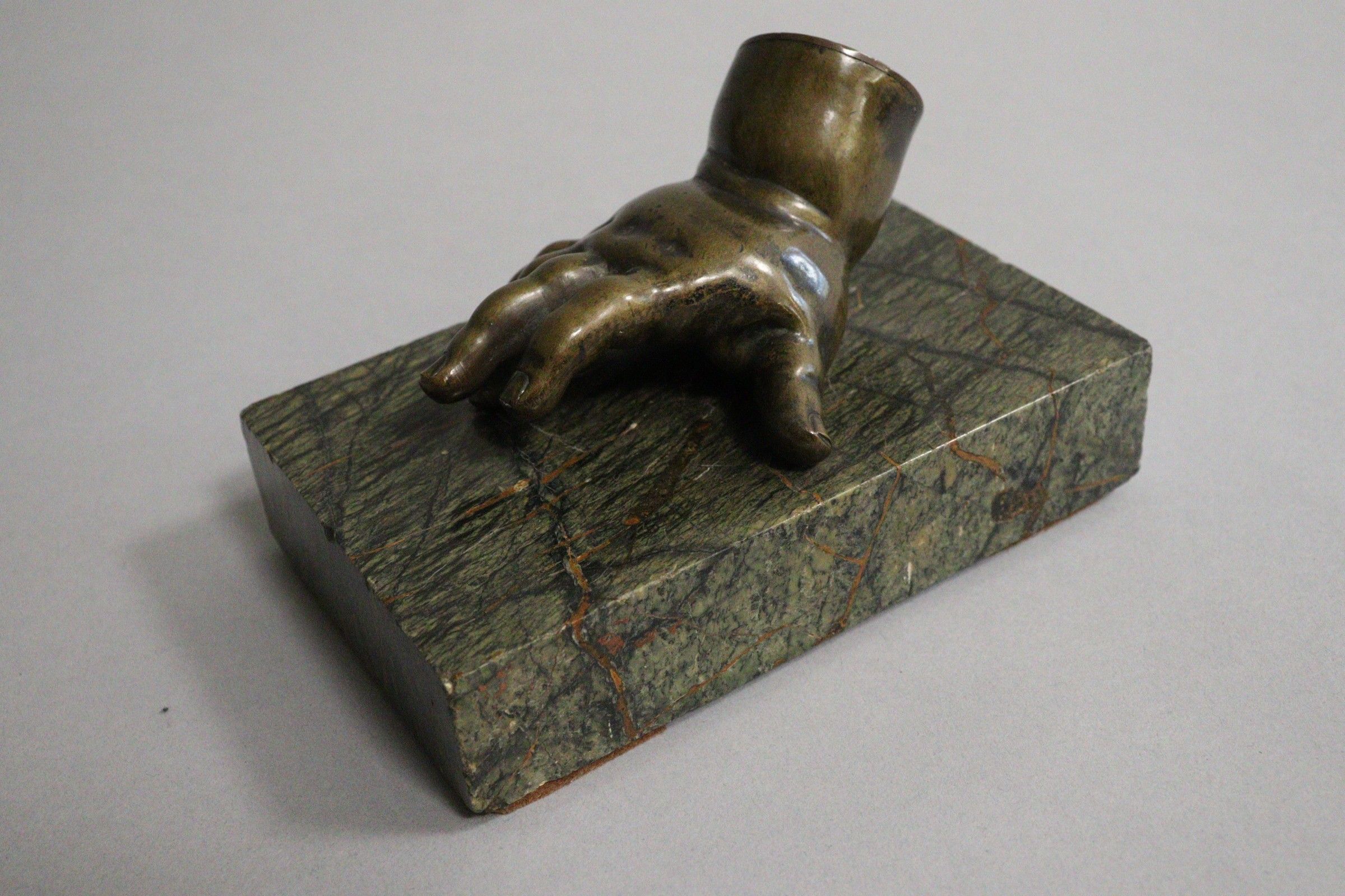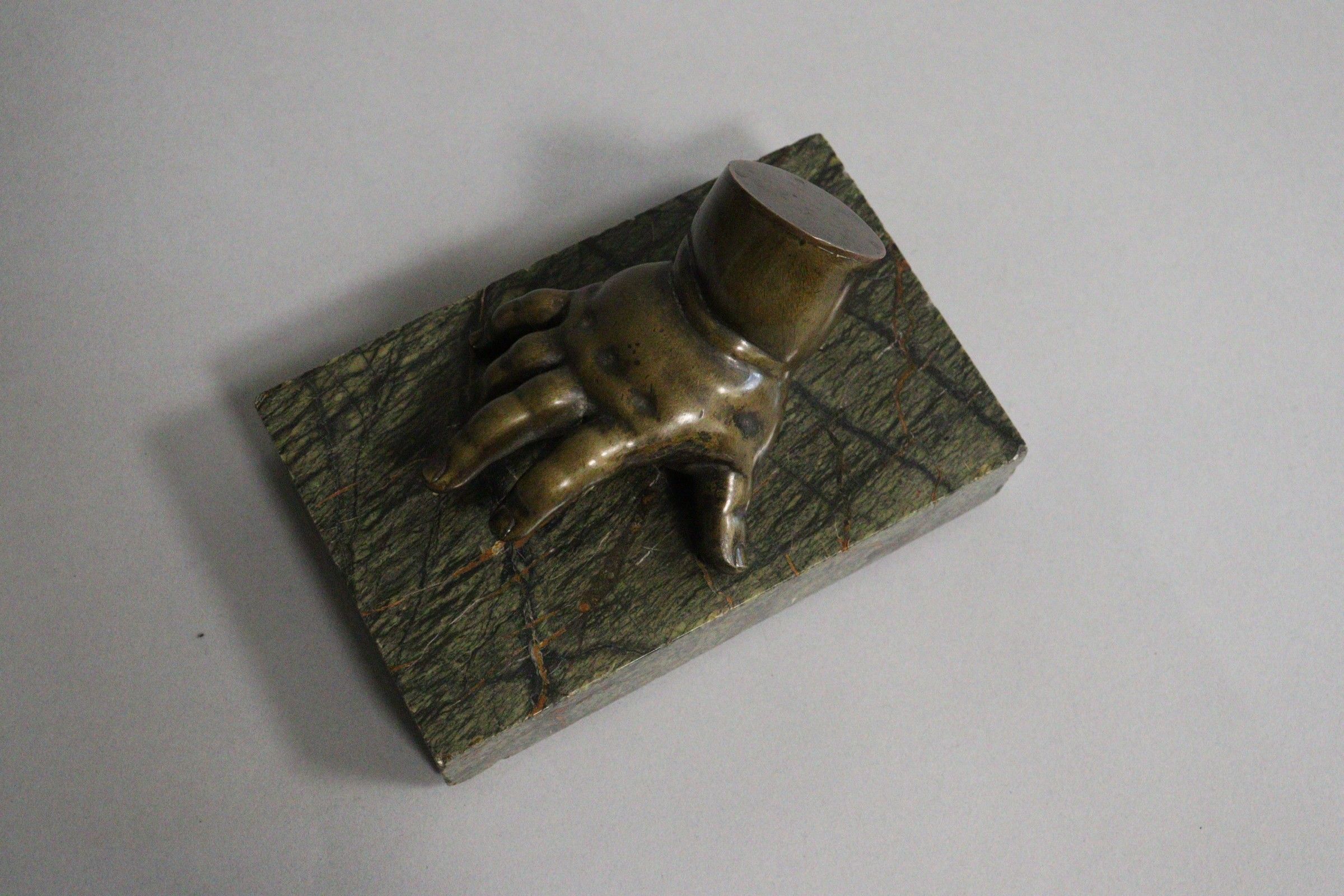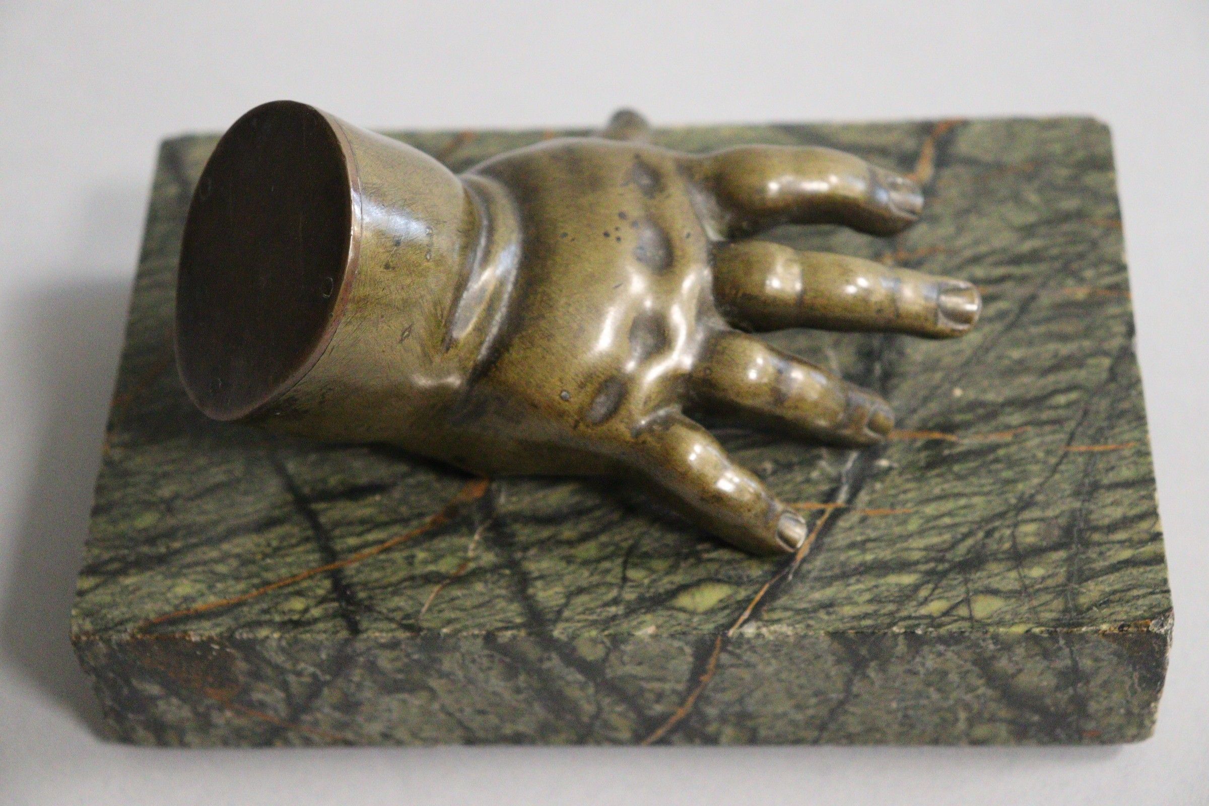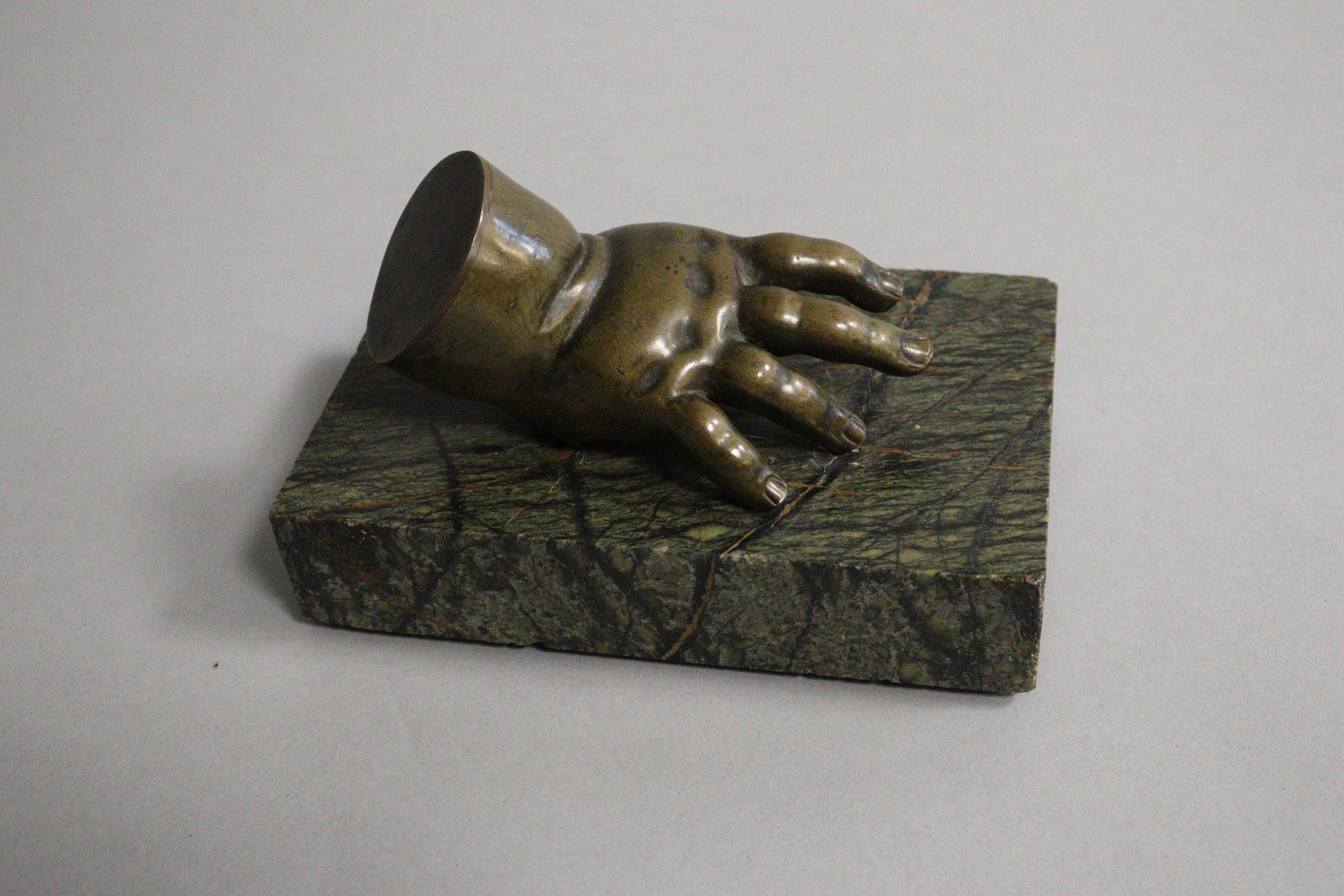 Paperweight featuring a child's hand in patinated bronze. Resting on a green veined marble base.