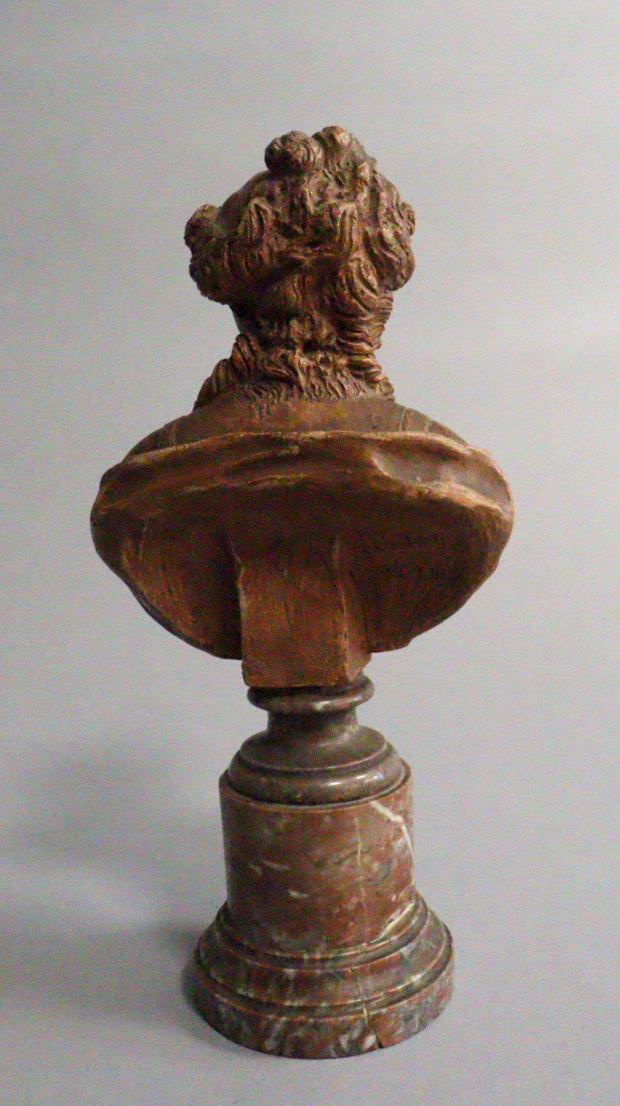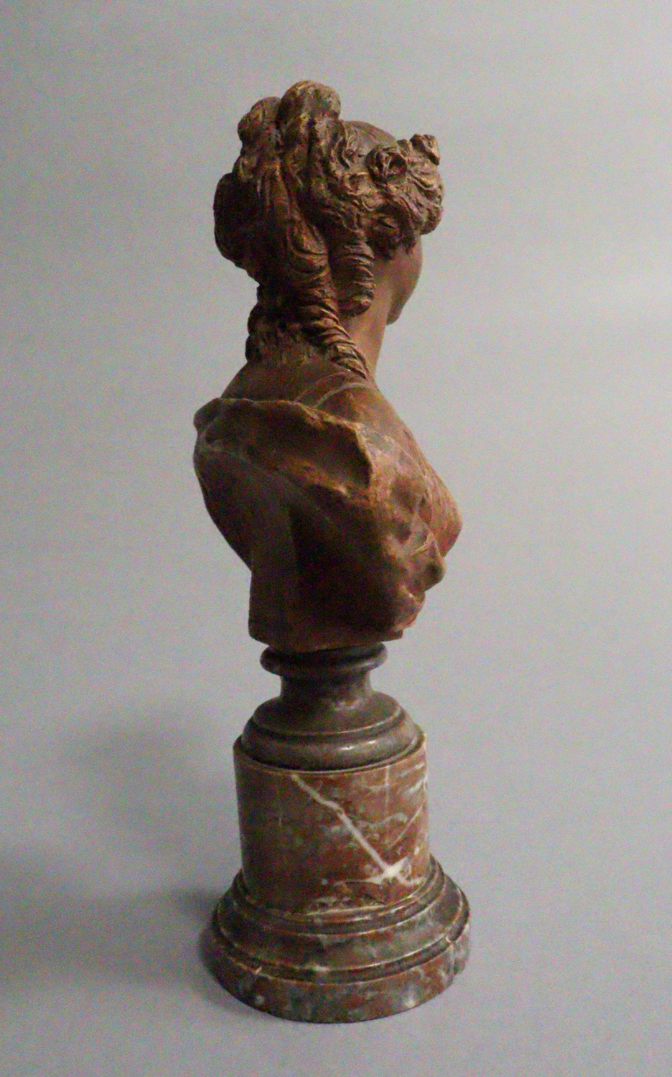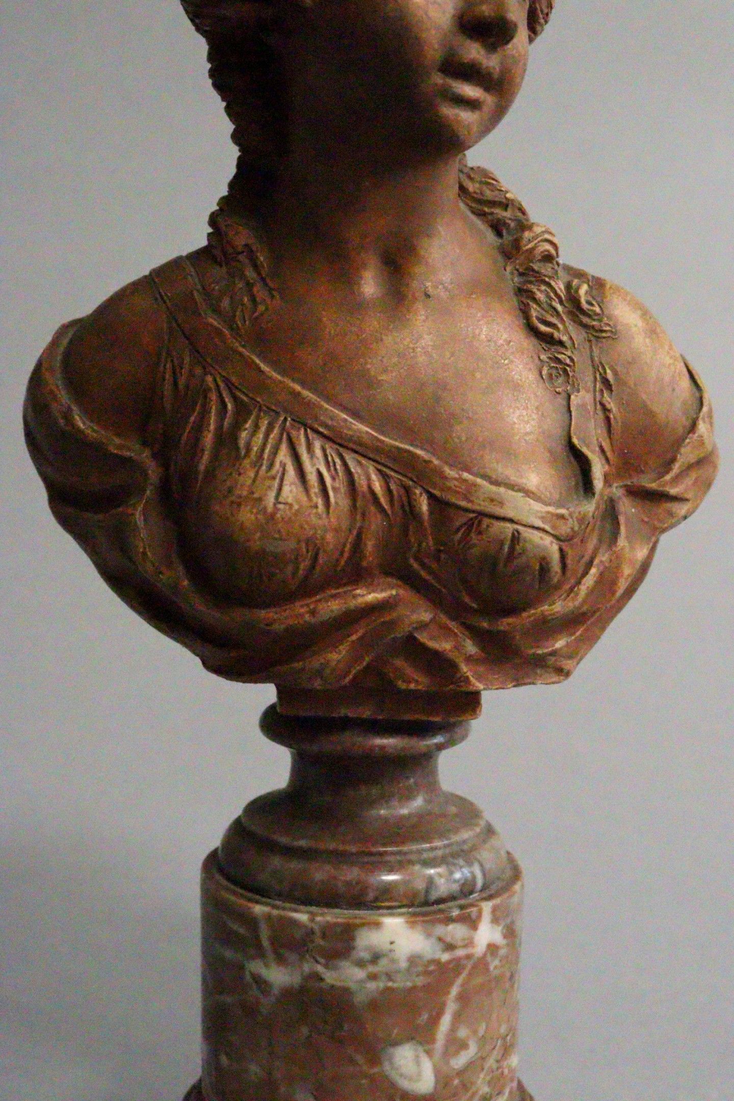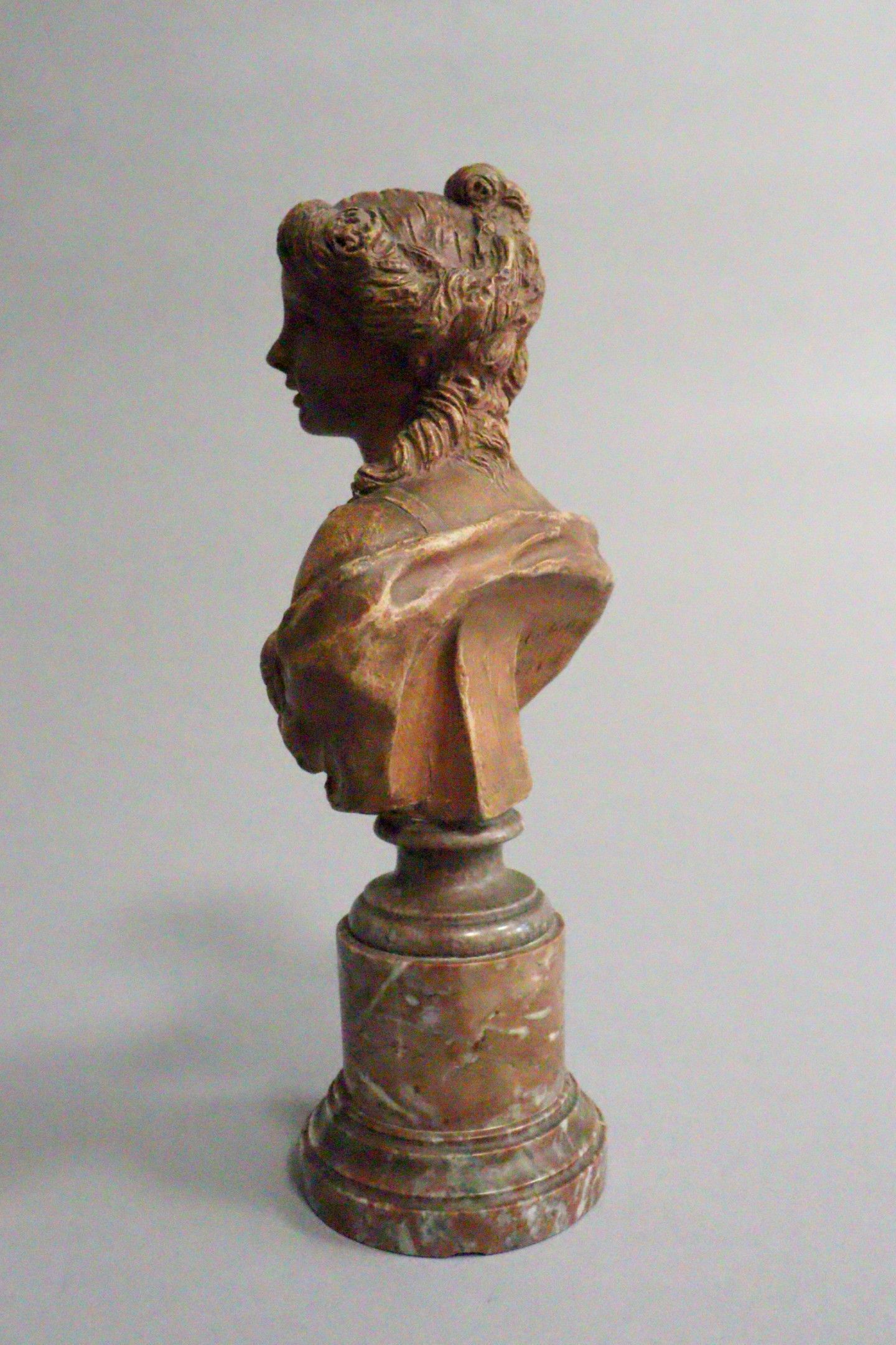 After CLODION (1738-1814). Bust of a draped young girl. Terracotta, signed and dated 1774 on the back. Resting on a marble colonnette base. Height: 16 cm without the base - Total height: 25 cm