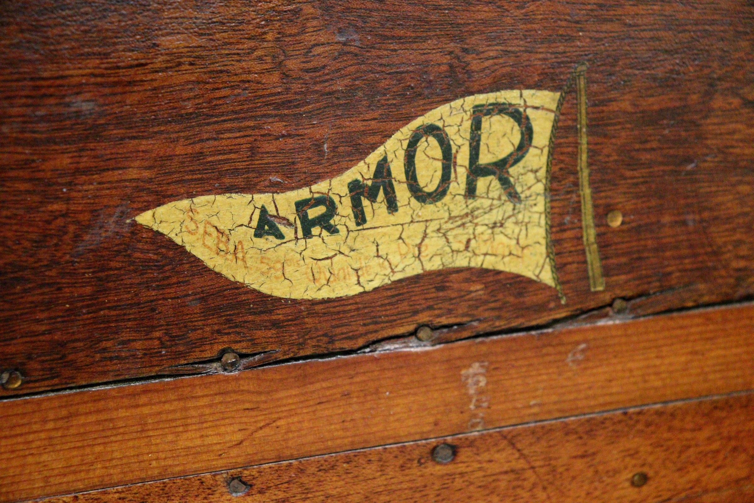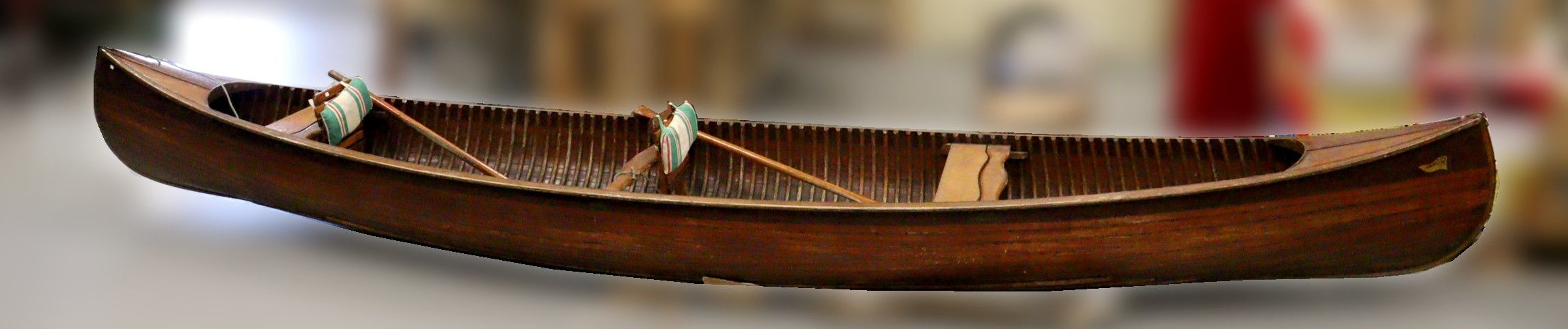 ARMOR (S.E.B.A). Wooden canoe. Equipped with six oars, two slatted seats, two wooden benches, bag with wild jackets, fabrics and cushions, trolley for transporting the canoe. L.: 468 cm - W.: 93 cm - H.: 31 cm