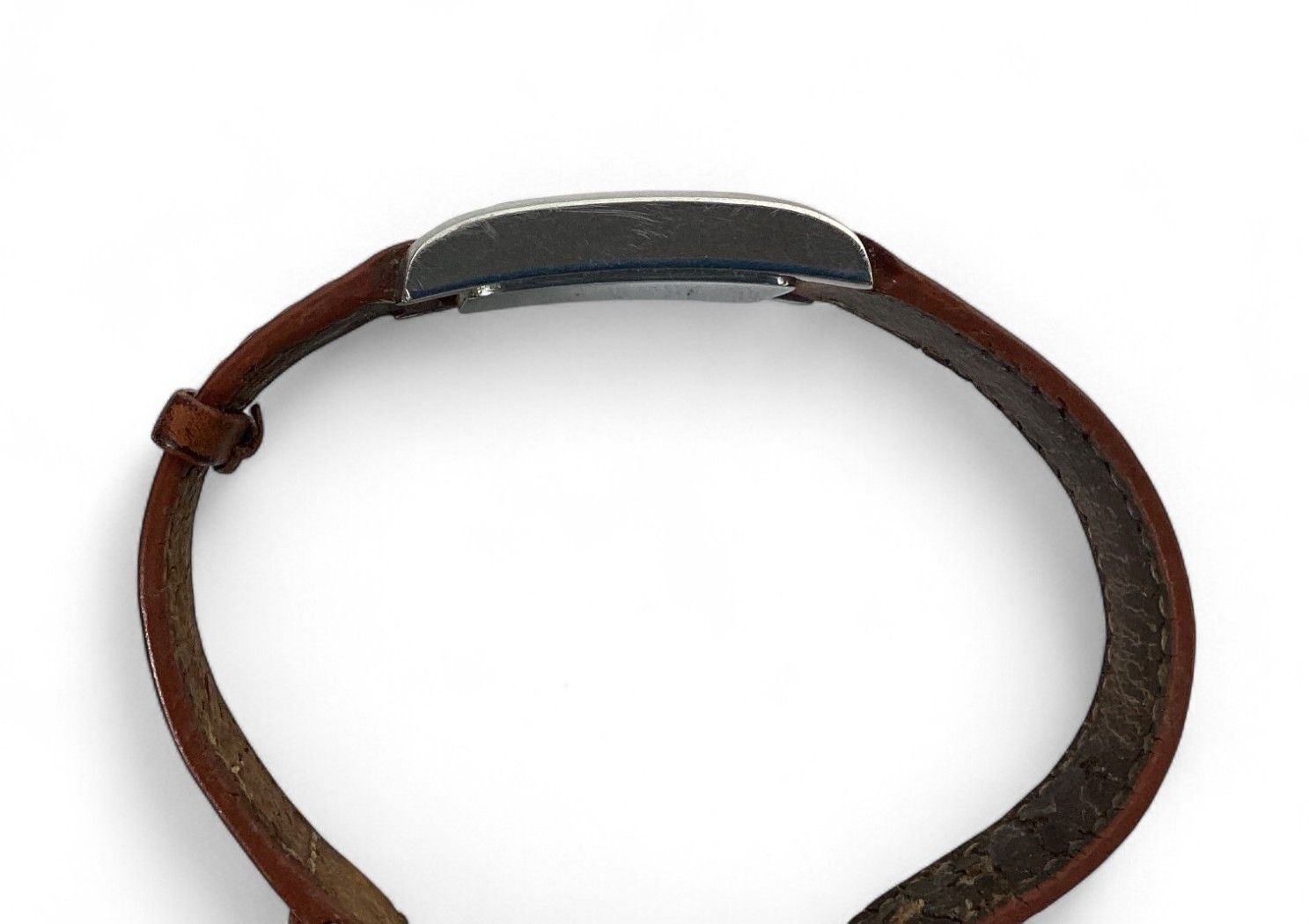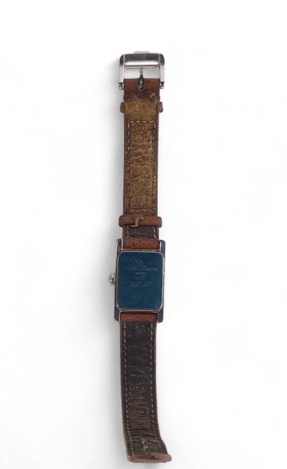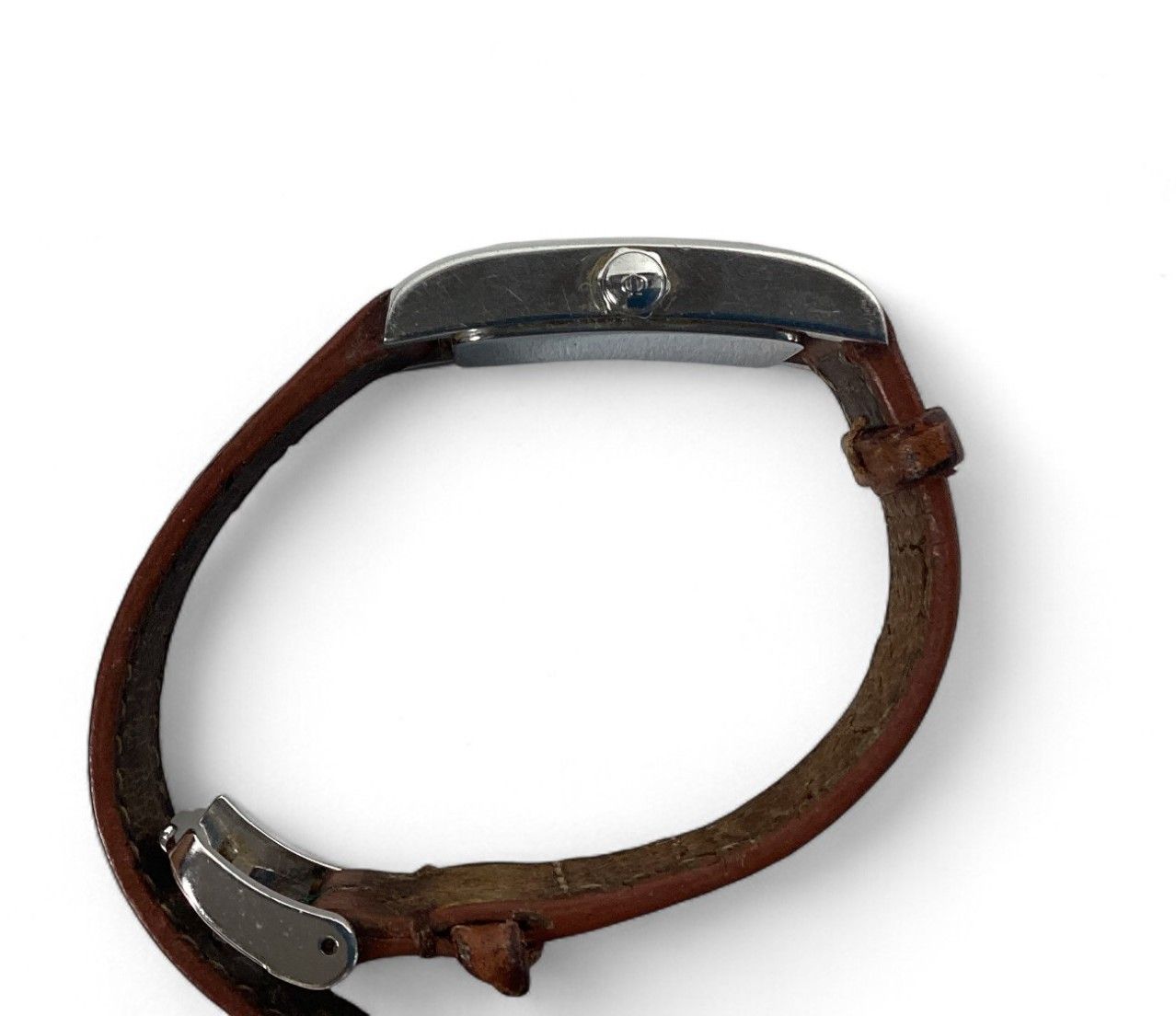 Men's watch in polished steel, rectangular case, dial with champagne background, hour markers and Arabic numerals for the 1/4 hour with a second hand at 6 o'clock. Quartz movement. Gold ostrich-style leather strap (worn) with branded buckle.