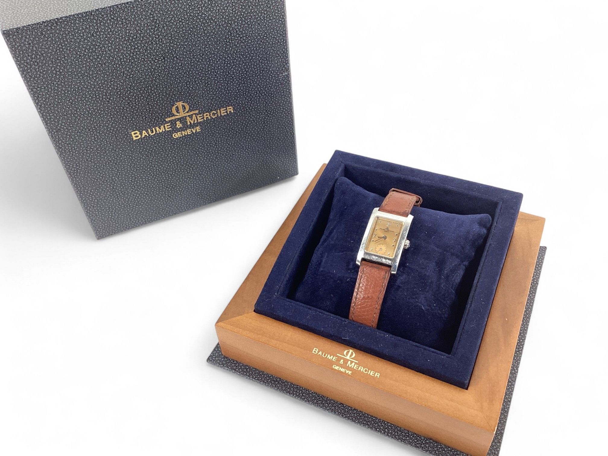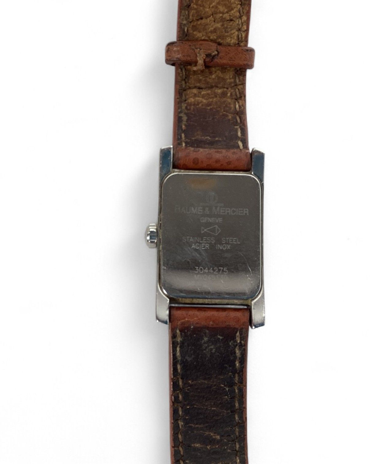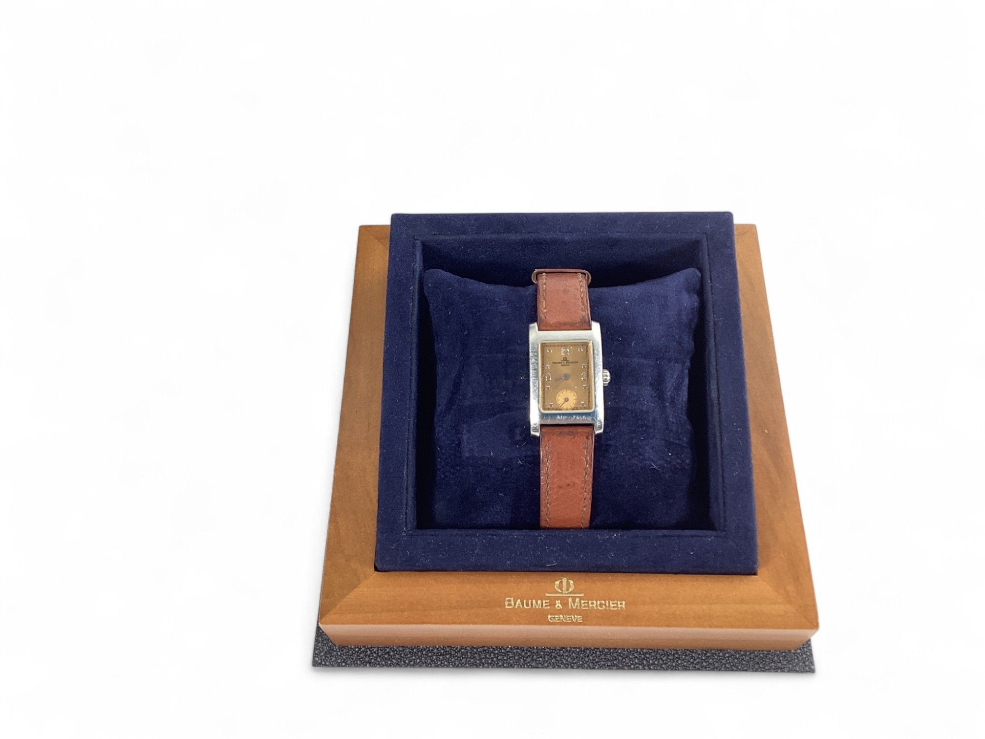 Men's watch in polished steel, rectangular case, dial with champagne background, hour markers and Arabic numerals for the 1/4 hour with a second hand at 6 o'clock. Quartz movement. Gold ostrich-style leather strap (worn) with branded buckle.