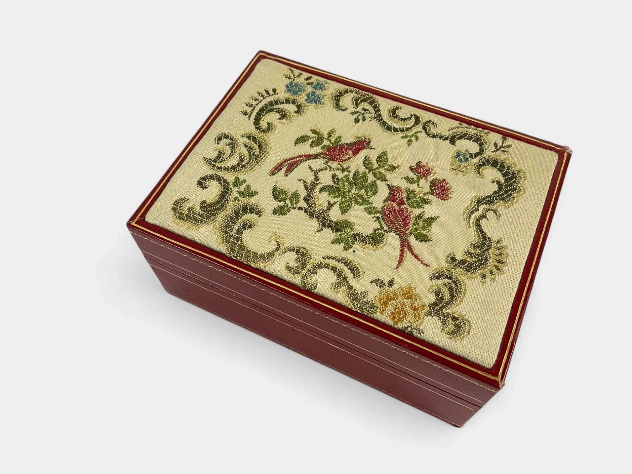 ROLEX - Creation Genève, Box for "President" watch in red velvet and coloured damask with "Birds" decoration. With its bracelet base. H.: 8 cm - W.: 14 cm - D.: 10 cm