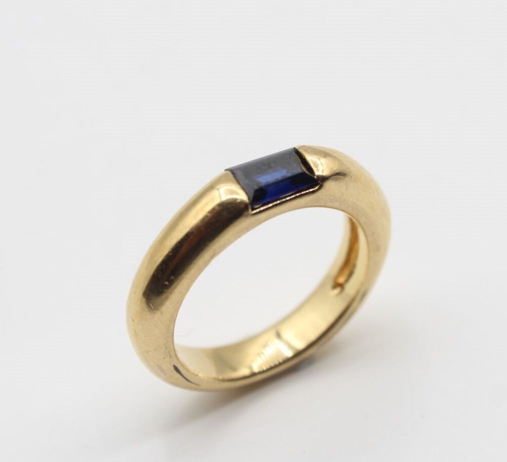 Gilt metal ring set with a rectangular blue stone Gross weight: 5g TDD 53 - JEWELRY, OBJECTS AND PRECIOUS EFFECTS ARE NEVER KEPT IN STORES BUT IN BANK CASES.