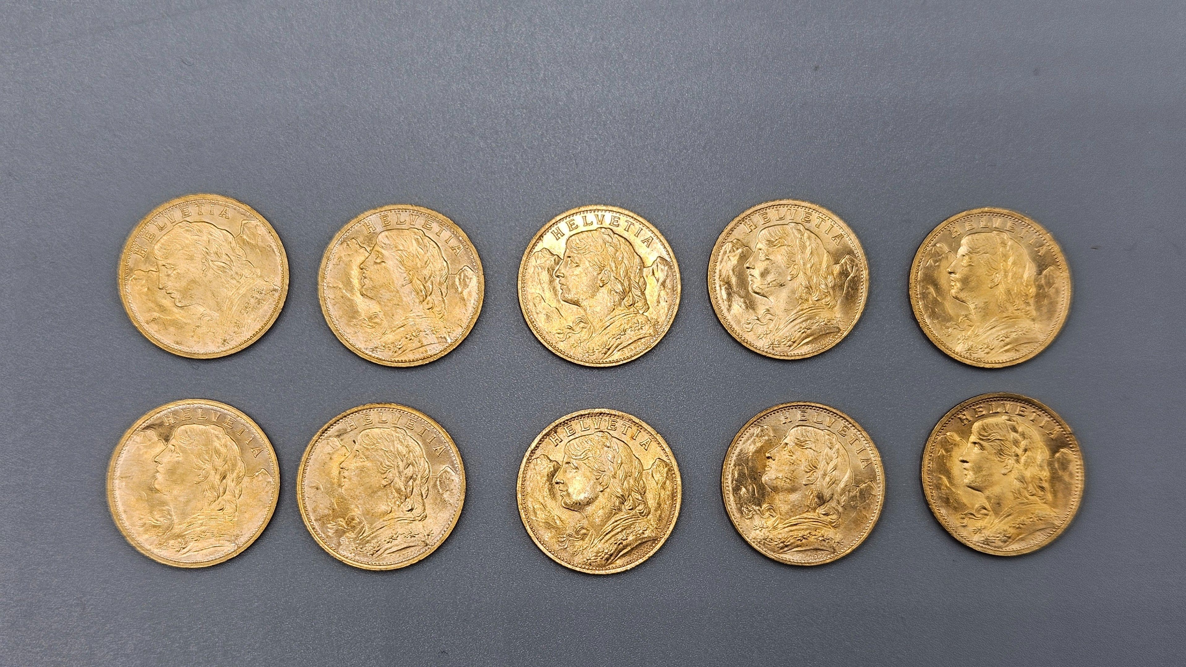 Lot of 10 used 20 Frs Swiss gold coins. SELLING EXPENSES 14.4 % INCL. VAT. LOT SOLD ON SIMPLE DESIGNATION, WITHOUT EXHIBITION, KEPT IN A BANK VAULT.