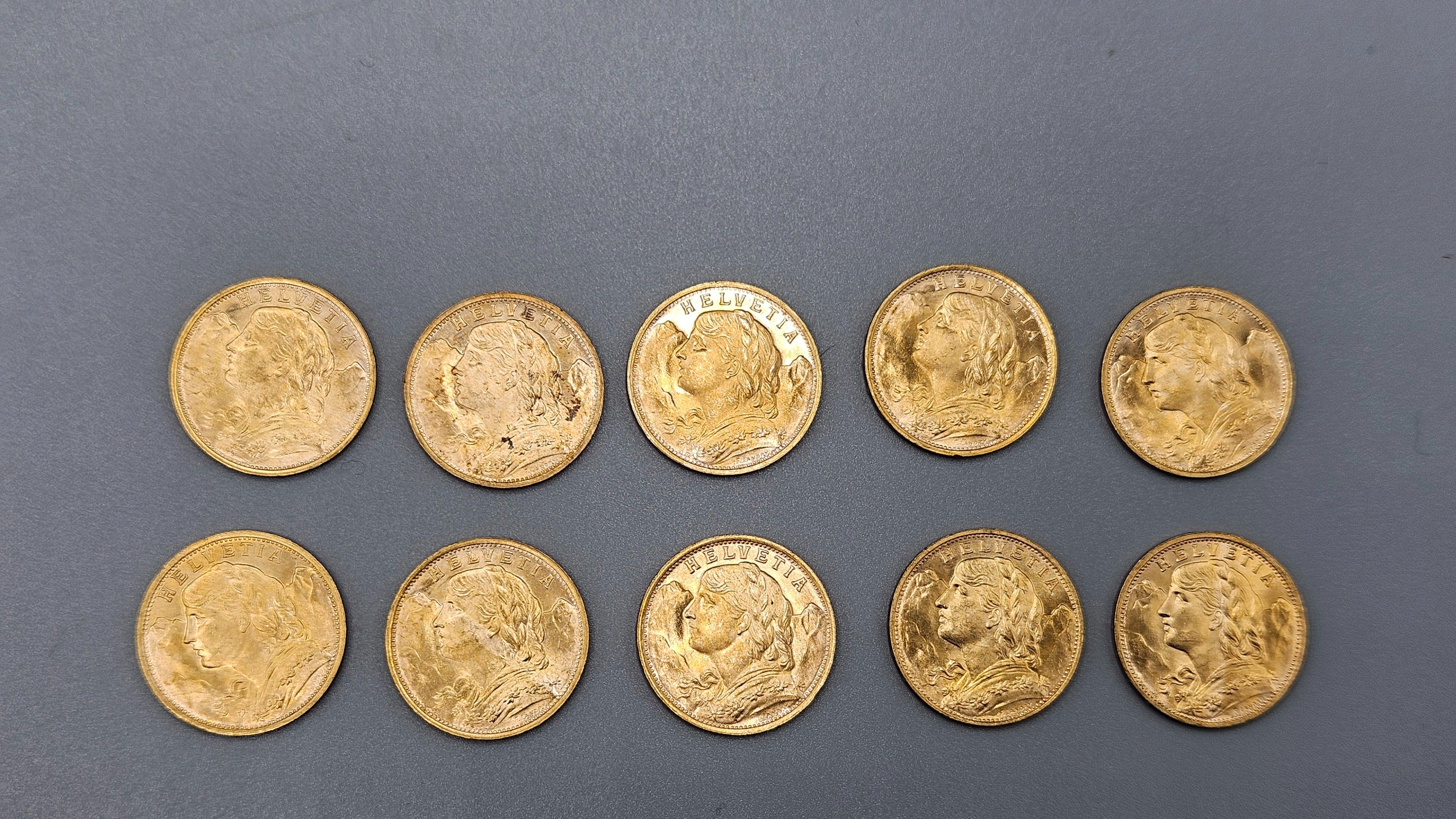 Lot of 10 used 20 Frs Swiss gold coins.