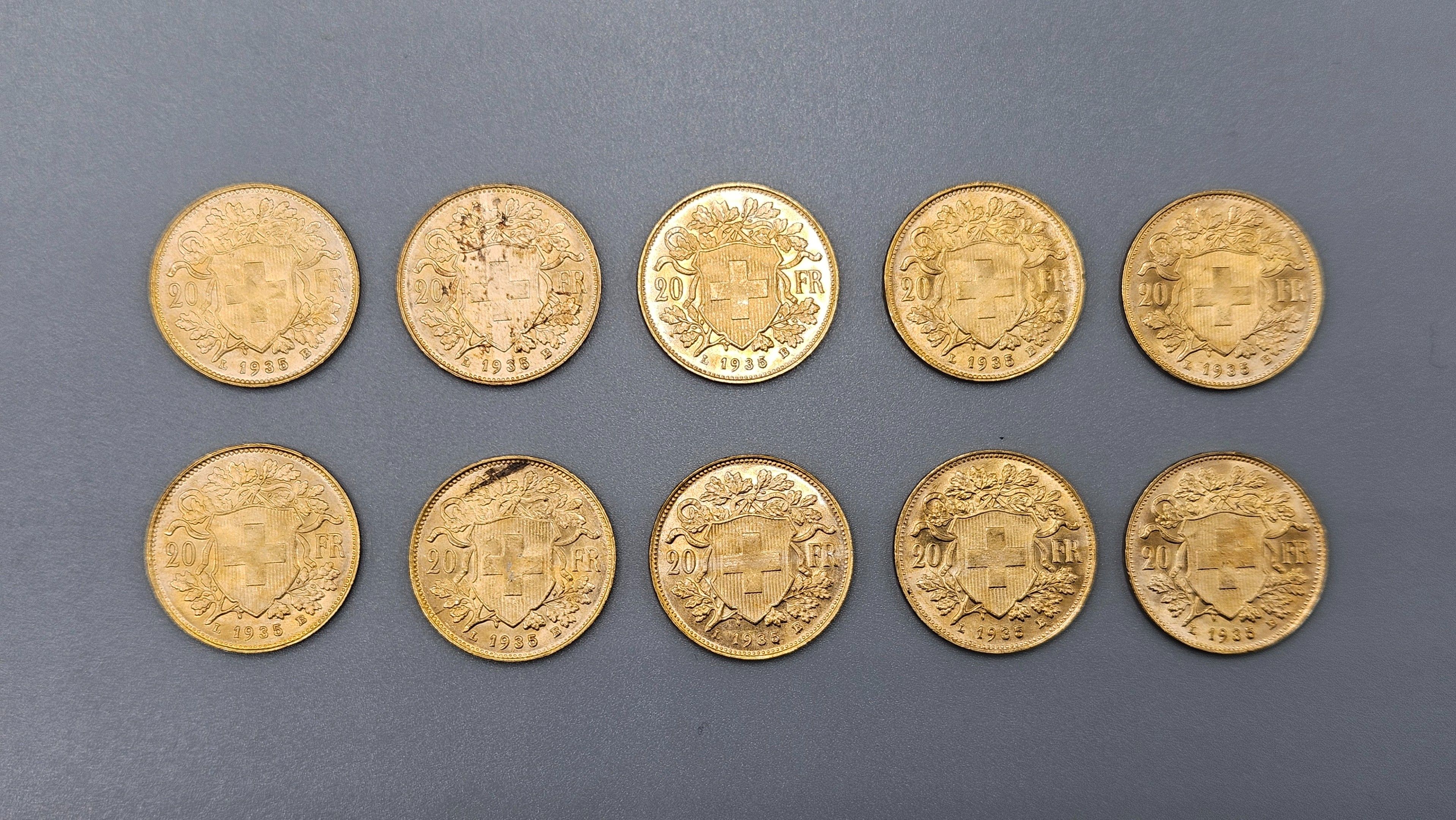 Lot of 10 used 20 Frs Swiss gold coins. SELLING EXPENSES 14.4 % INCL. VAT. LOT SOLD ON SIMPLE DESIGNATION, WITHOUT EXHIBITION, KEPT IN A BANK VAULT.
