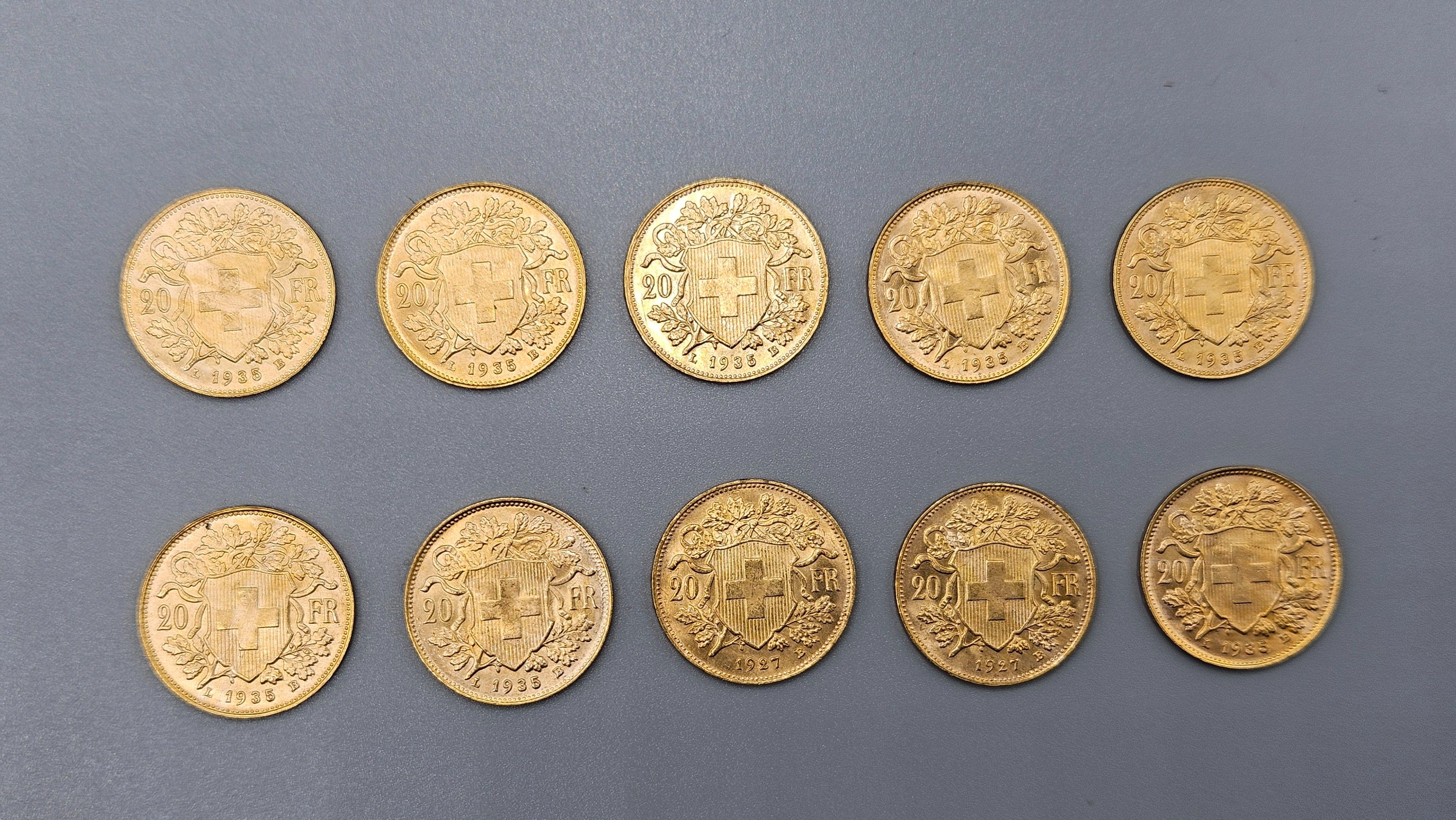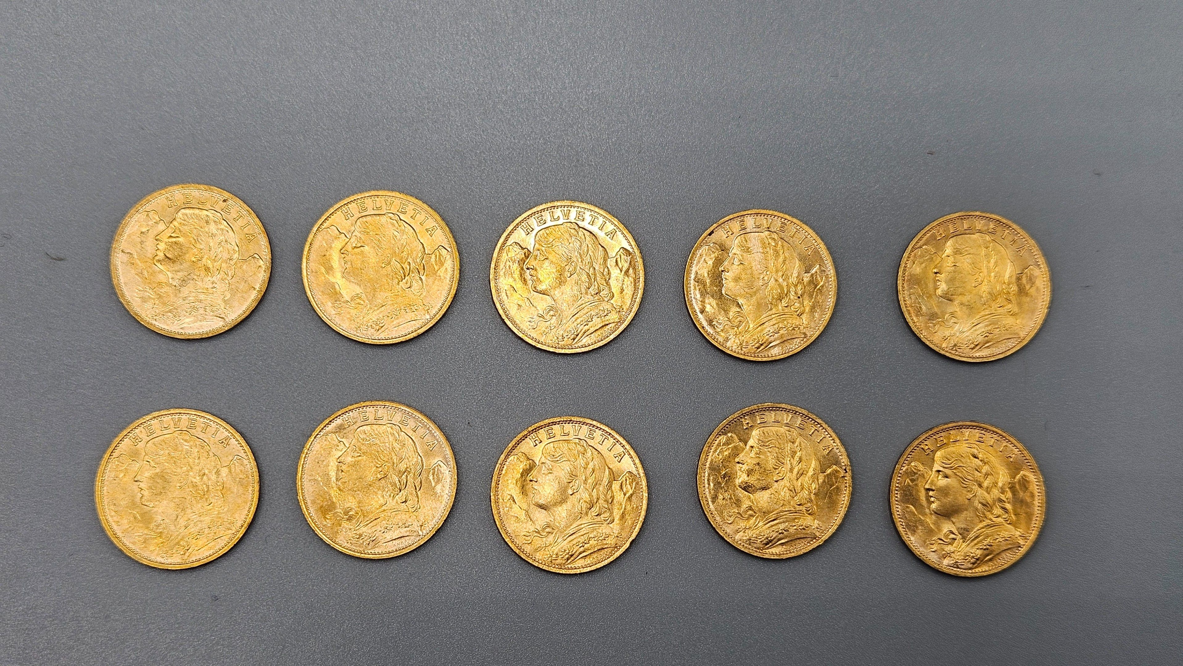 Lot of 10 used 20 Frs Swiss gold coins. SELLING EXPENSES 14.4 % INCL. VAT. LOT SOLD ON SIMPLE DESIGNATION, WITHOUT EXHIBITION, KEPT IN A BANK VAULT.