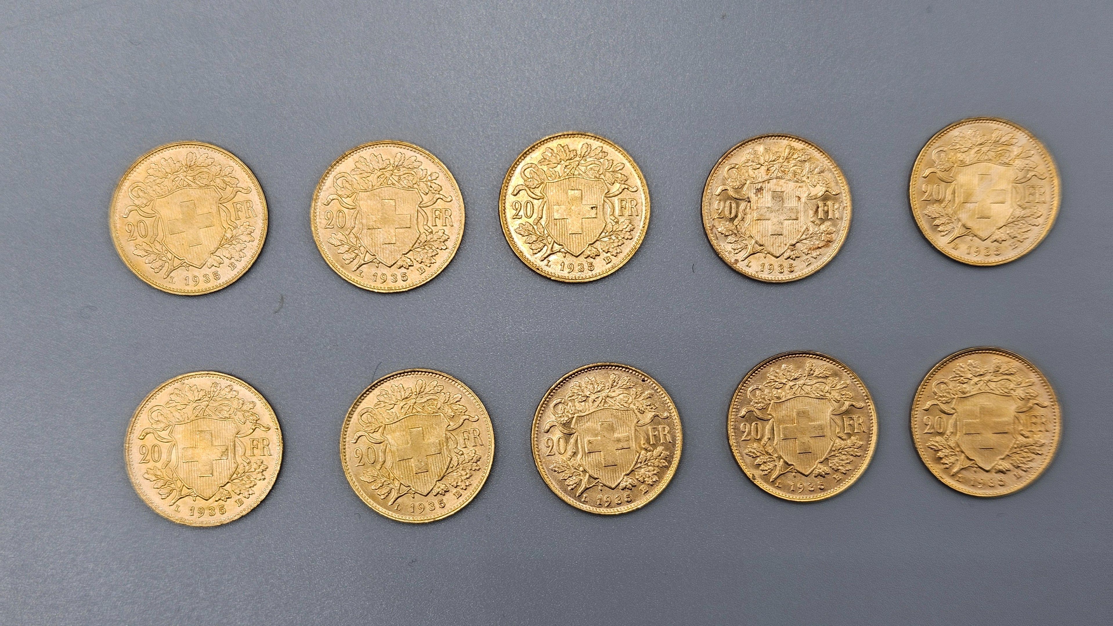 Lot of 10 used 20 Frs Swiss gold coins. SELLING EXPENSES 14.4 % INCL. VAT. LOT SOLD ON SIMPLE DESIGNATION, WITHOUT EXHIBITION, KEPT IN A BANK VAULT.