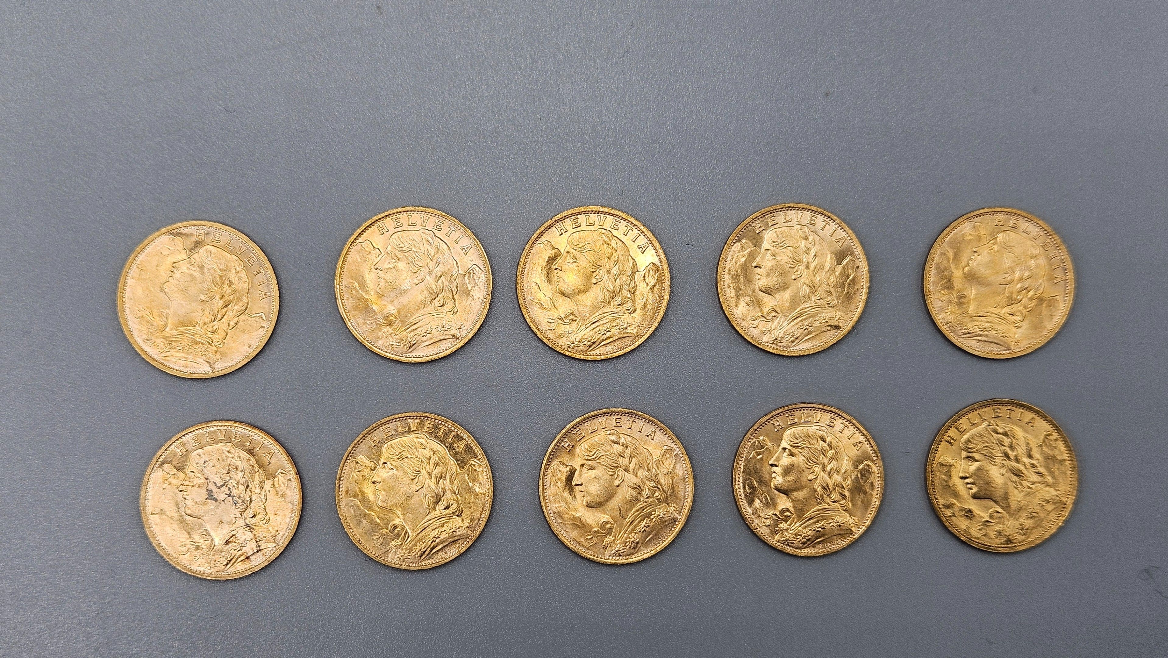 Lot of 10 used 20 Frs Swiss gold coins. SELLING EXPENSES 14.4 % INCL. VAT. LOT SOLD ON SIMPLE DESIGNATION, WITHOUT EXHIBITION, KEPT IN A BANK VAULT.