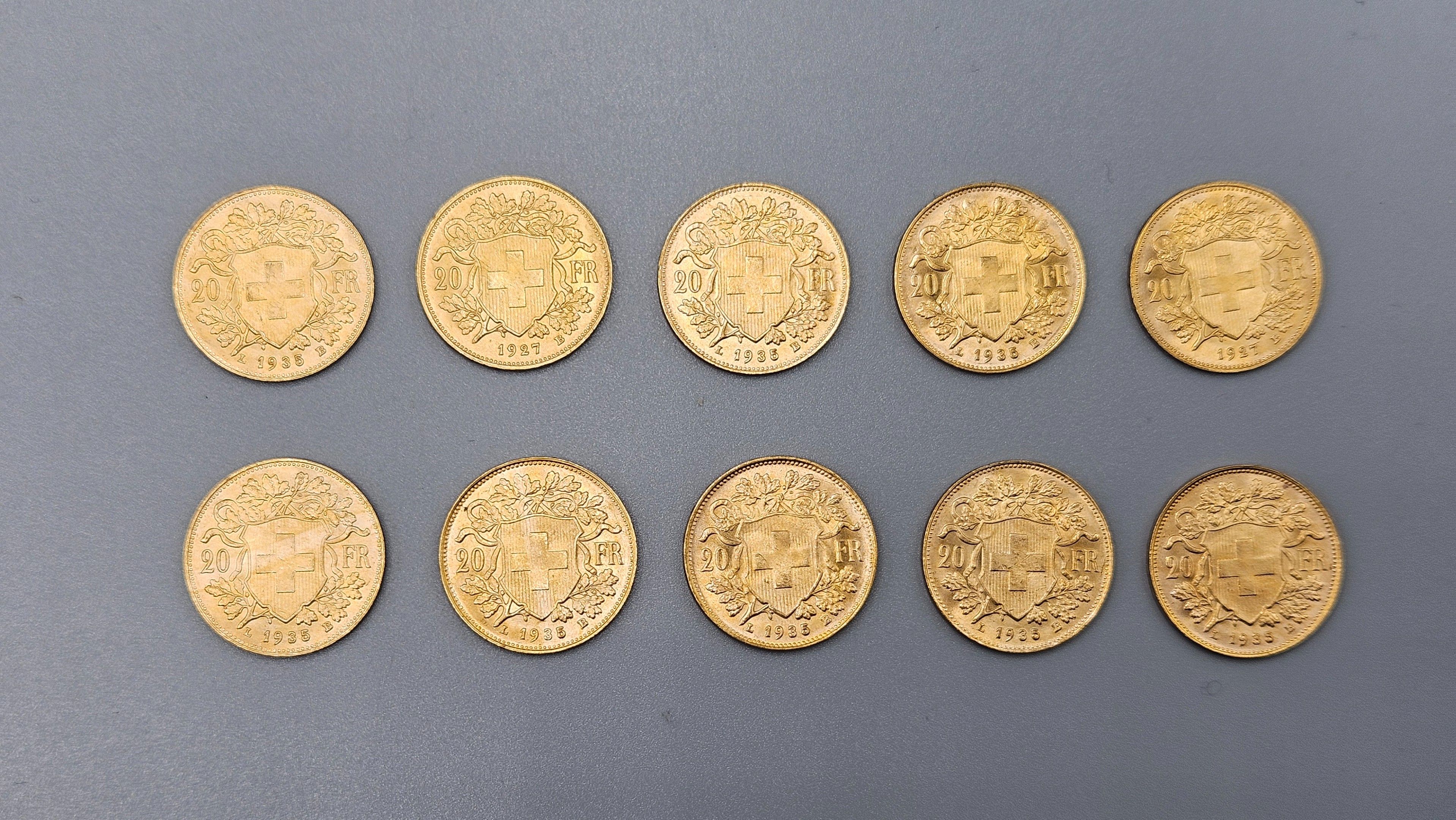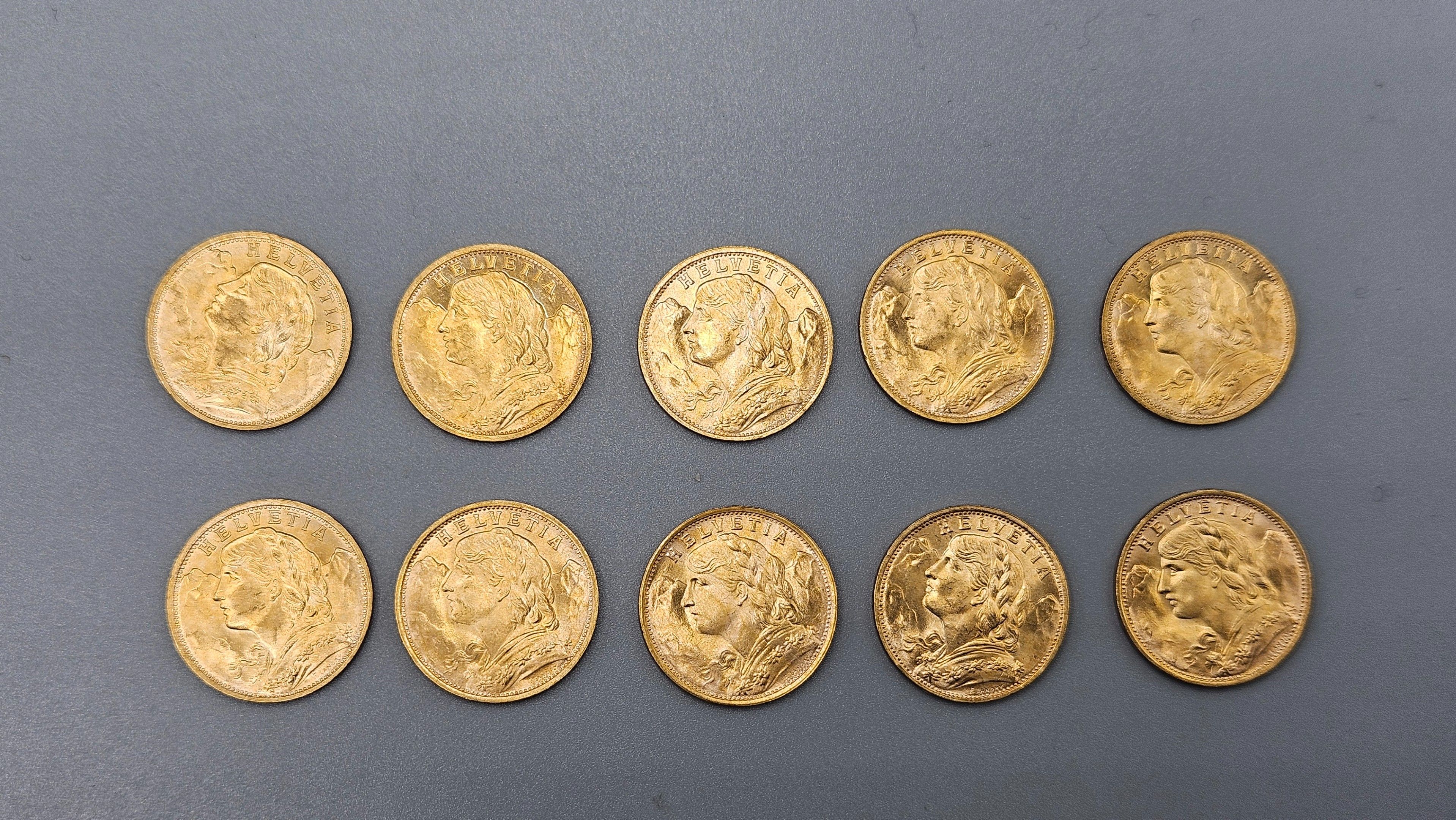 Lot of 10 used 20 Frs Swiss gold coins. SELLING EXPENSES 14.4 % INCL. VAT. LOT SOLD ON SIMPLE DESIGNATION, WITHOUT EXHIBITION, KEPT IN A BANK SAFE.