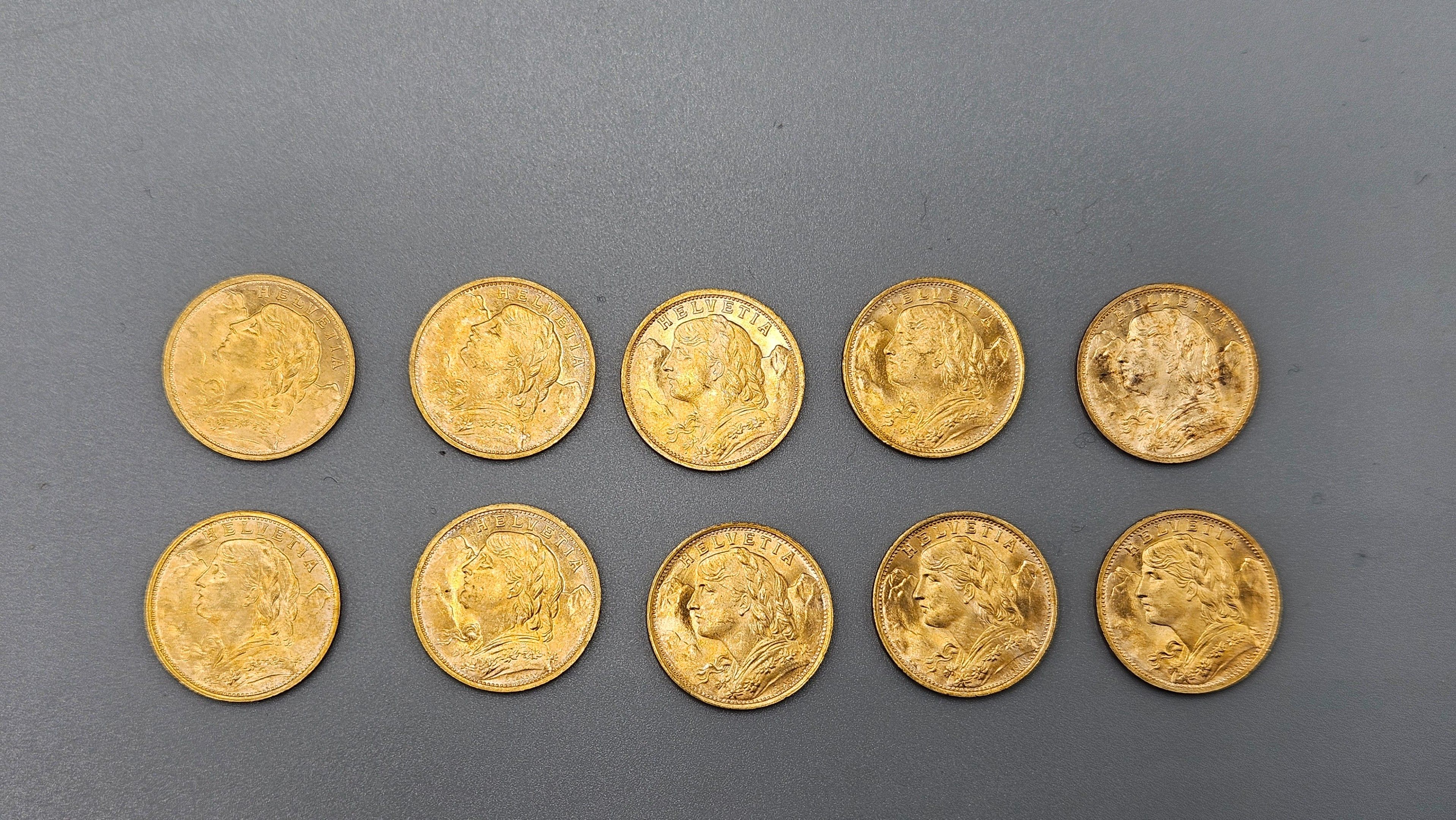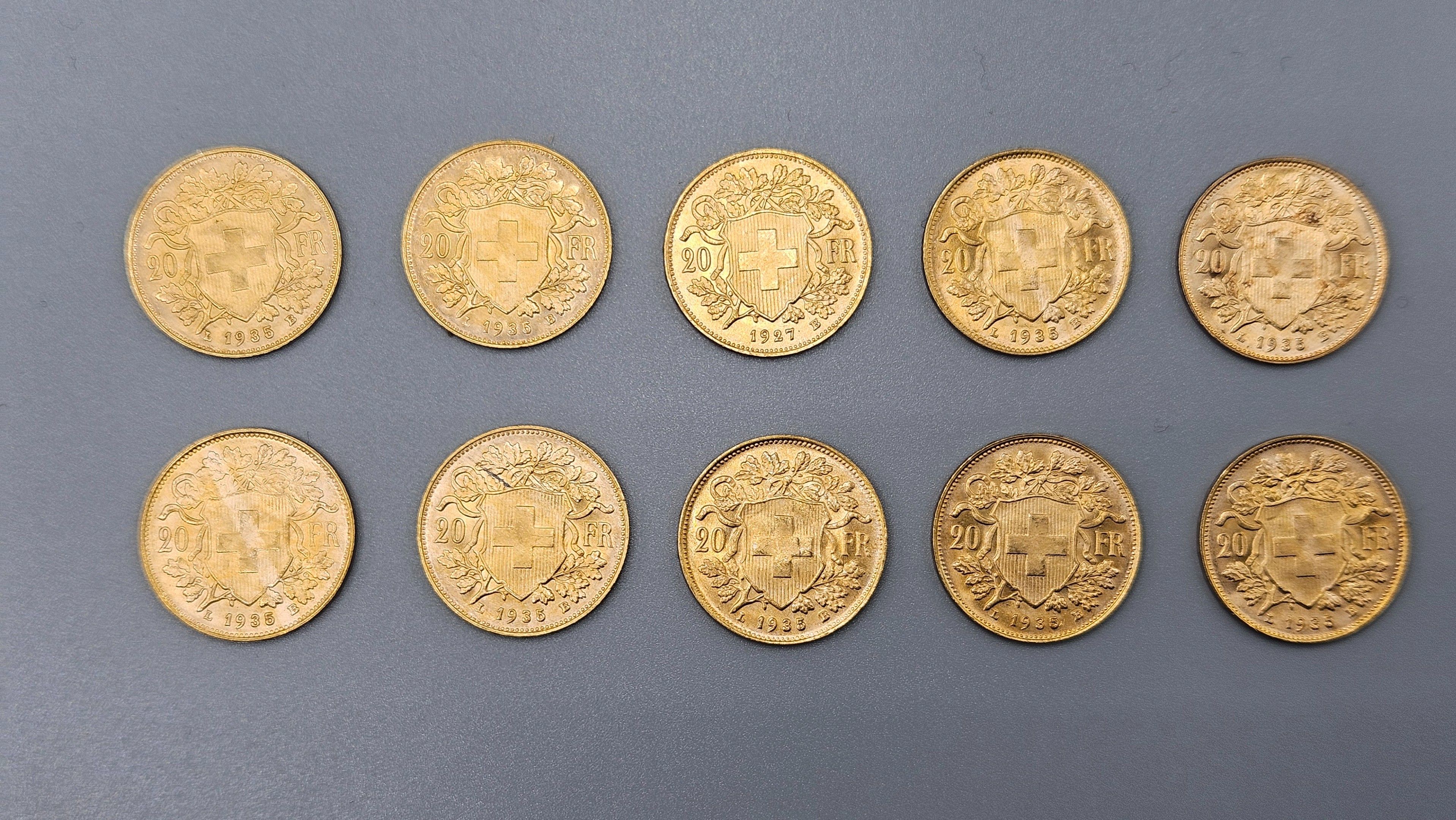 Lot of 10 used 20 Frs Swiss gold coins. SELLING EXPENSES 14.4 % INCL. VAT. LOT SOLD ON SIMPLE DESIGNATION, WITHOUT EXHIBITION, KEPT IN A BANK SAFE.