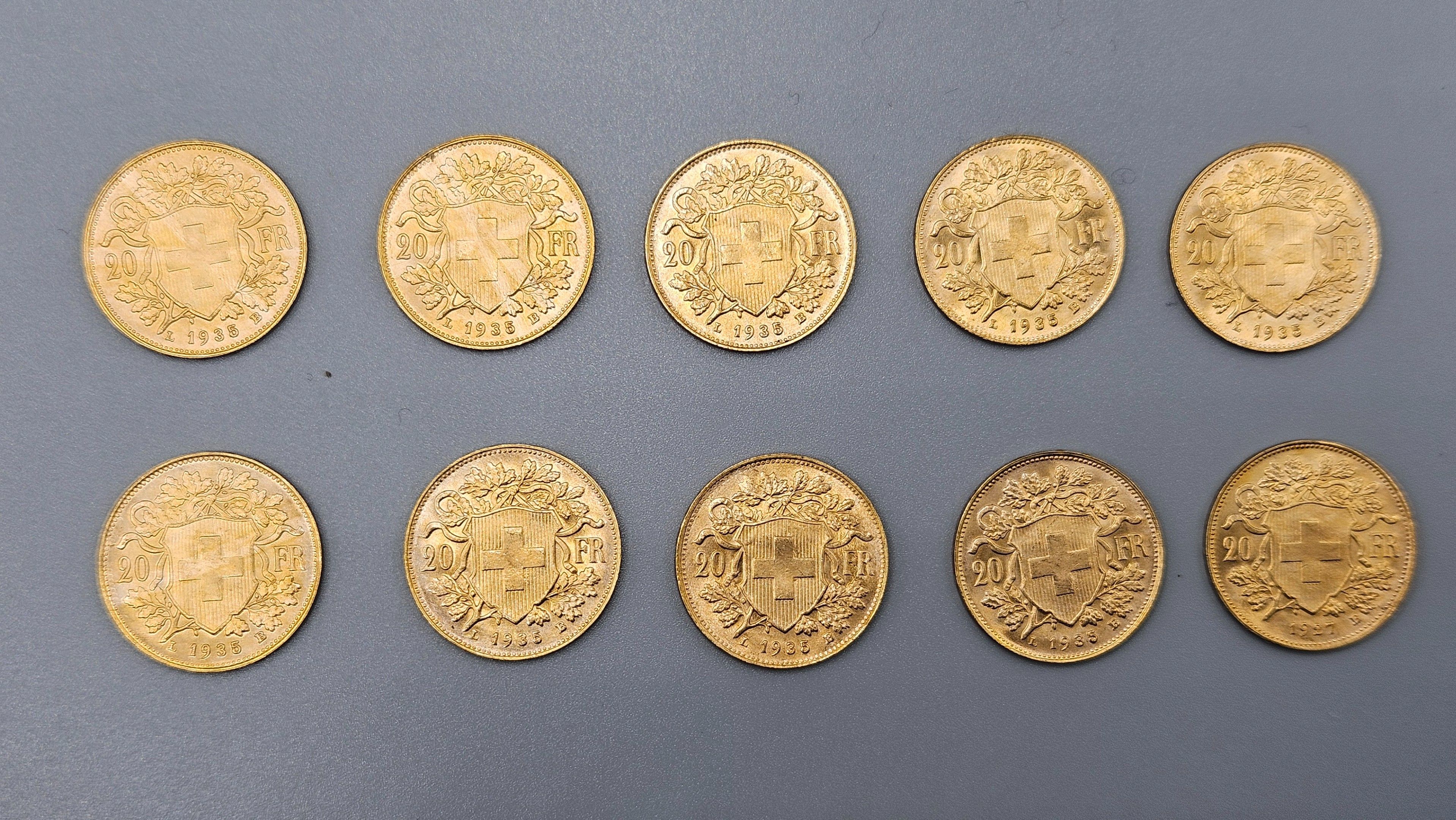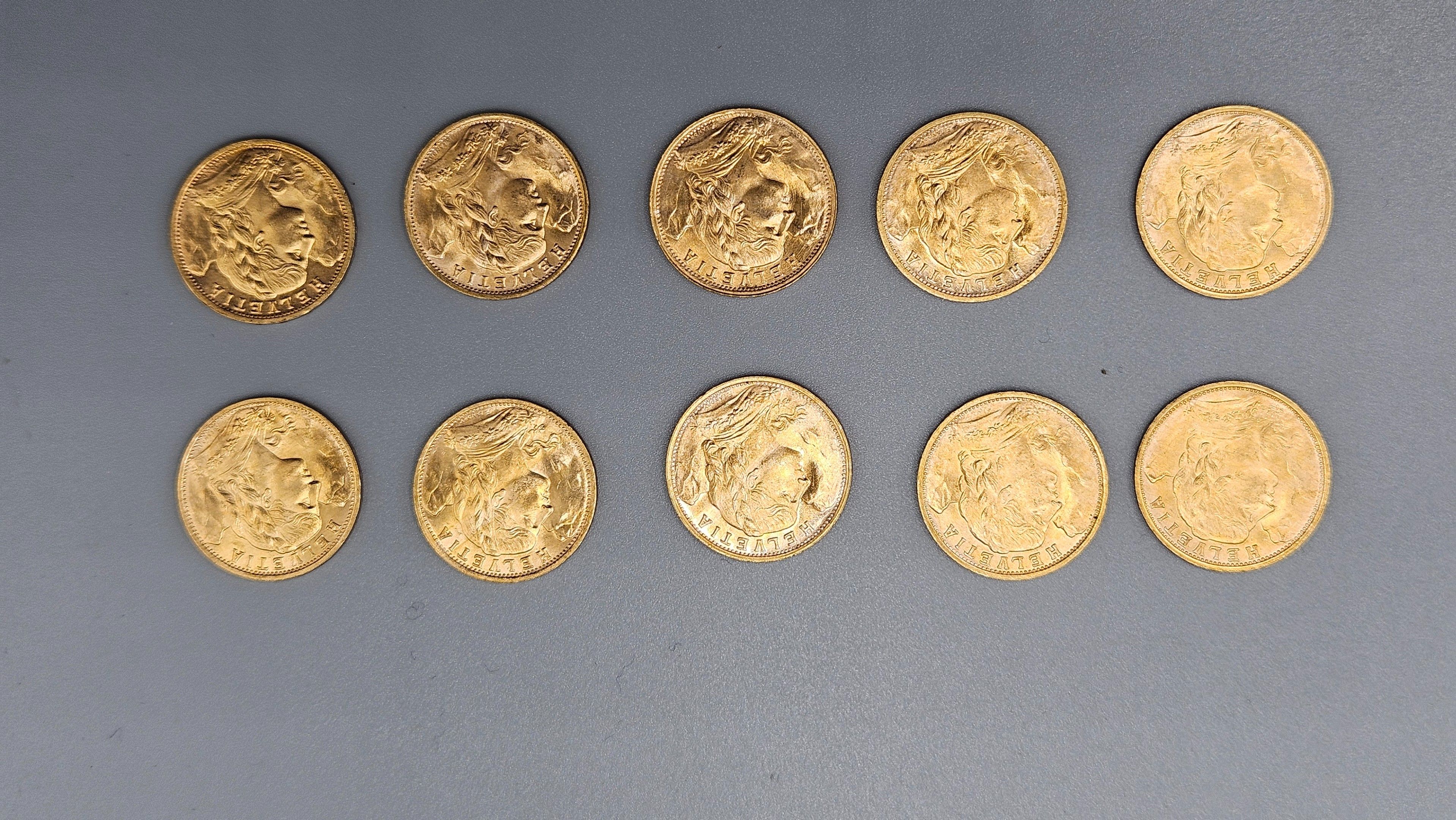 Lot of 10 used 20 Frs Swiss gold coins. SELLING EXPENSES 14.4 % INCL. VAT. LOT SOLD ON SIMPLE DESIGNATION, WITHOUT EXHIBITION, KEPT IN A BANK SAFE.
