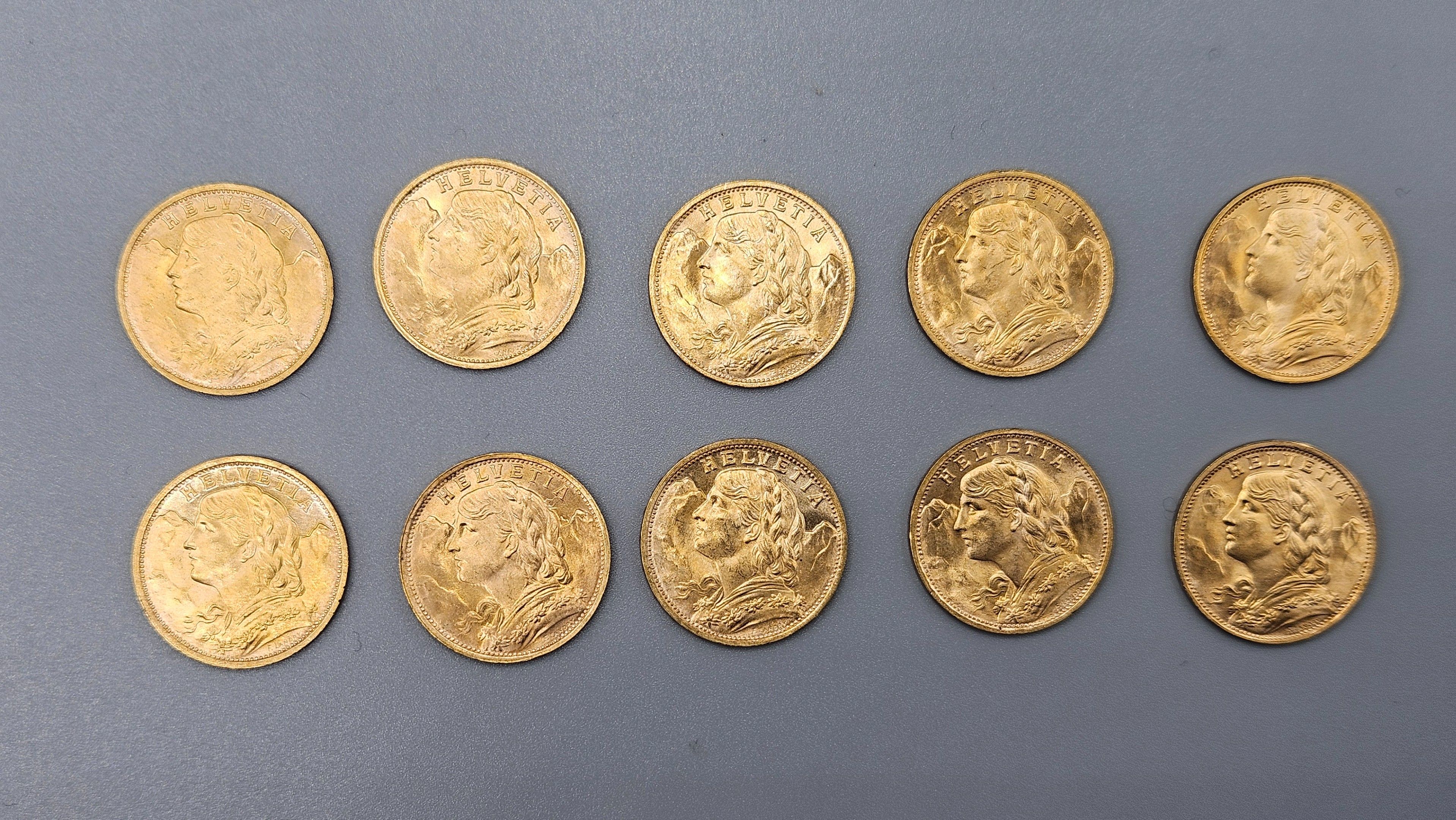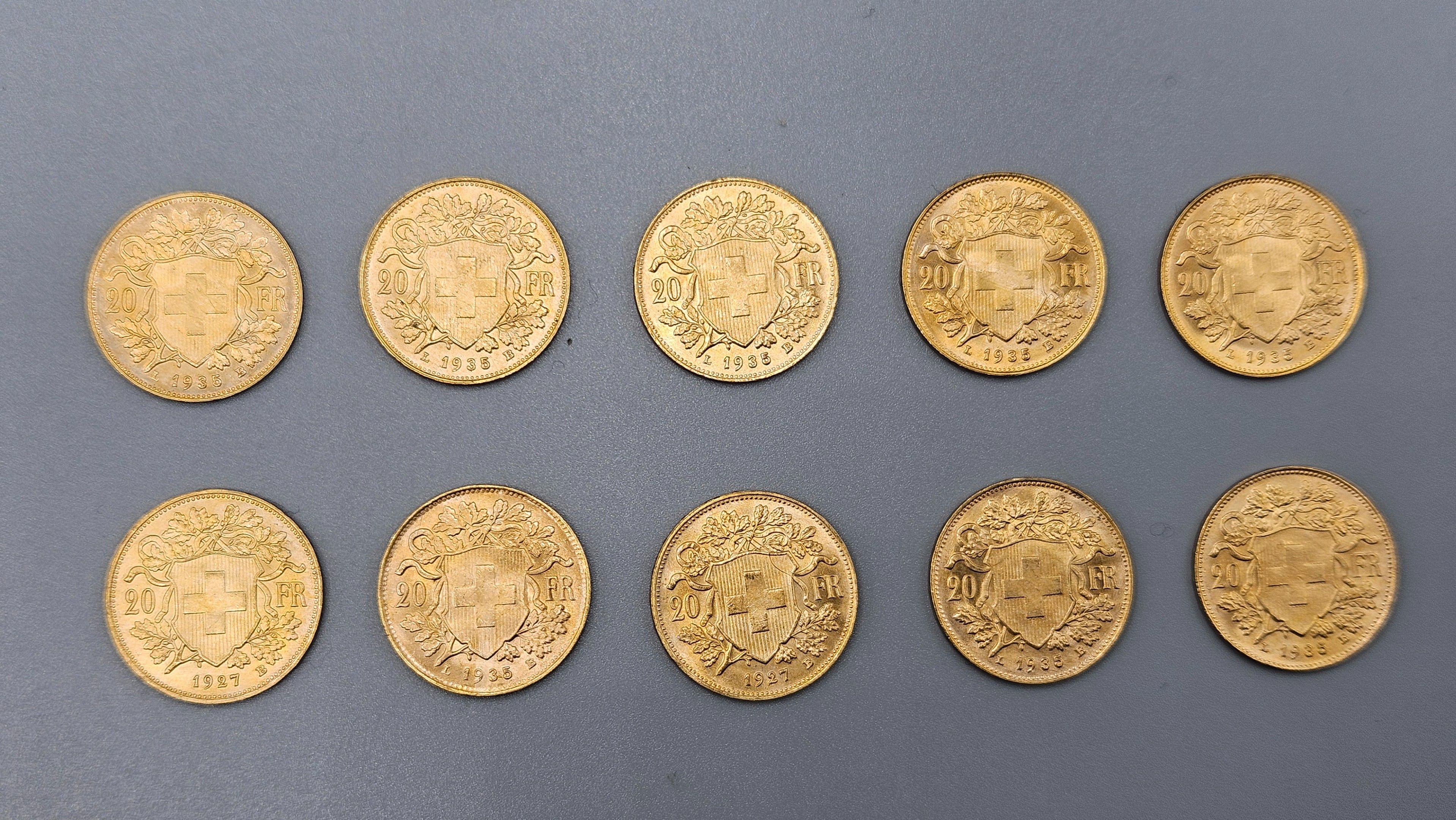 Lot of 10 pieces of 20 Frs Swiss gold used. SELLING EXPENSES 14.4 % INCL. VAT. LOT SOLD ON SIMPLE DESIGNATION, WITHOUT EXHIBITION, KEPT IN A BANK VAULT.