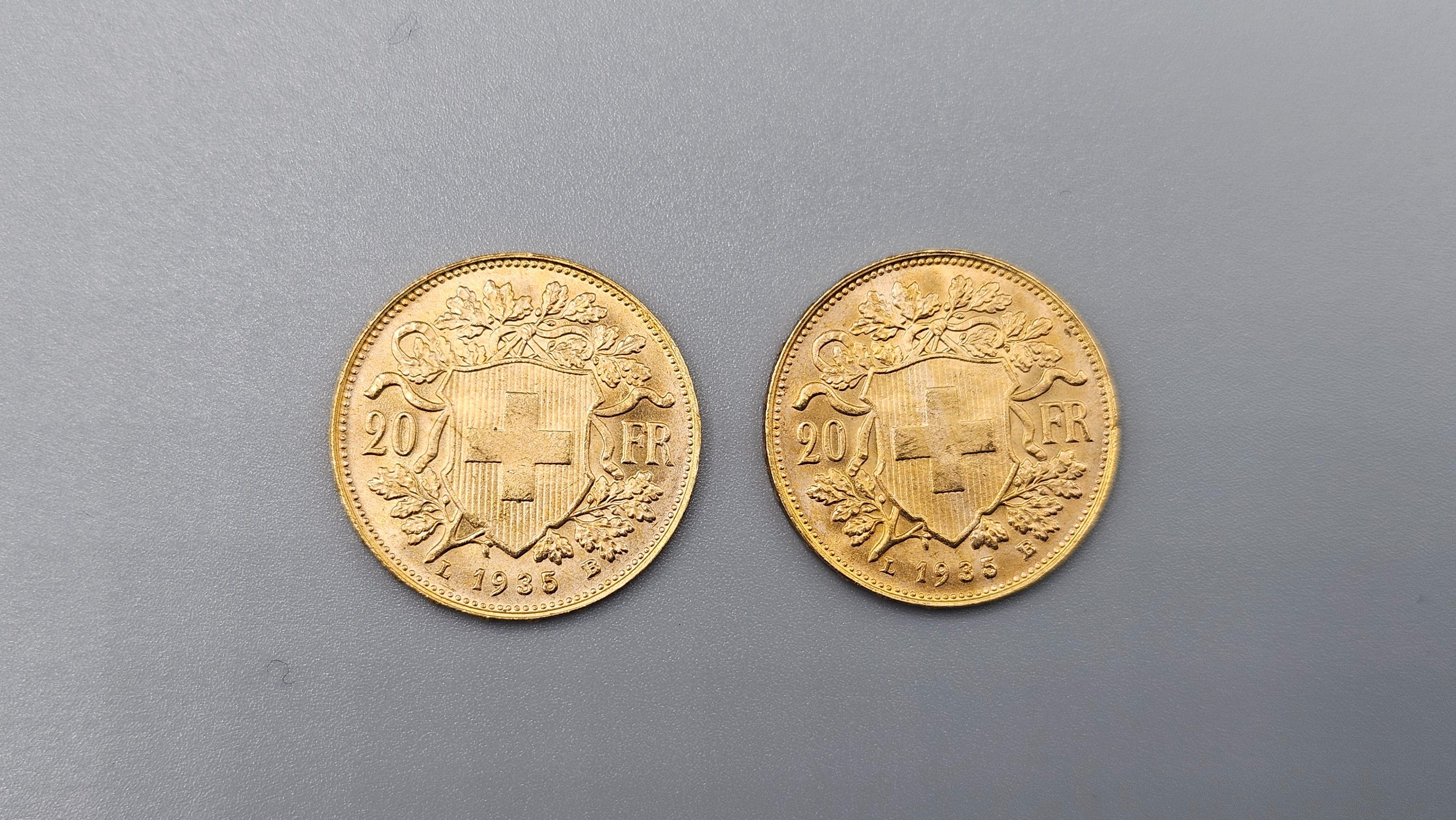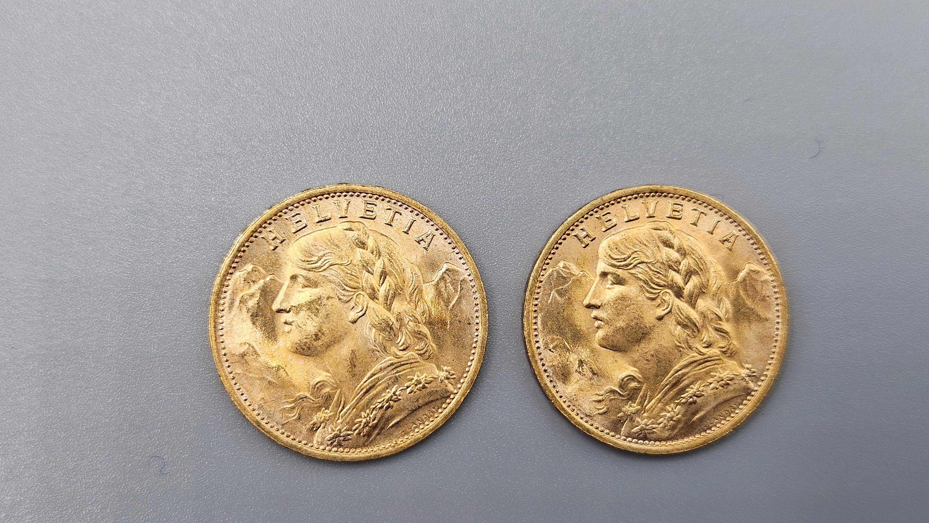 Lot of 2 used 20 Frs Swiss gold coins. SELLING EXPENSES 14.4 % INCL. VAT. LOT SOLD ON SIMPLE DESIGNATION, WITHOUT EXHIBITION, KEPT IN A BANK SAFE.