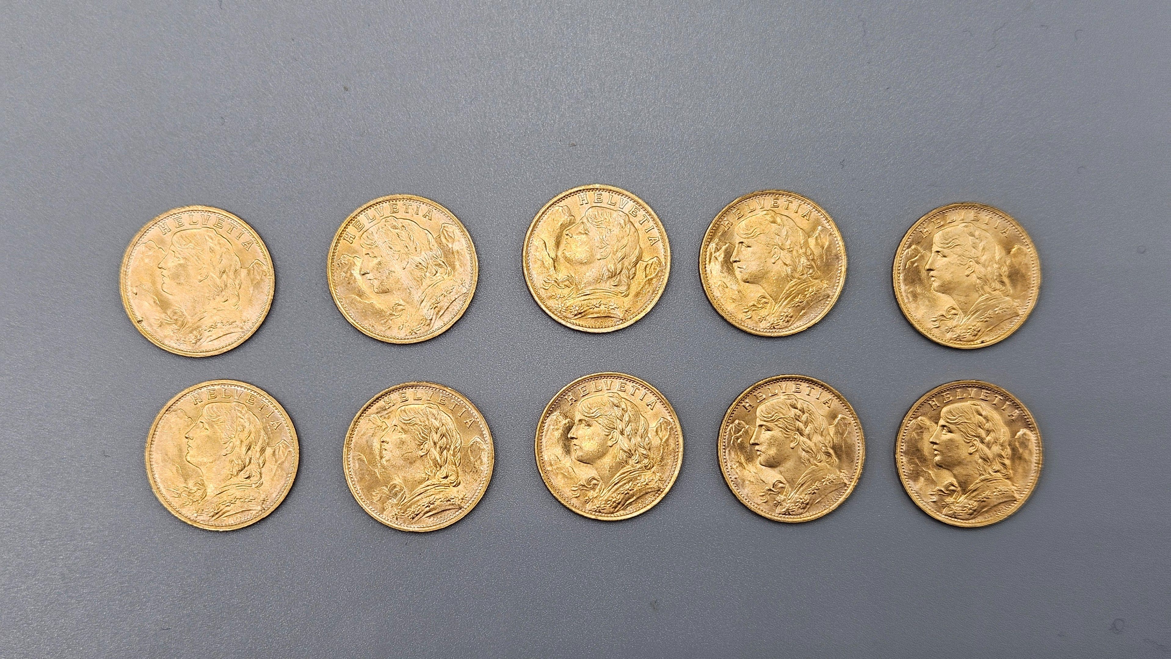 Lot of 10 Swiss gold 20 Frs coins. SELLING EXPENSES 14.4 % INCL. VAT. LOT SOLD ON SIMPLE DESIGNATION, KEPT IN A BANK VAULT