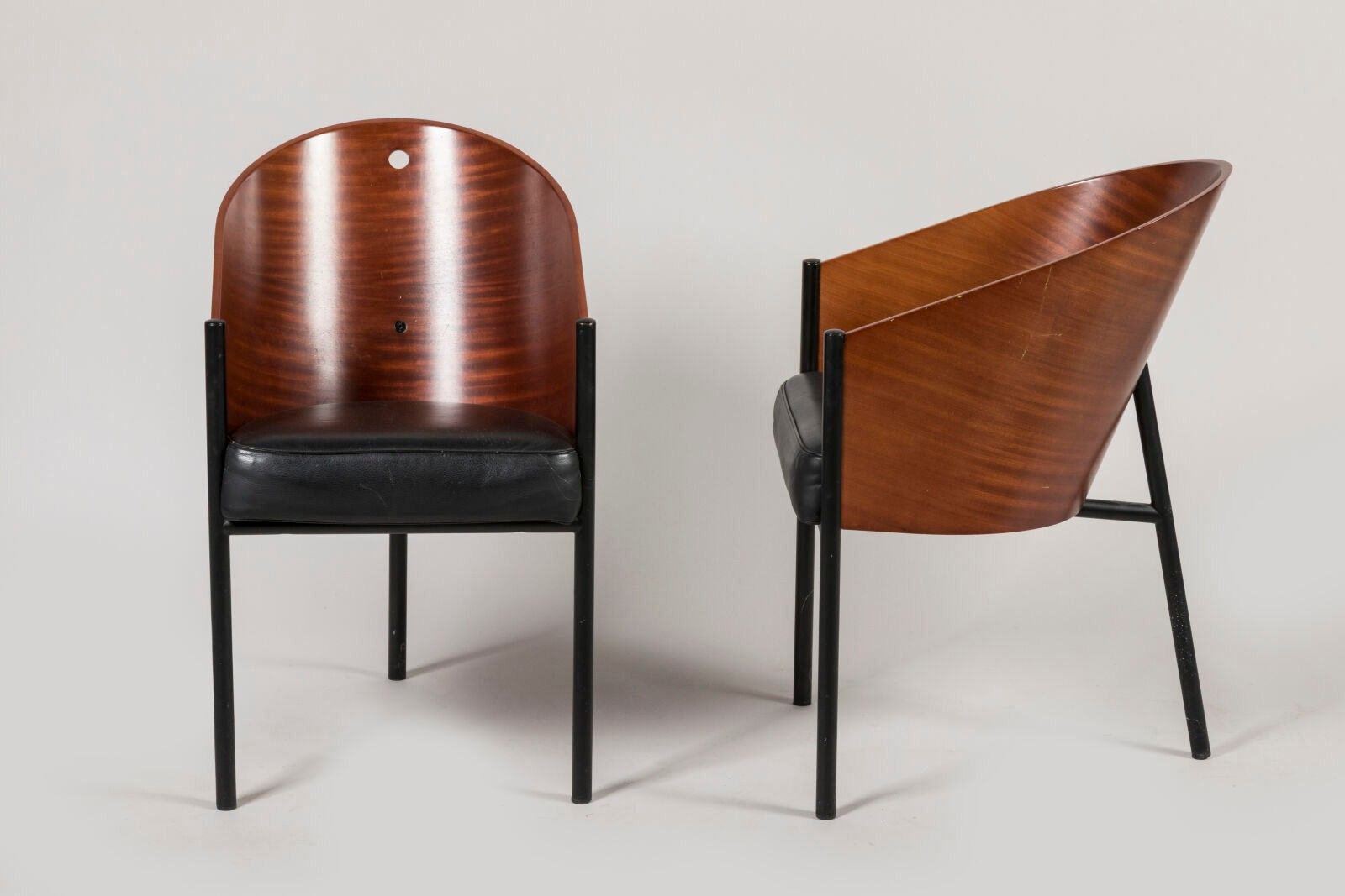 Pair of "Costes" armchairs (created in 1982) with gondola back and black lacquered tubular steel frame, black leather seat. Minor damage to the veneer.