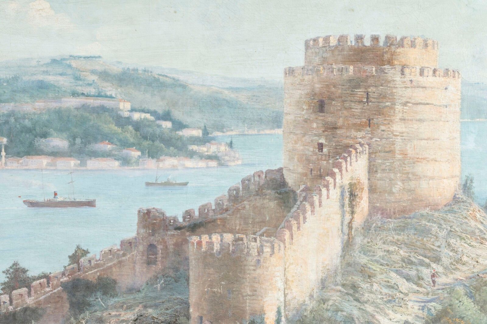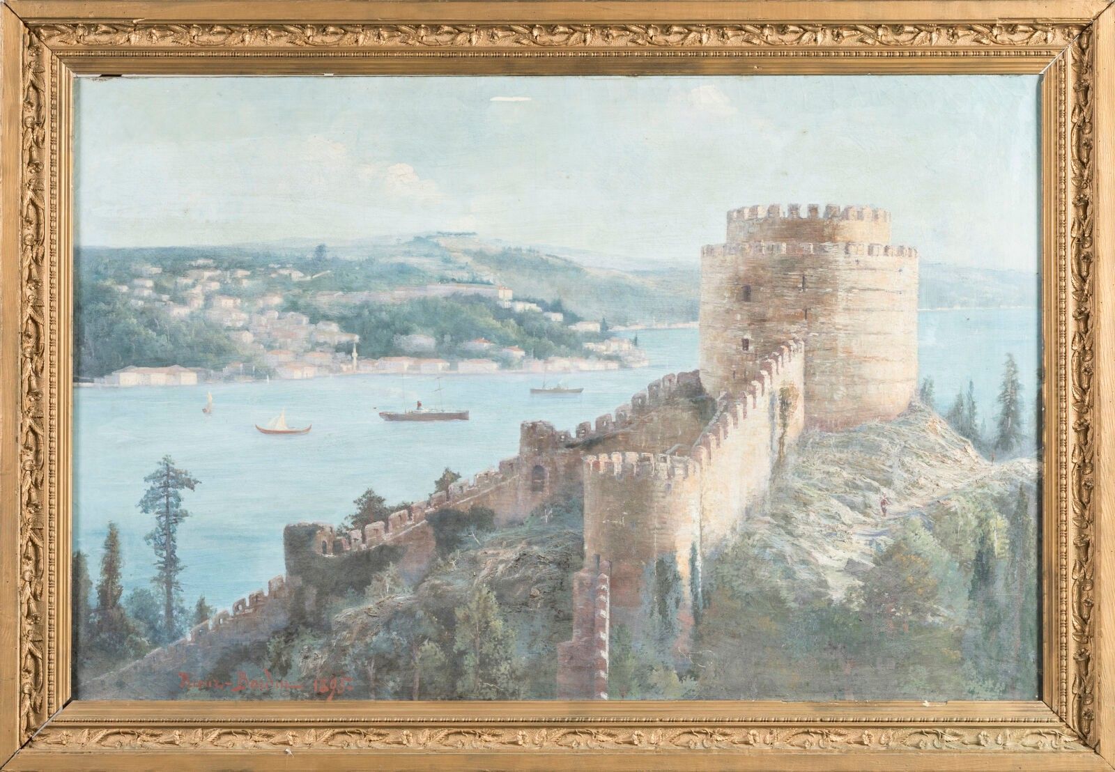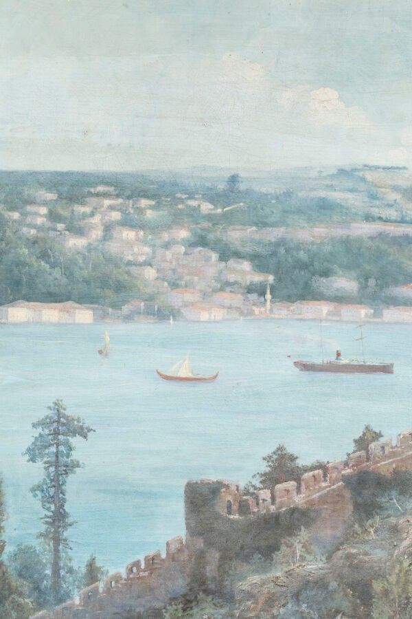 PRIEUR-BARDIN Eugène Antoine (1860-1905) "View of the Tower of Rumeli Hisar Castle", Bosphorus, Istambul. Large oil on canvas signed and dated 1895. Framed. 83.5 x 130 cm. Cracks and small stains. Damage to the frame.