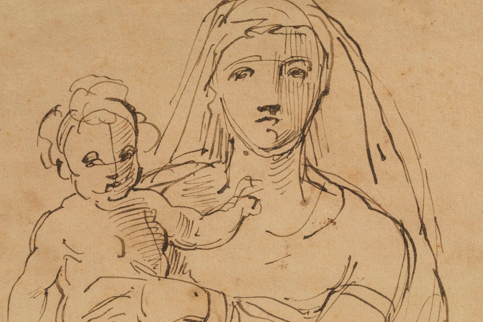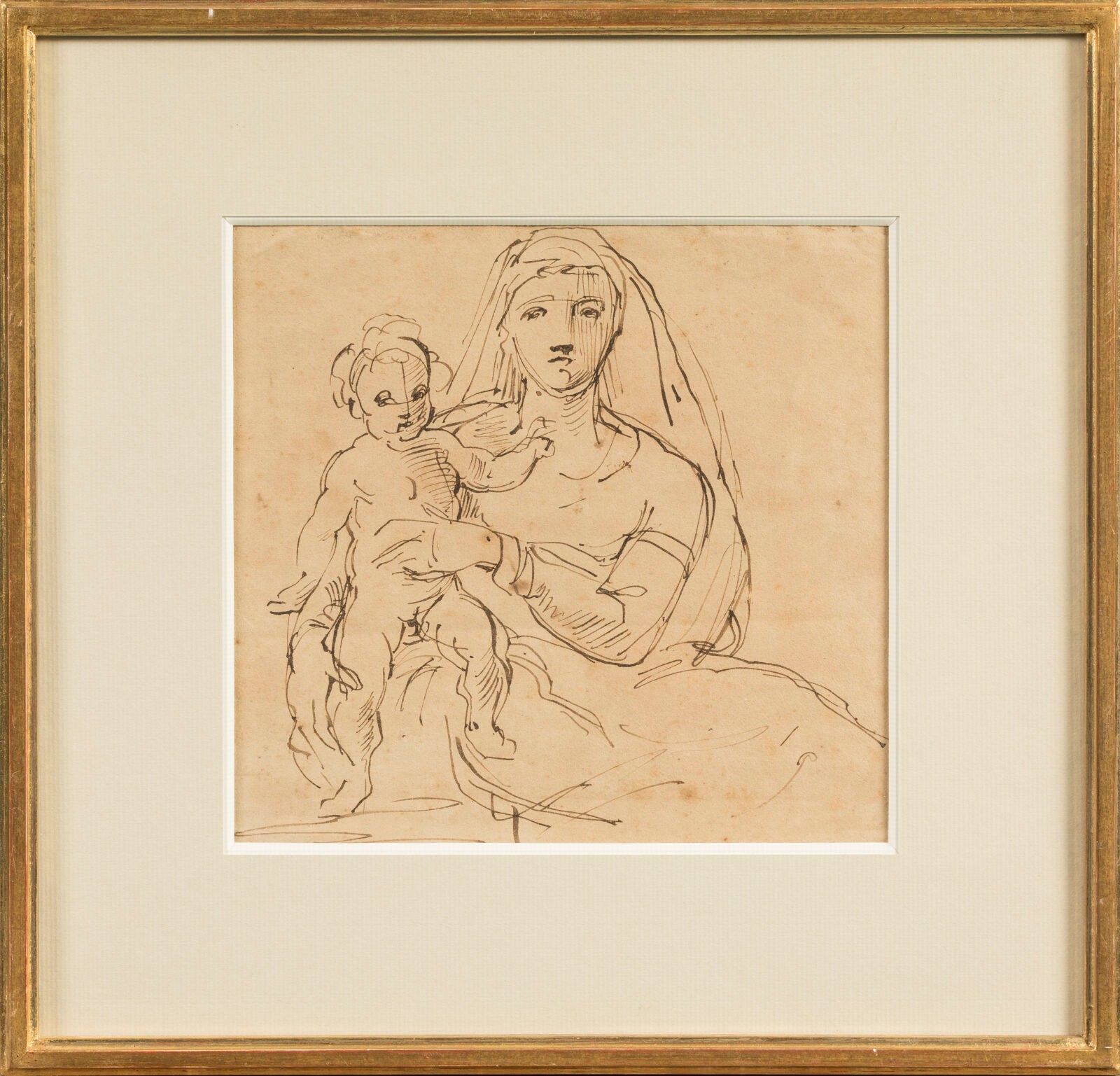 Italian school of the XVIIIth century. "Madonna and Child". Ink drawing on paper. Marked Canova on the back. Framed. 19.5 x 20 cm