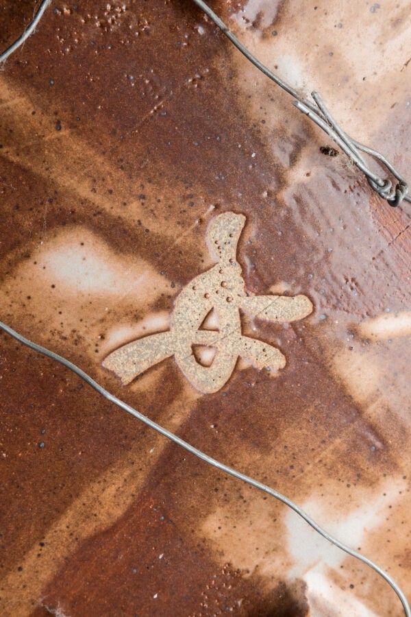 DUBUC Philippe (1947) Large wall dish in orange glazed stoneware, a painter's ceramic with abstract decoration. H.57 x L. 57 cm. Stamped.