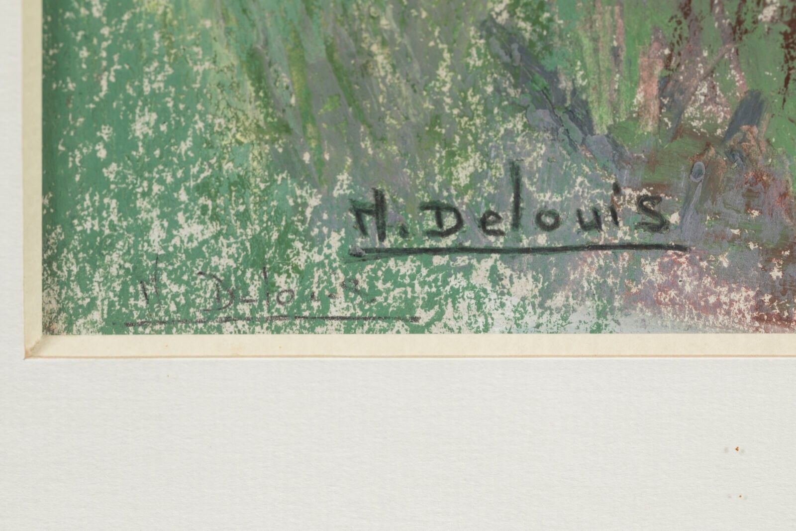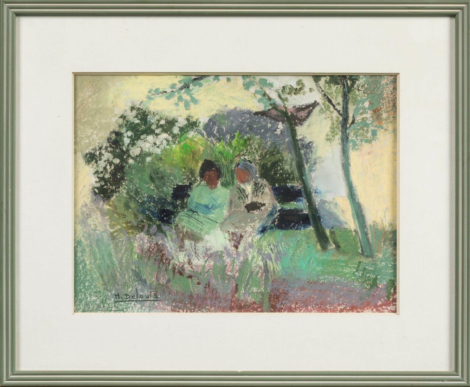 DELOUIS Nancy (1941), "Conversation in a garden". Pastel drawing on paper signed at the bottom. Size: 27.5 x 38 cm