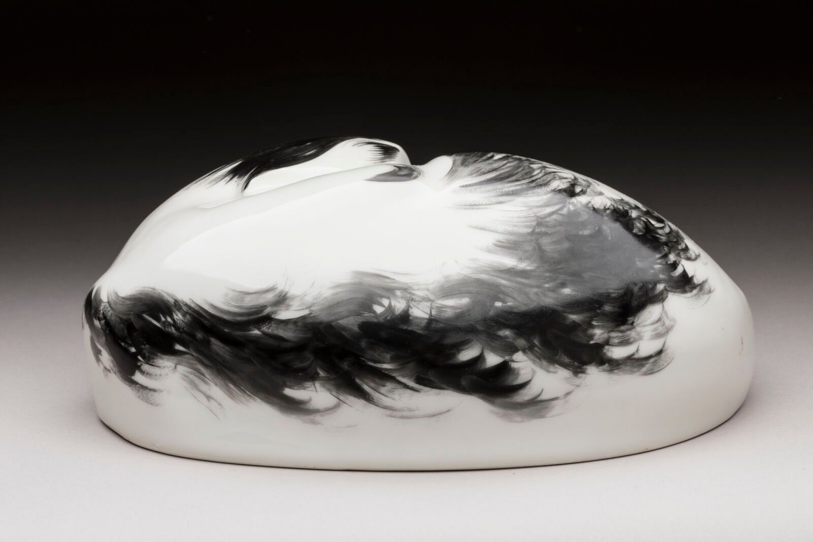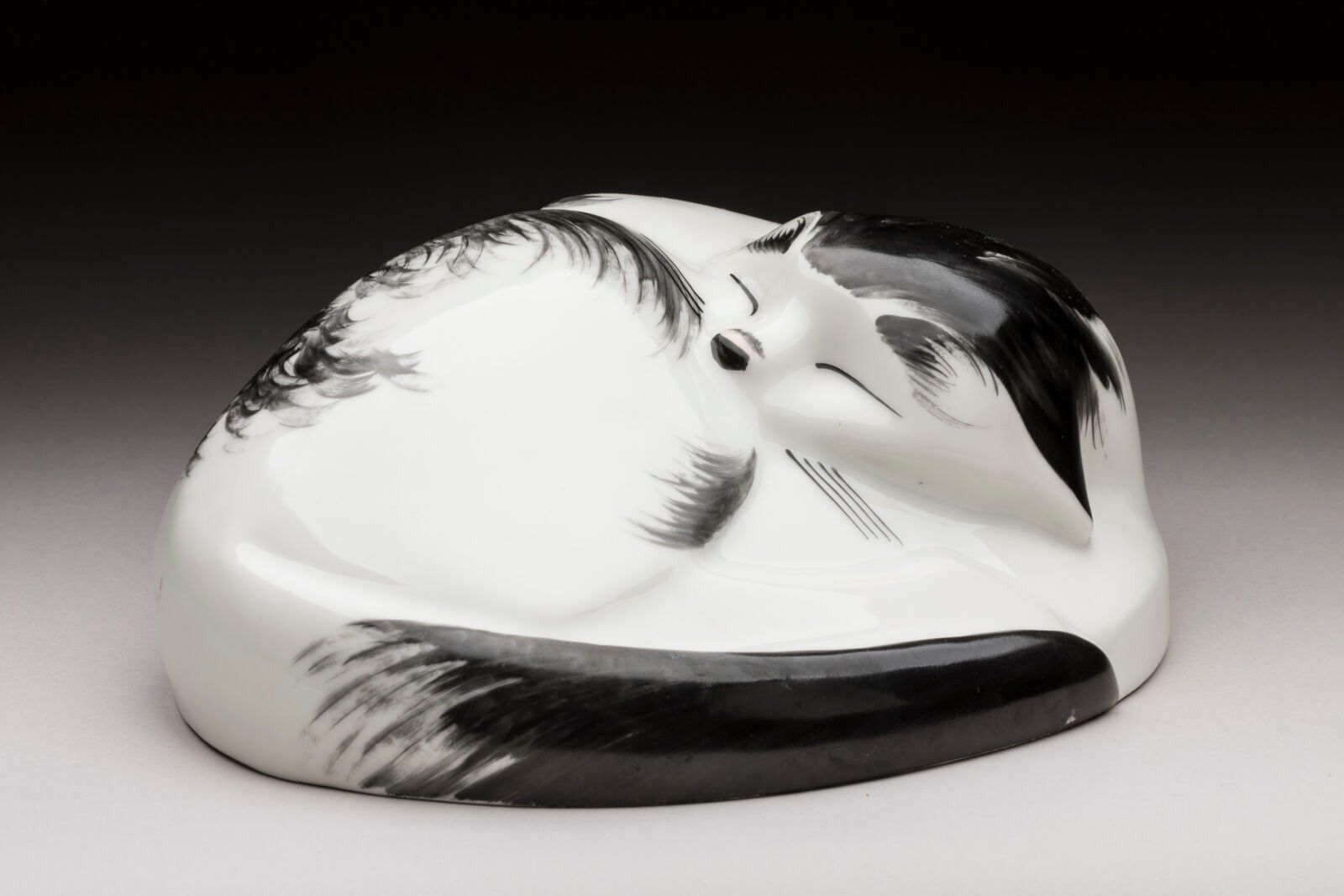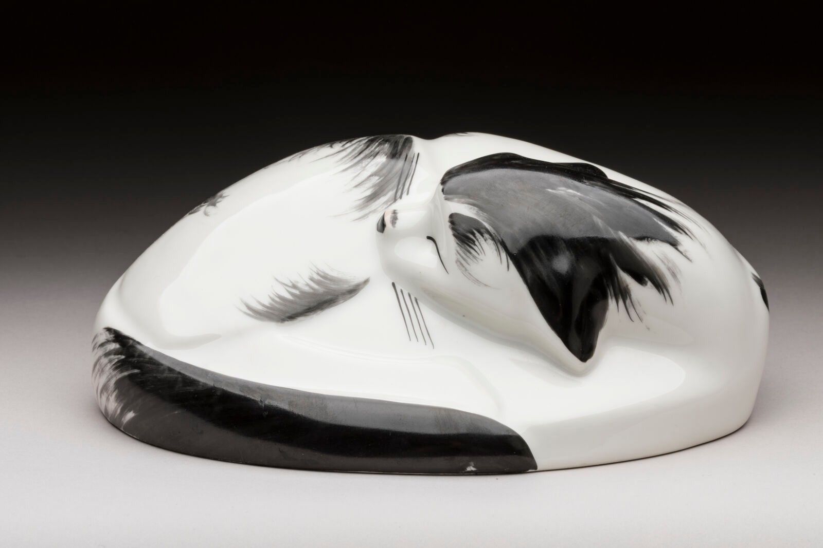 LIMOGES. SANDOZ Edouard-Marcel (1881-1971) for Théodore HAVILAND from 1920. Porcelain cat warmer, black and white colours, Théodore Haviland mark in red and Sandoz signature. Late print. H. 9,5 x 21 cm.