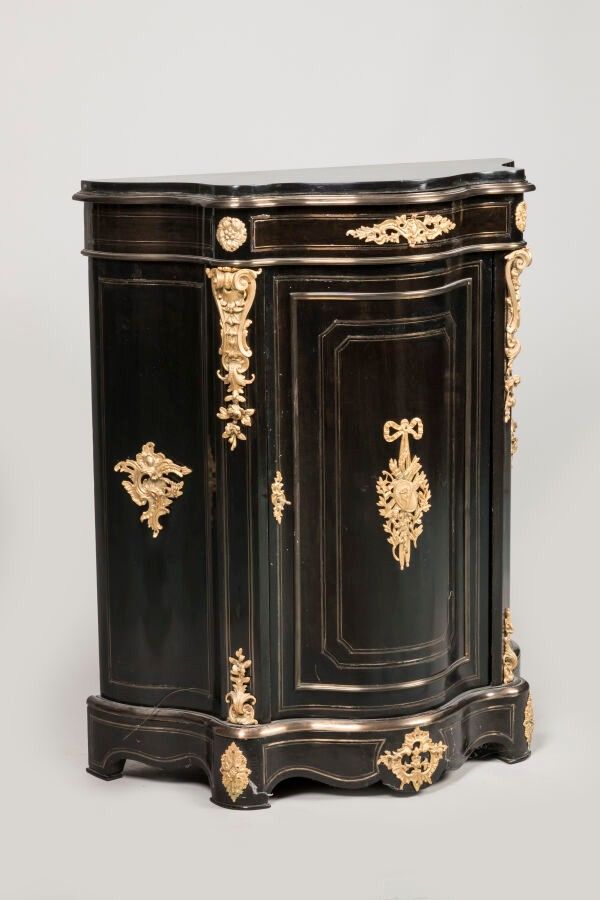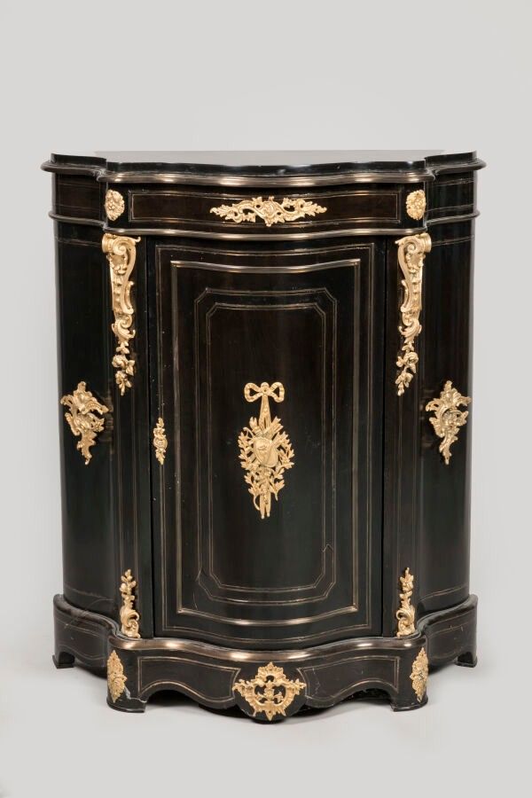 Blackened wood and marquetry sideboard, curved on all sides, opening on one leaf. Bronzes decorated with ribbons and attributes. Marble top. 90 x 109 cm. Minor damage to the veneer.