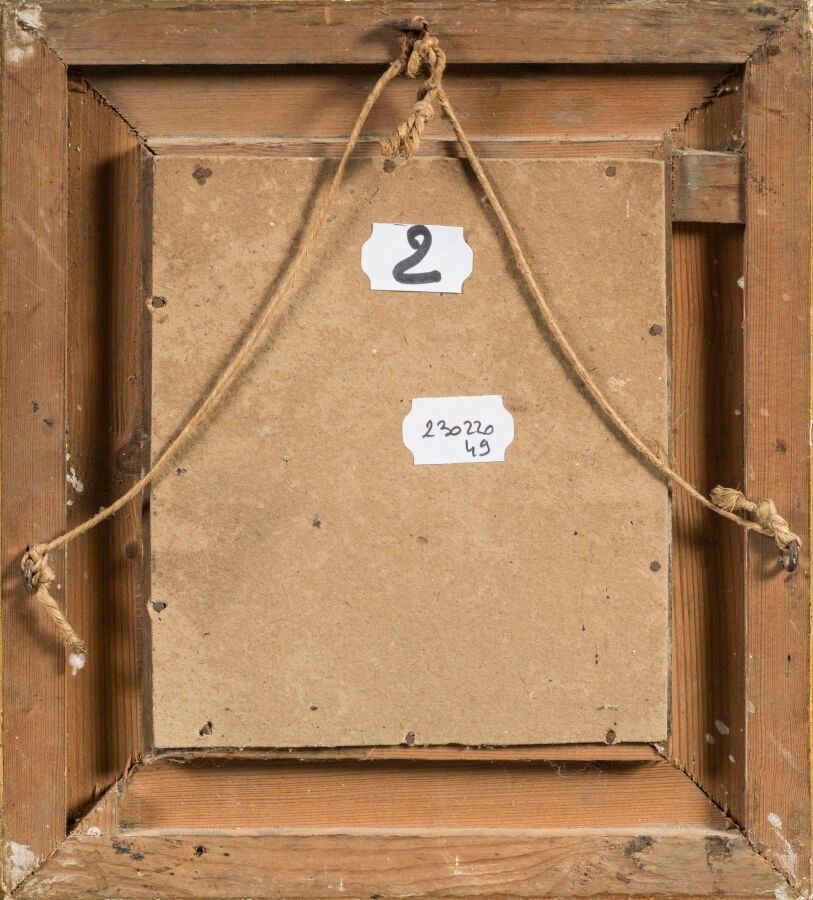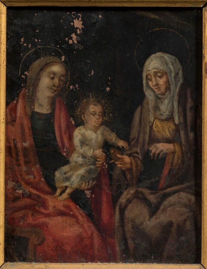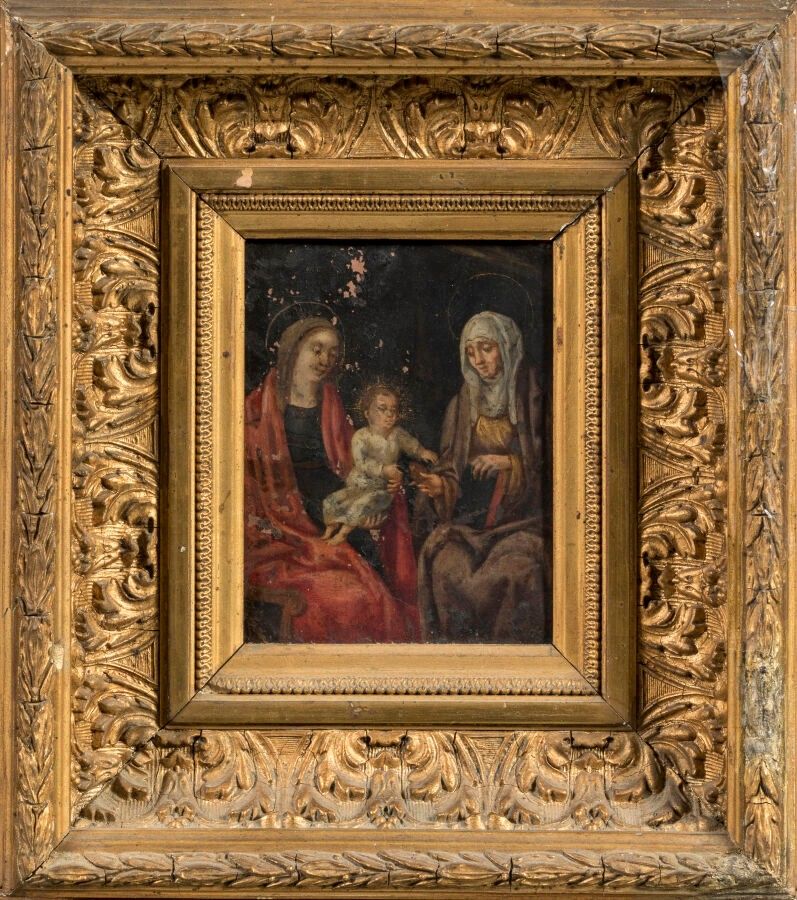 Northern school end of XVIIth century. "The Virgin, Mary Magdalene and Jesus". Oil on copper, framed (accidents). 12 x 9 cm. Minor damages and restorations.