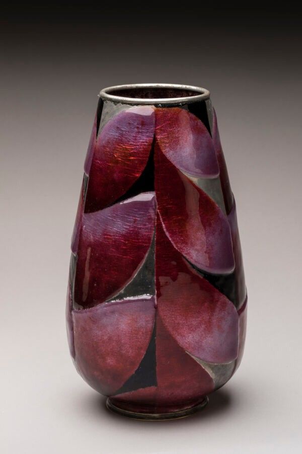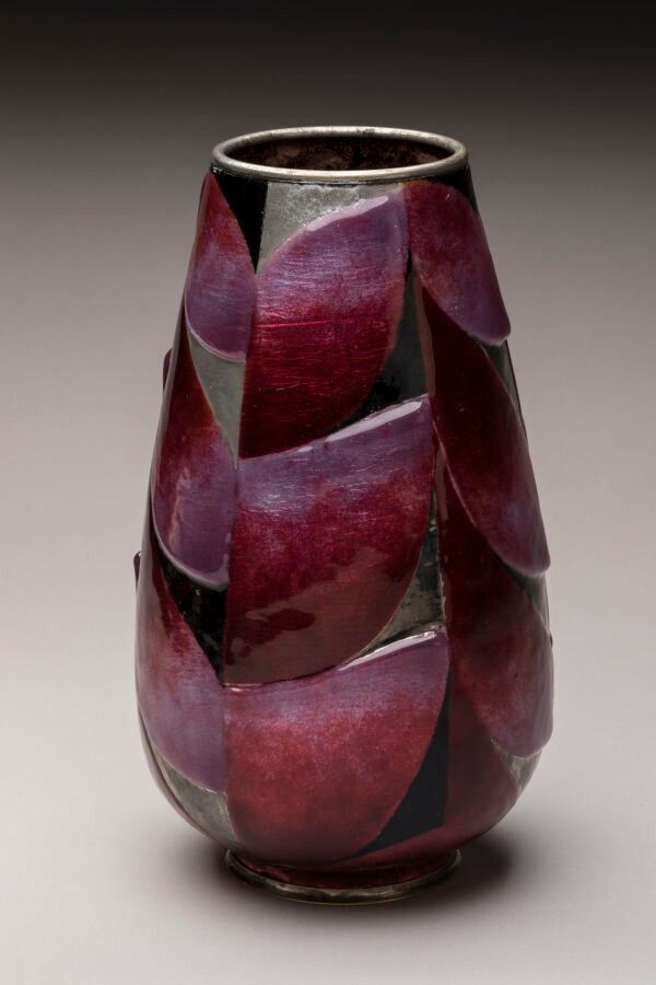 SARLANDIE Jules (1874-1936) in Limoges. Polychrome enamel vase on silver paillon. Abstract geometric design in relief. Signature at the bottom of the body. Height 24 cm. Art Deco period. Damage to the base and numerous restorations.