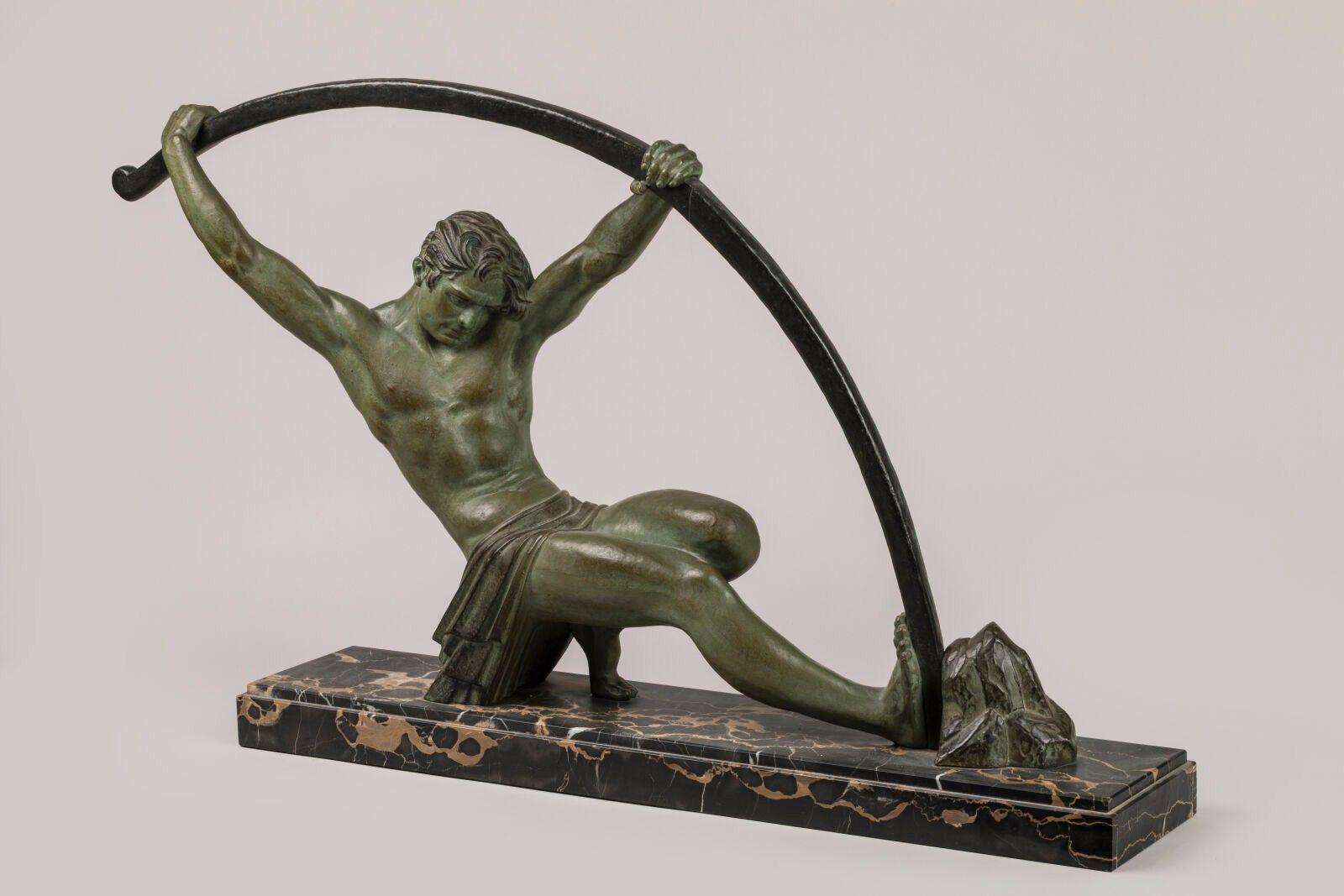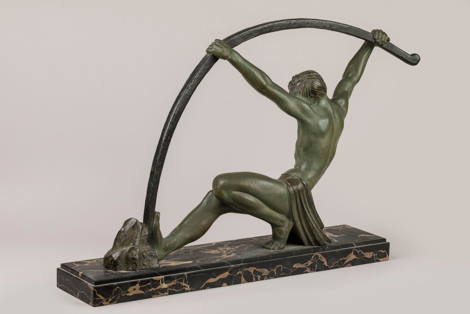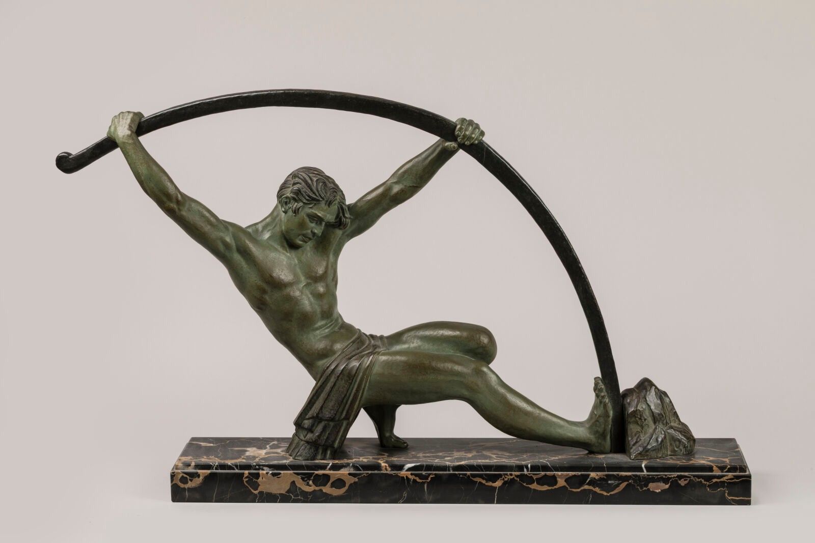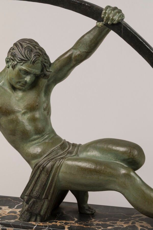Sculpture in regula with green patina, the terrace in black veined marble. Signed on the terrace.