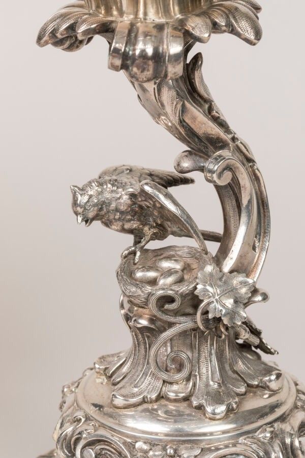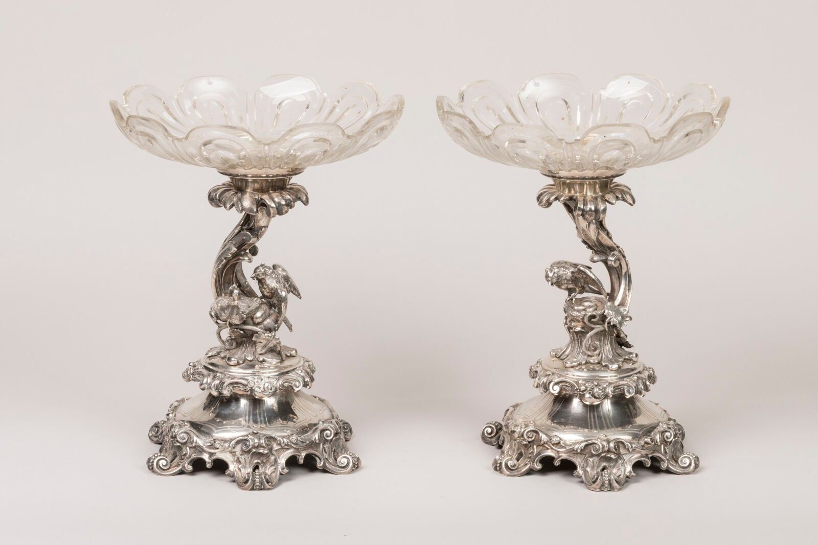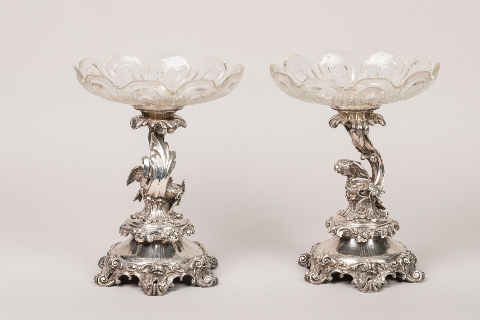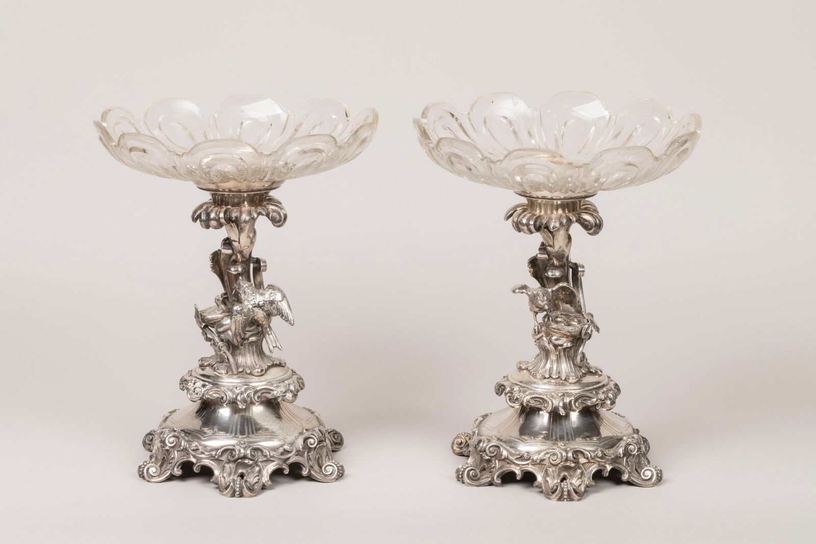 Pair of silver-plated metal centrepieces decorated with birds feeding their young in a nest. Cut glass top. Rocaille decoration of plants on the foot. Total height 32 and diameter 25 cm. From the Continental Hotel in Constantinople. Late 19th century. Scratches to the glass.