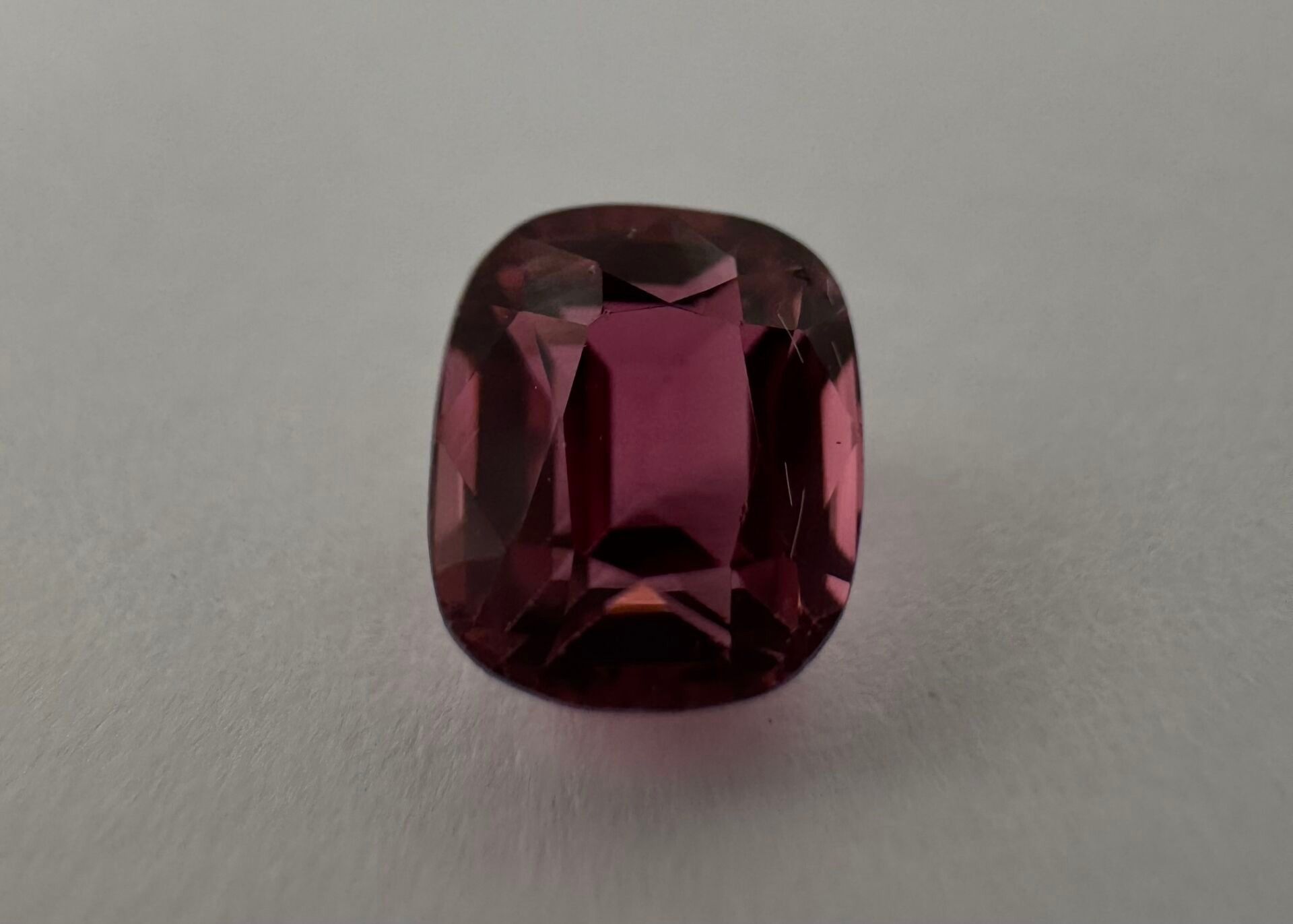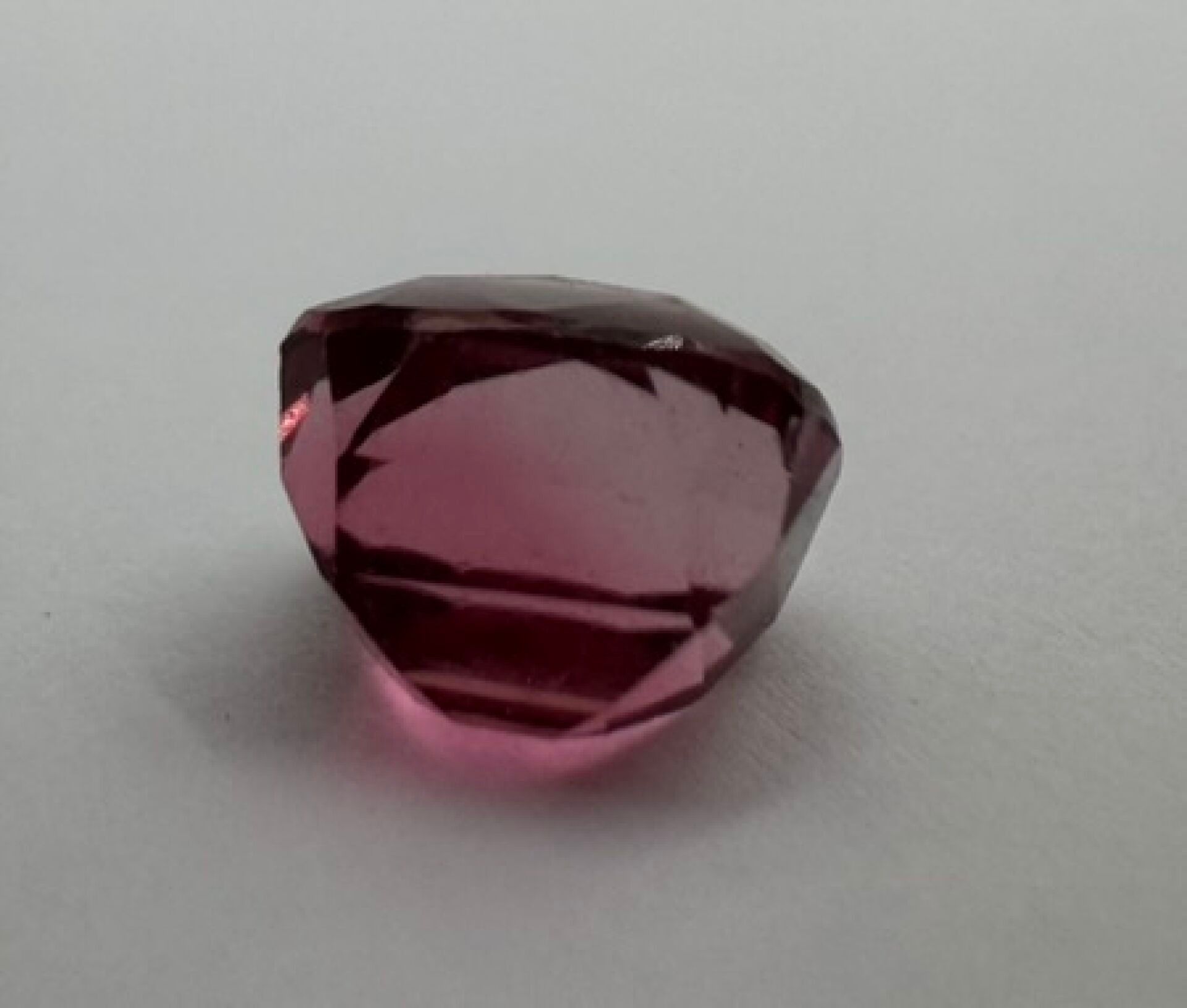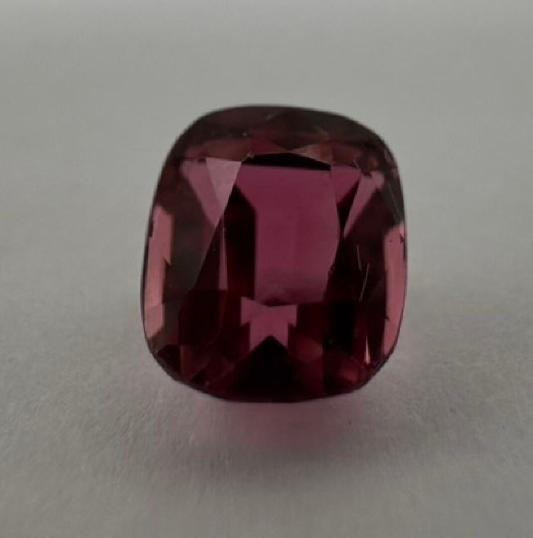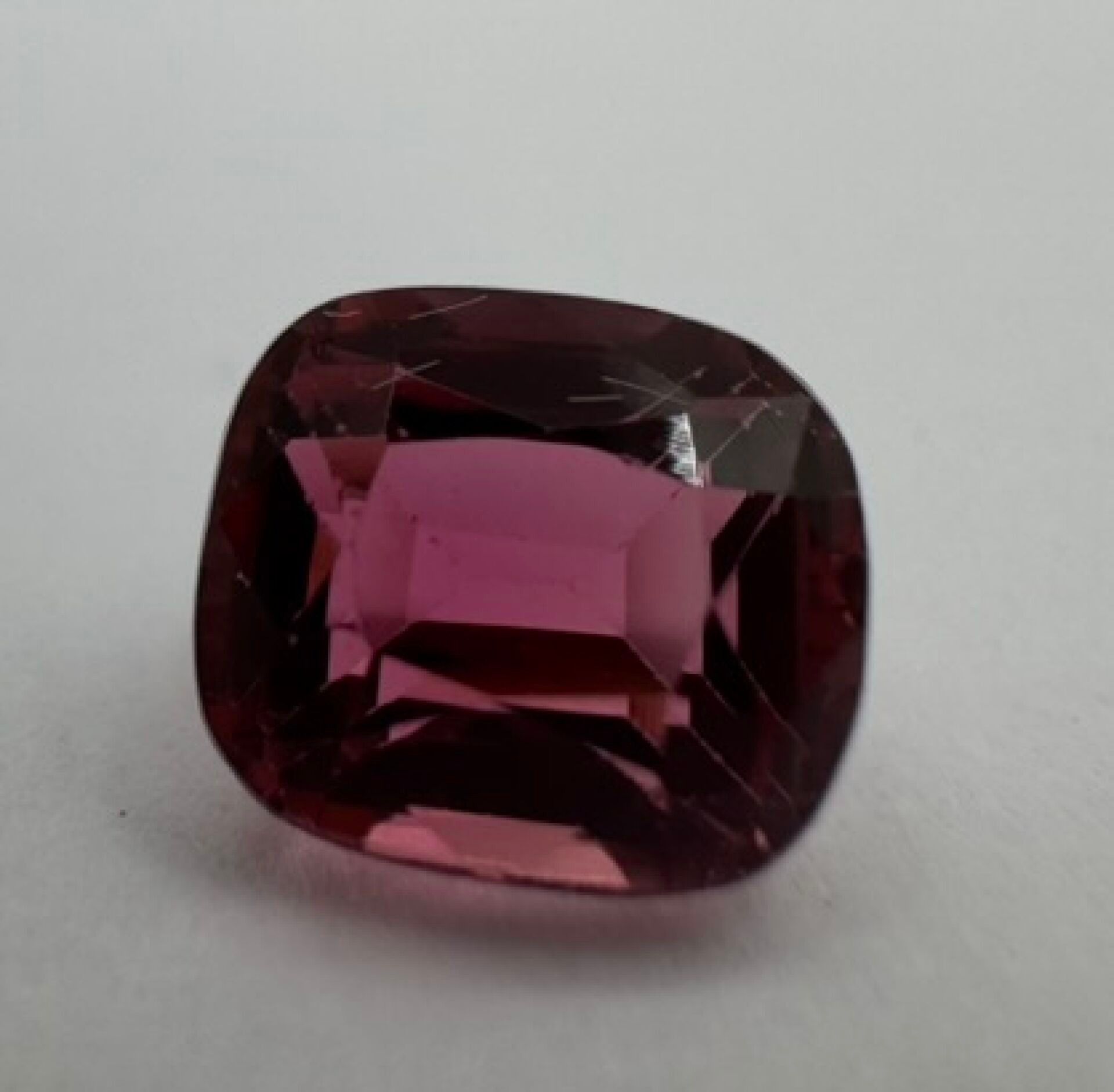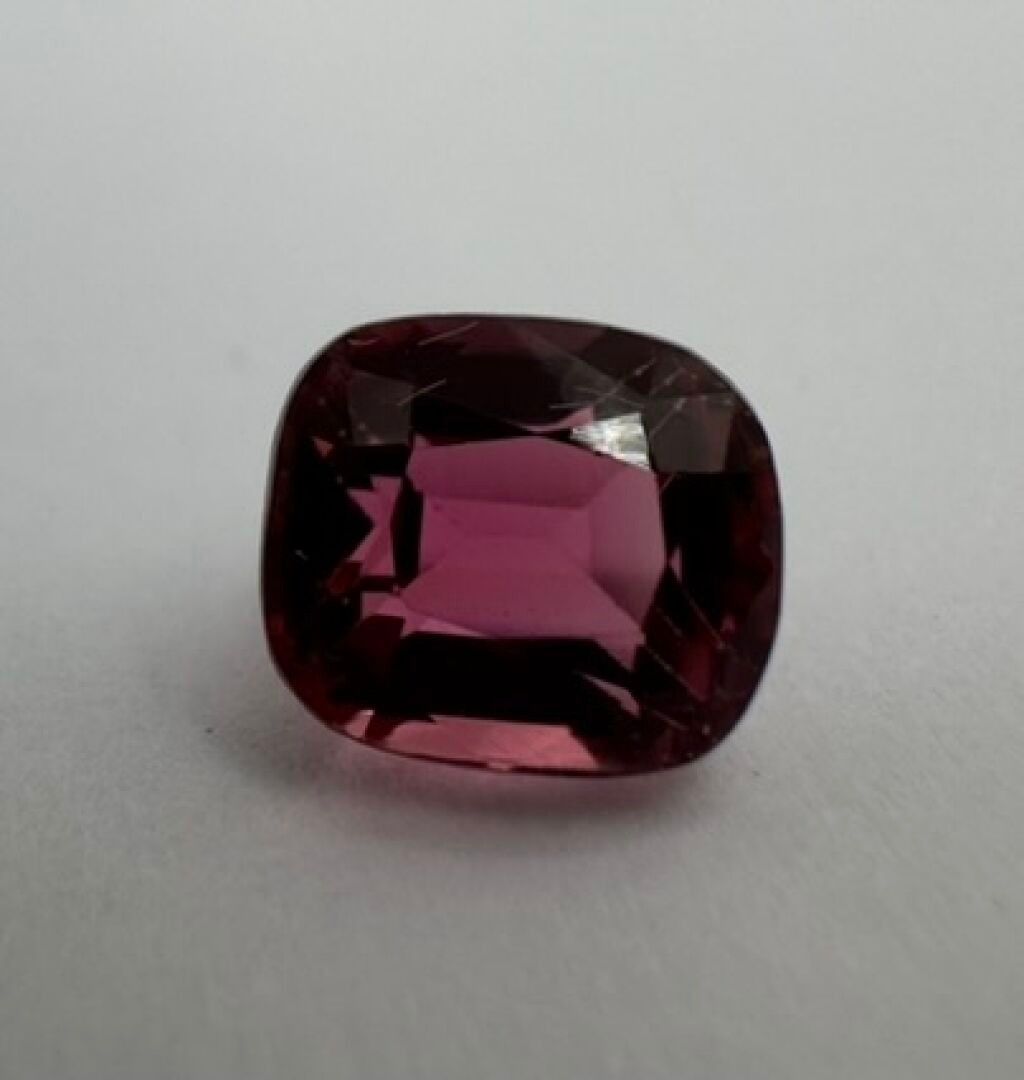 Intense pink cushion-cut tourmaline, on paper, weighing 1.74 carats.
