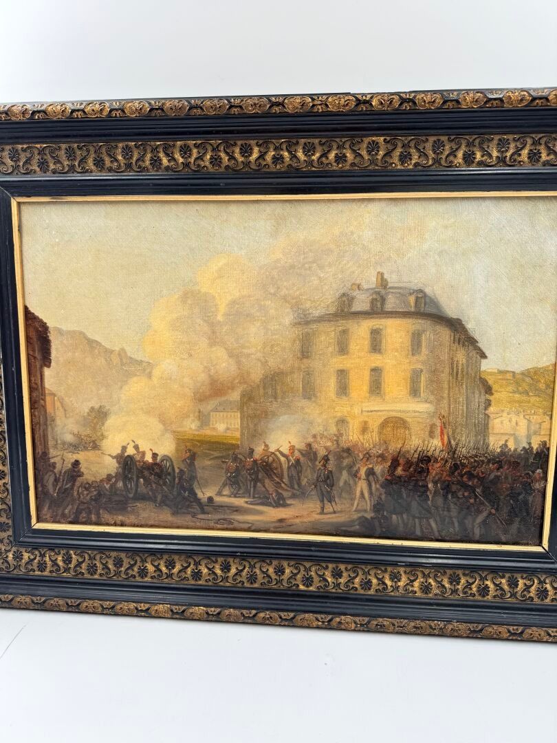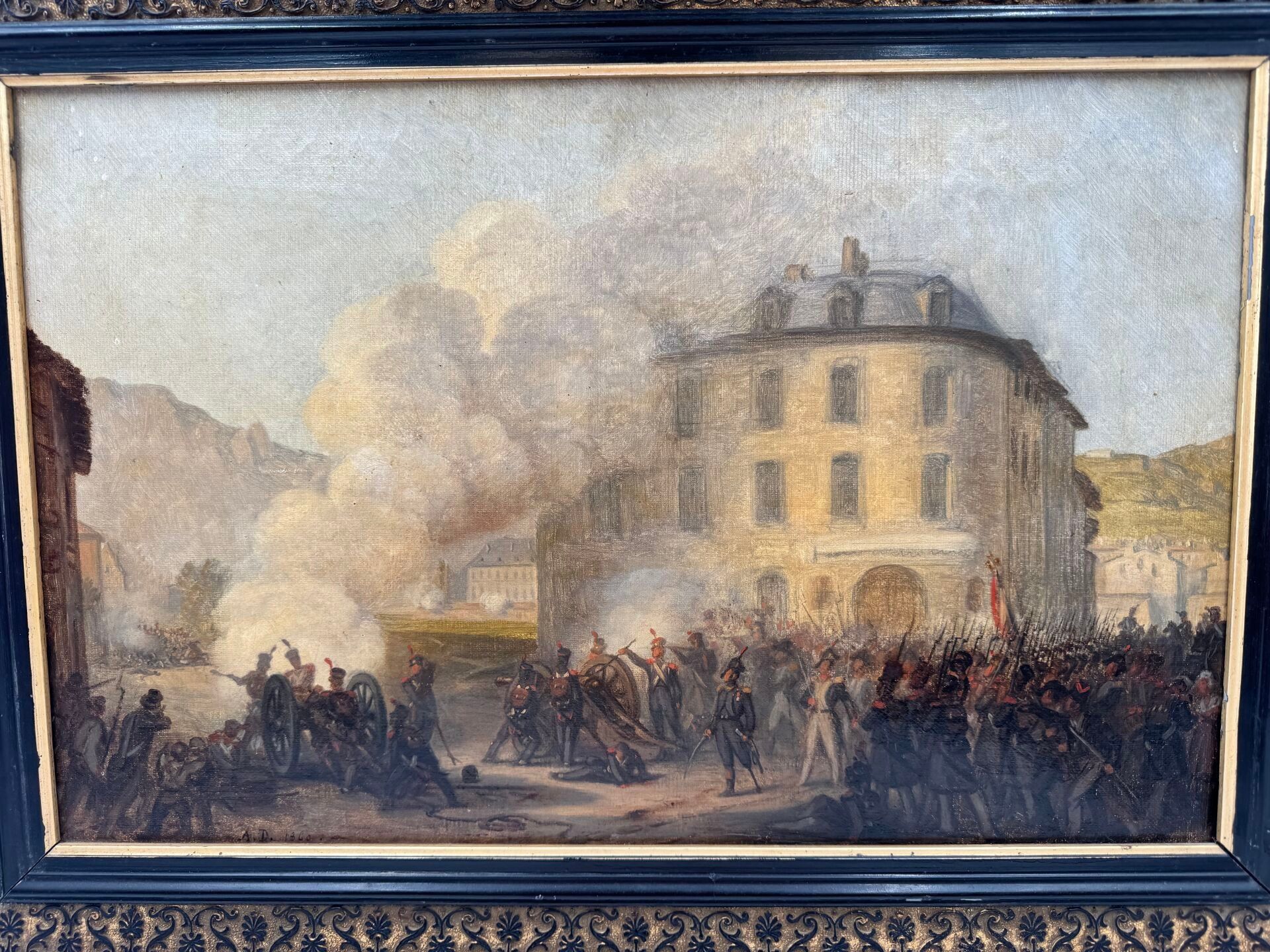 The fighting took place at the crossroads of rue du Chemin-Neuf and rue Très-Cloîtres, with the Bastille on the right and the summit of Mucherotte on the left. In the painting in the Musée de Grenoble, the church of Saint Joseph is clearly visible in the background on the left.