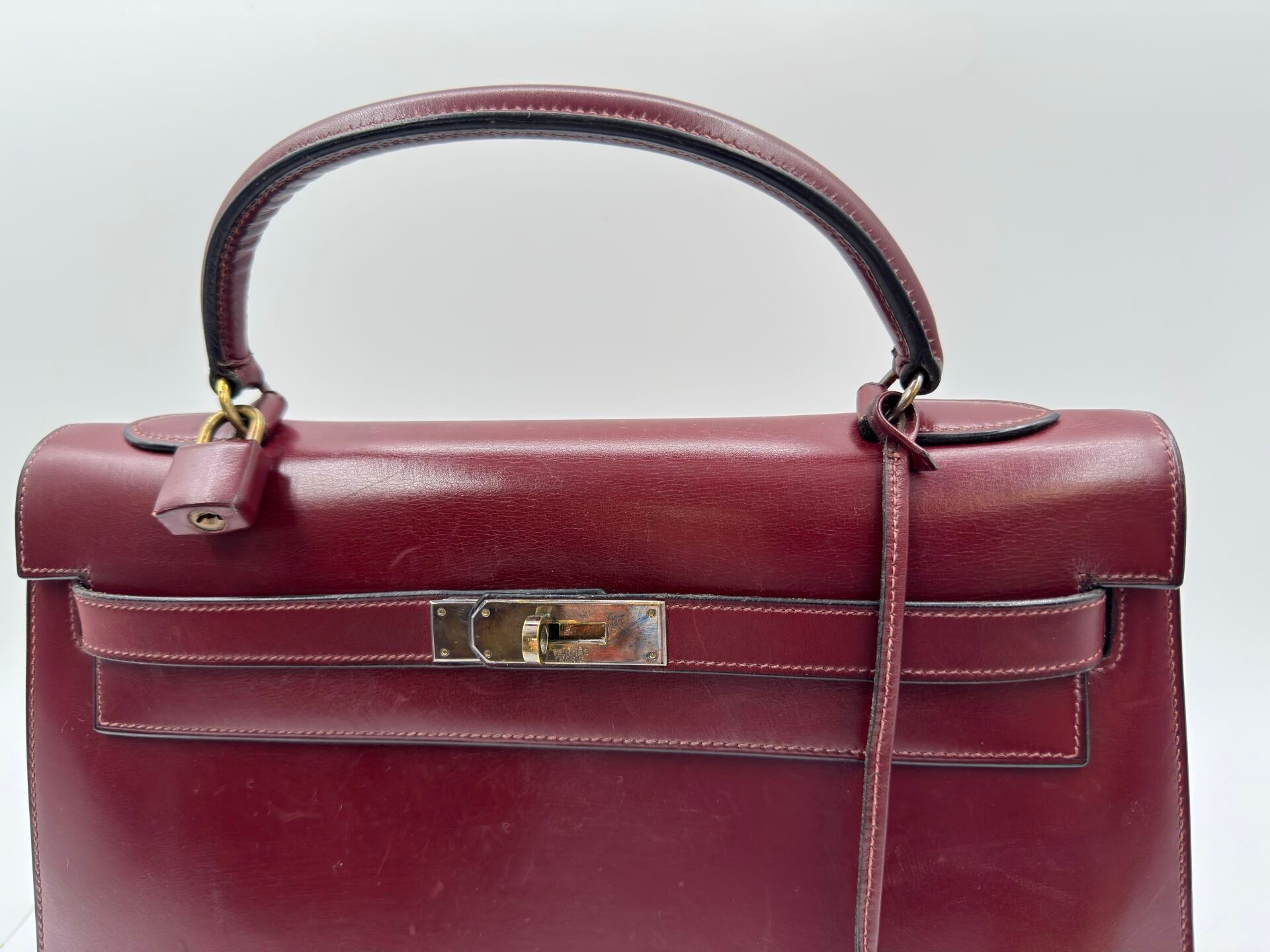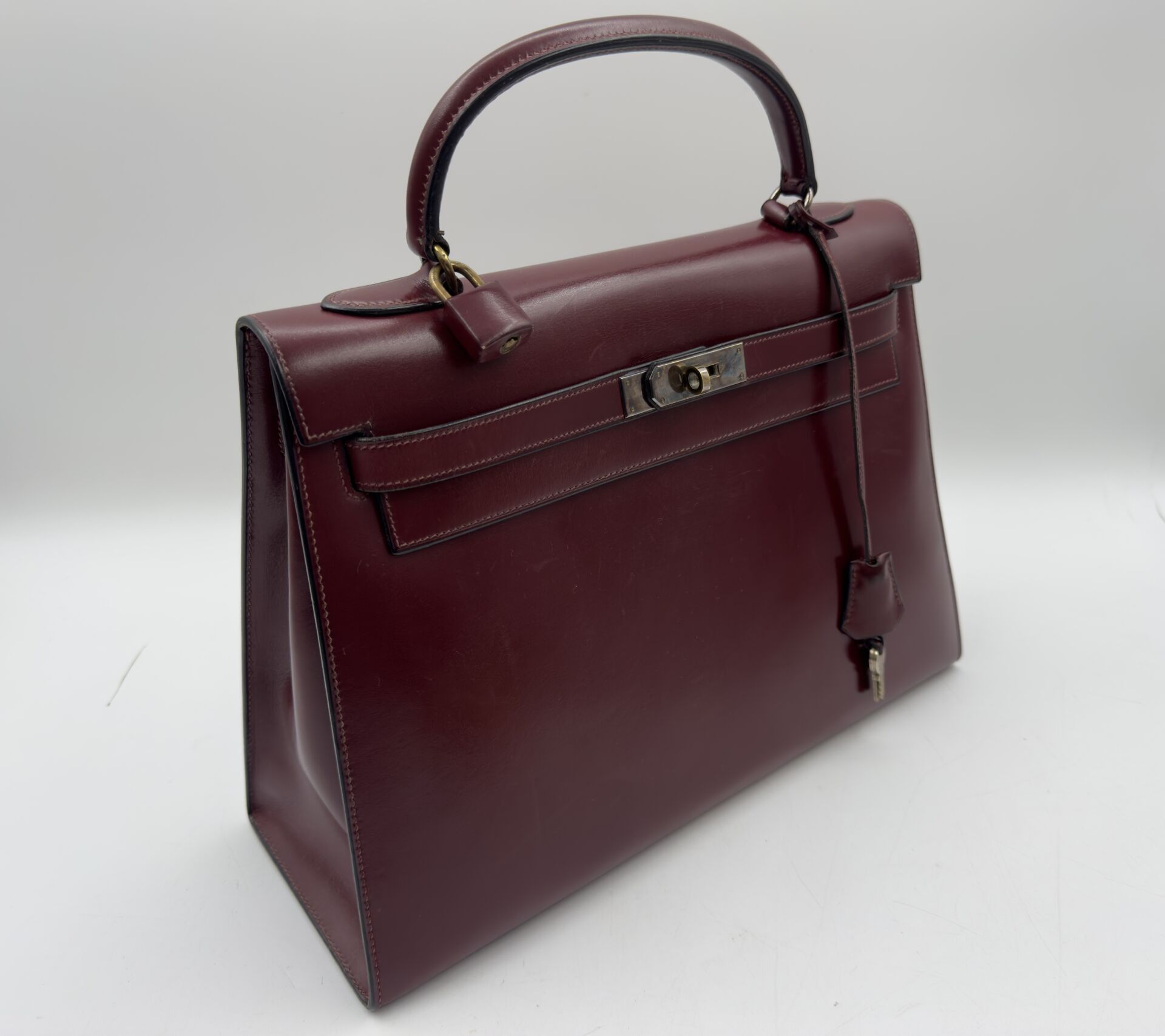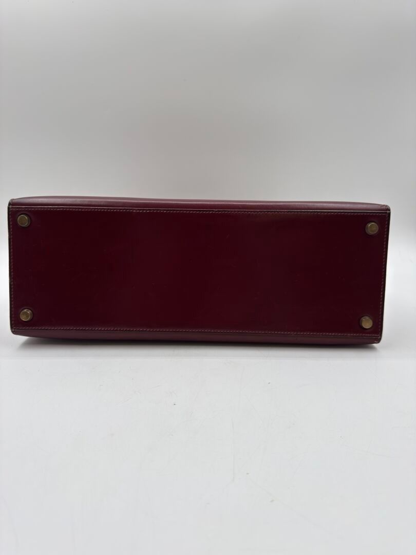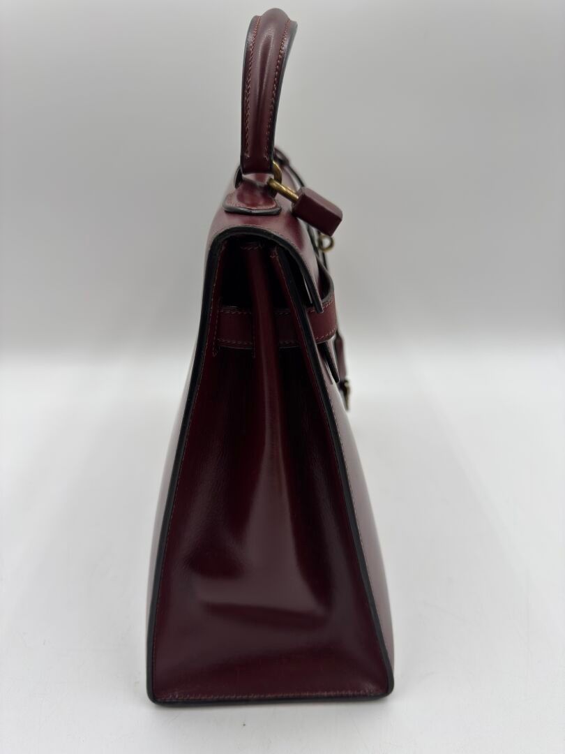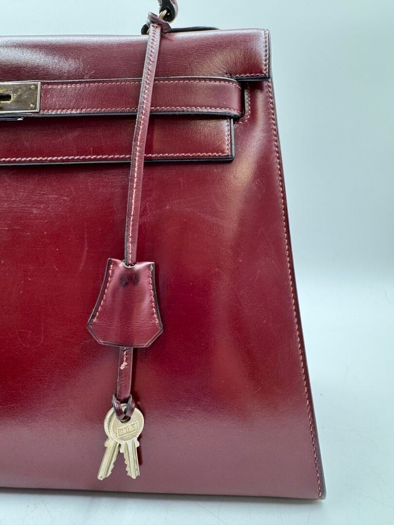 Kelly 32 bag in burgundy box, gilded metal jewellery, handle, 2 keys under bell, padlock.