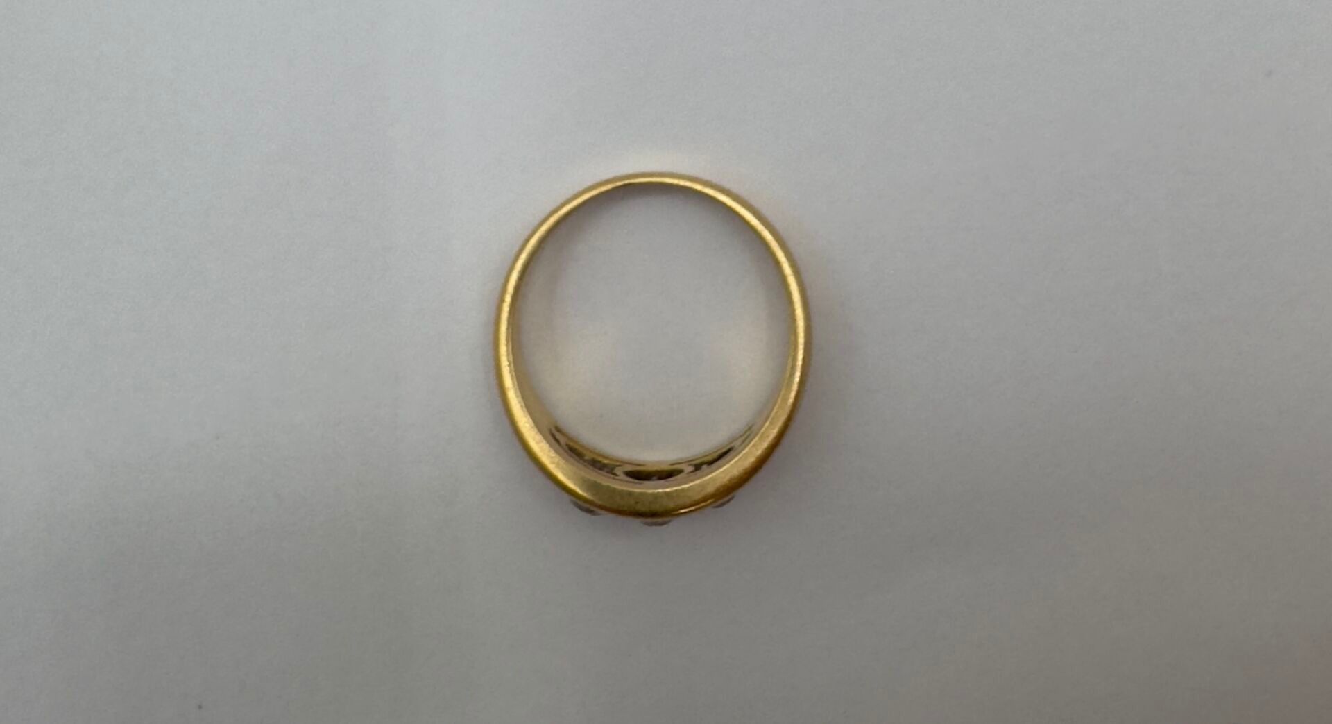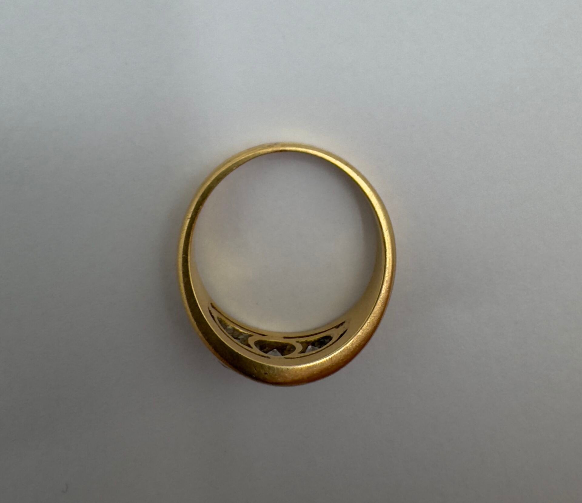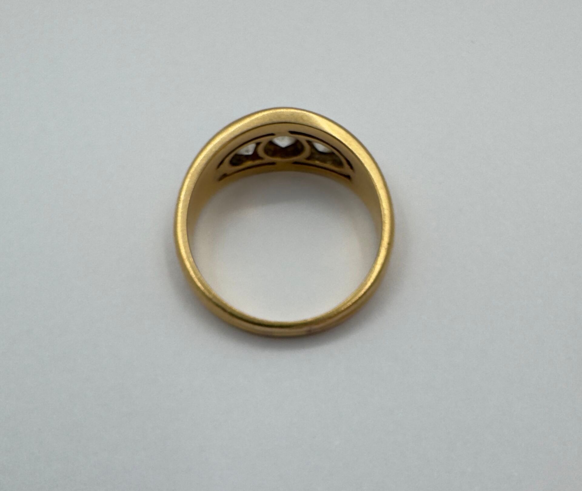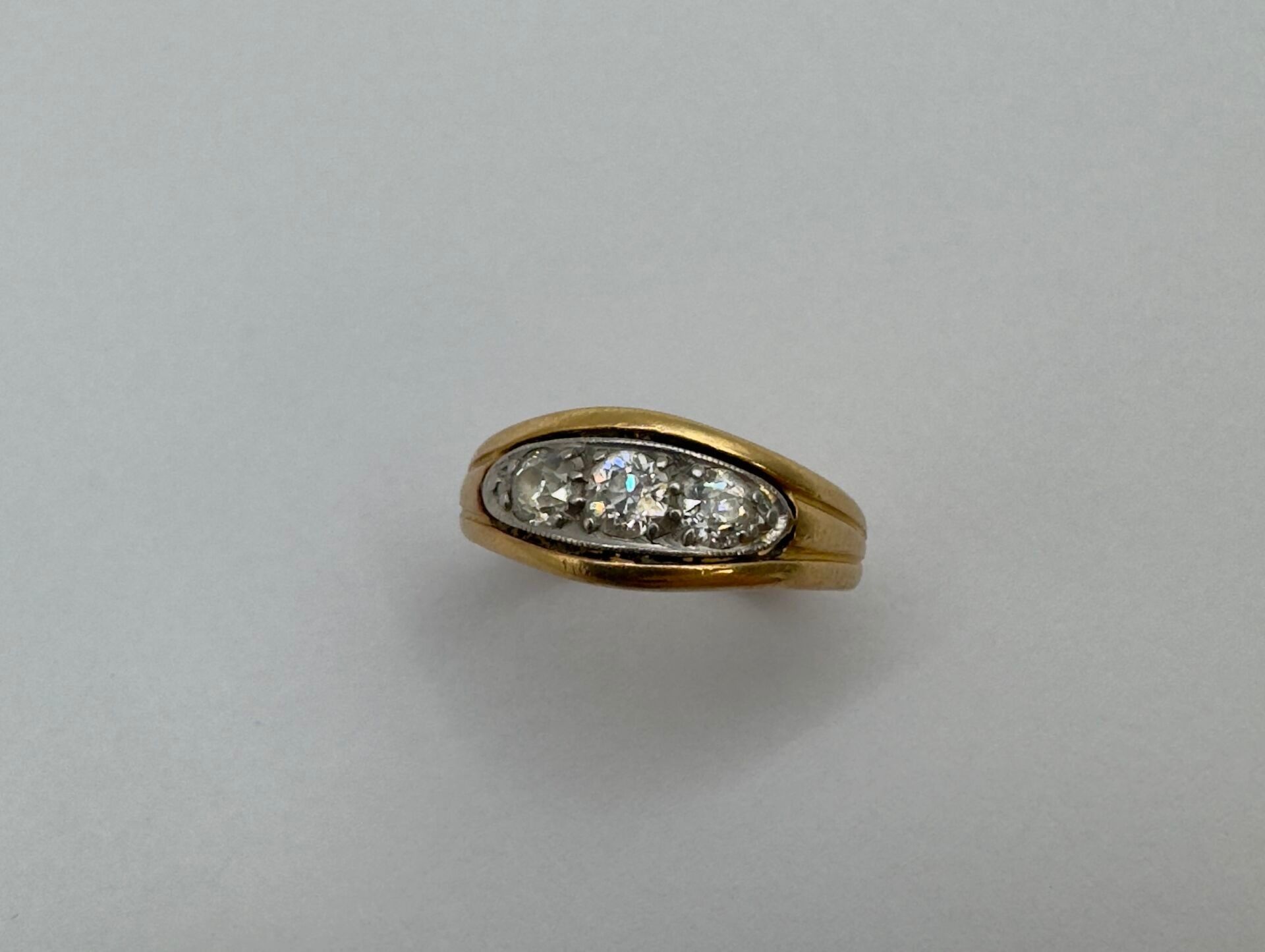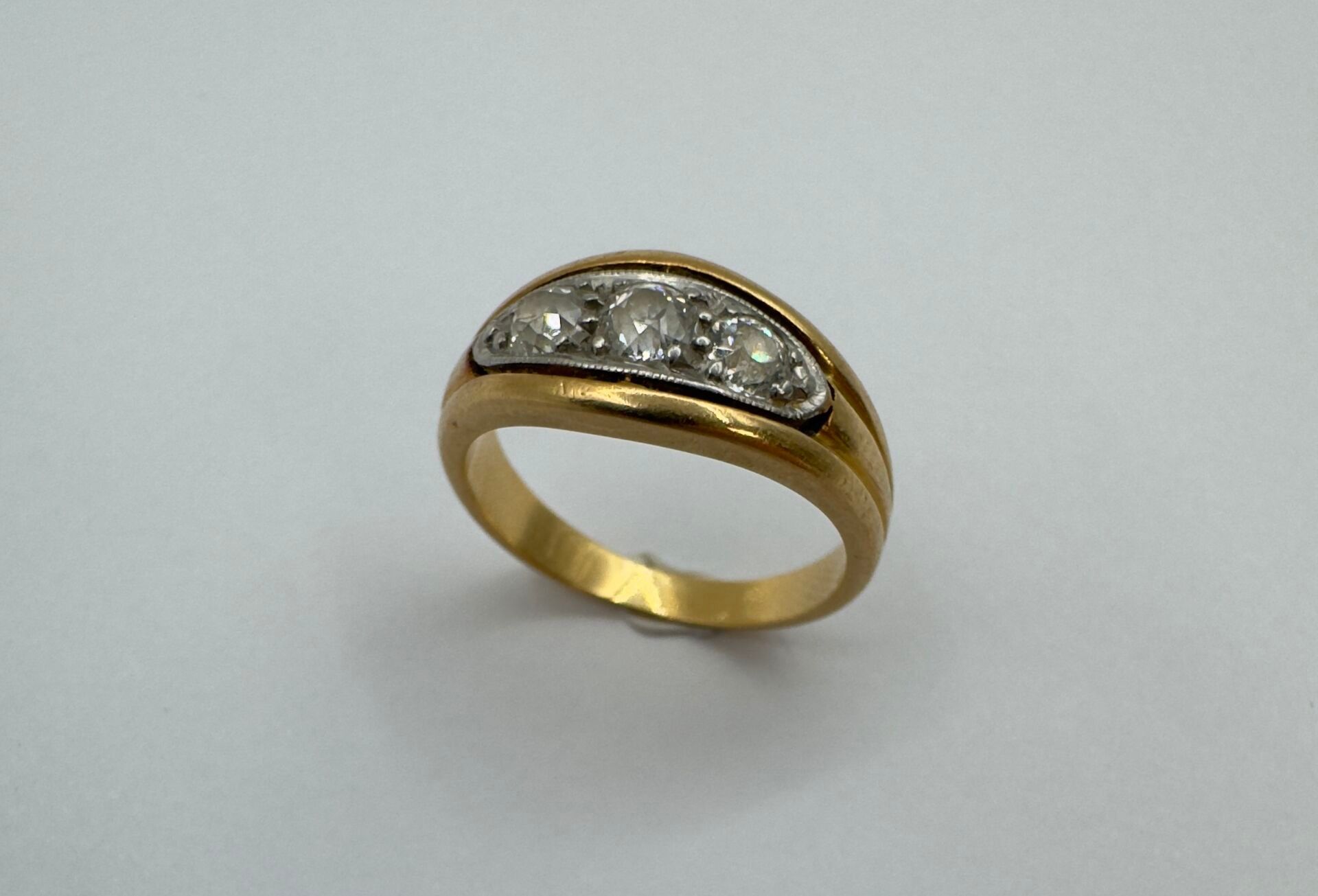 Garter ring set with 3 old-cut diamonds. Set in 18 carat (750 thousandths) yellow gold.