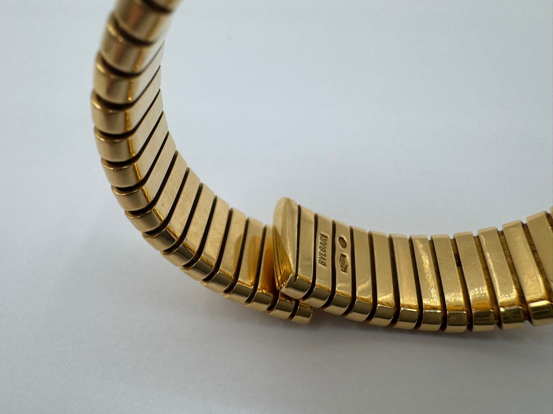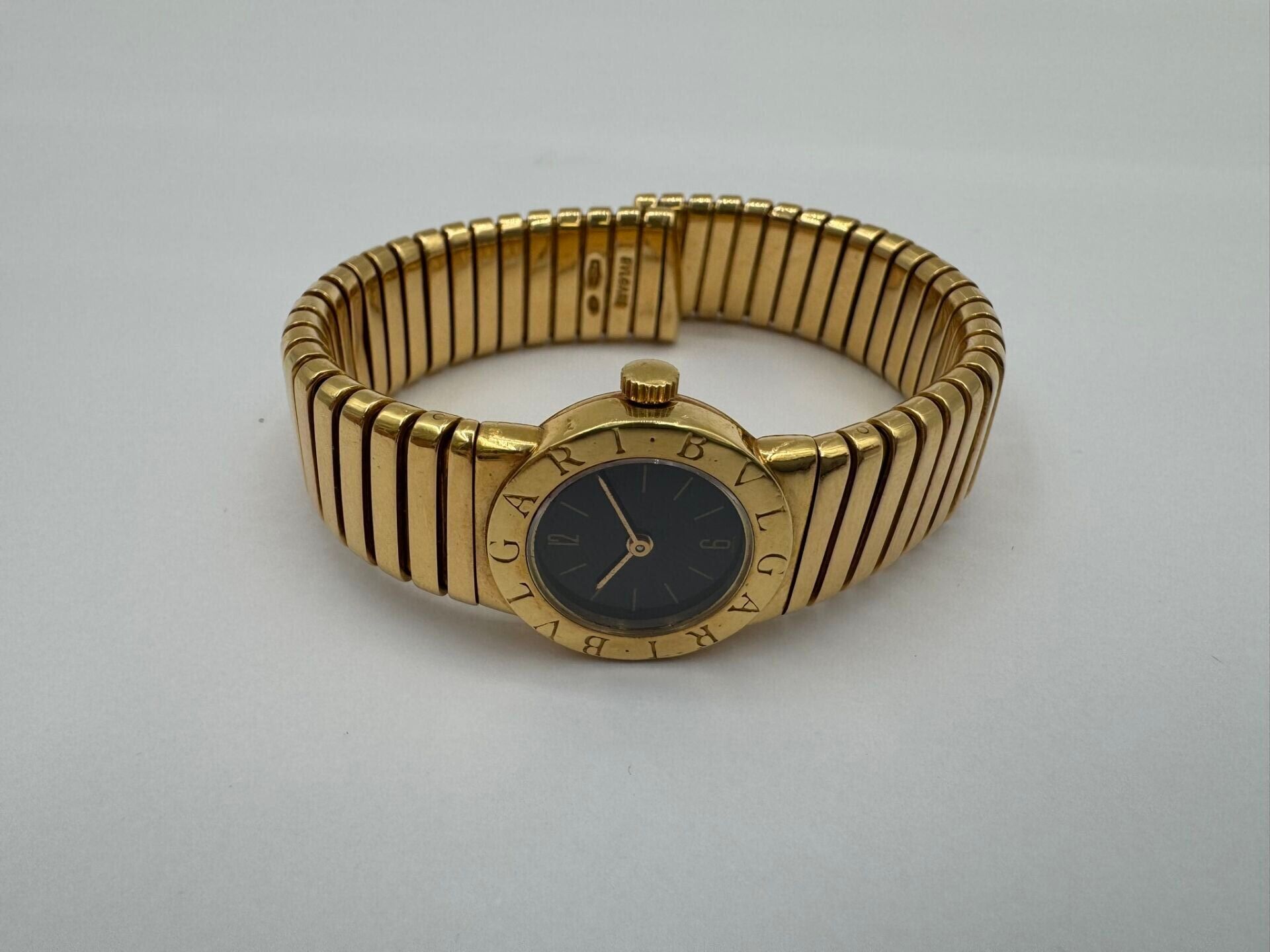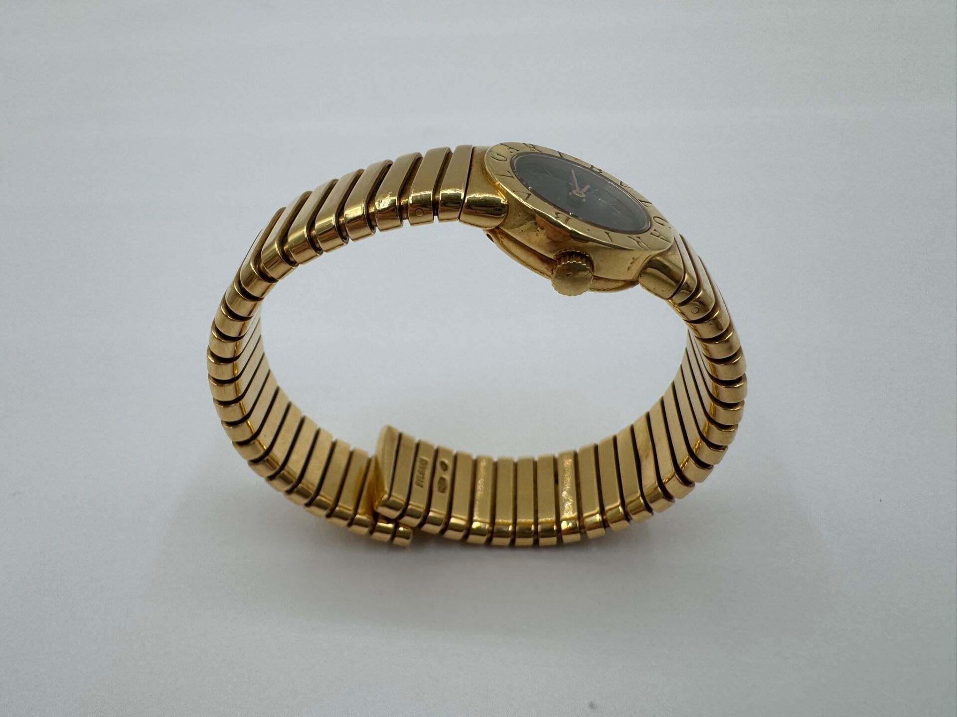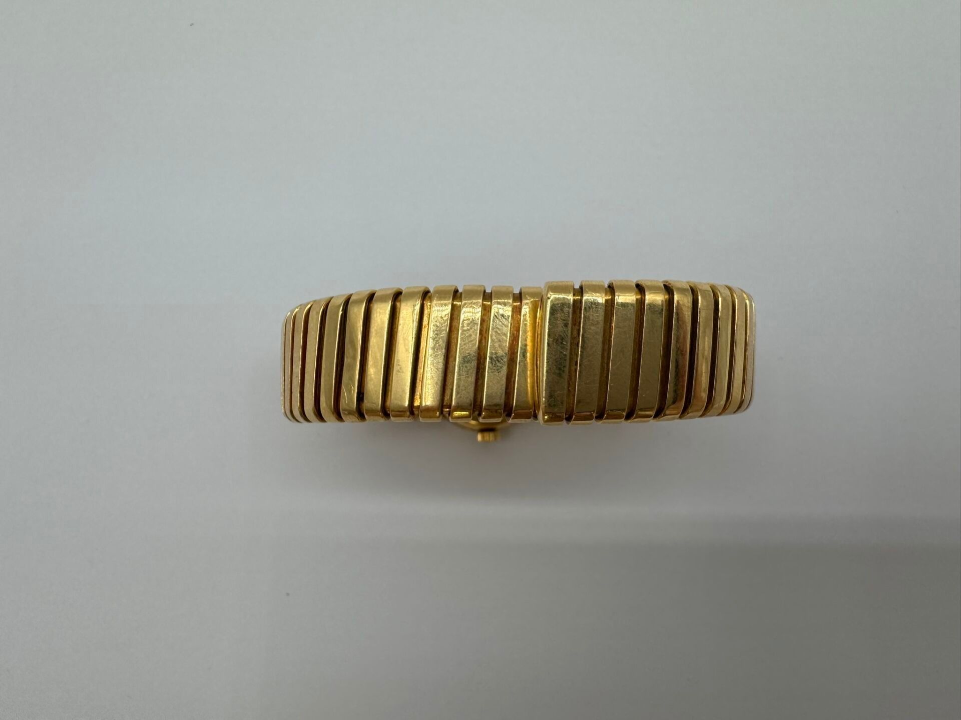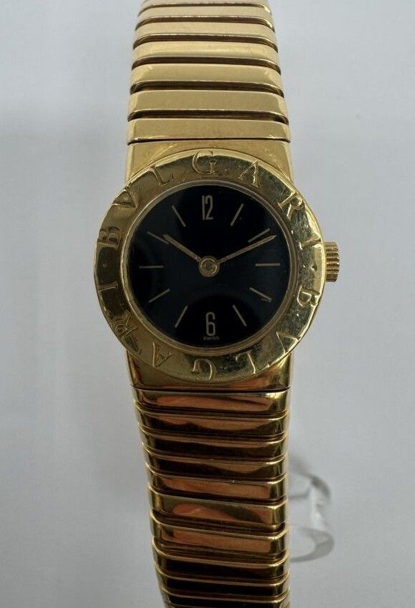 Ladies' wristwatch in 18 carat yellow gold 750 mil, open gold bracelet, tubogaz links, signed, black dial with Arabic numerals and baton hour markers, bezel engraved ''BVLGARI'', quartz movement.