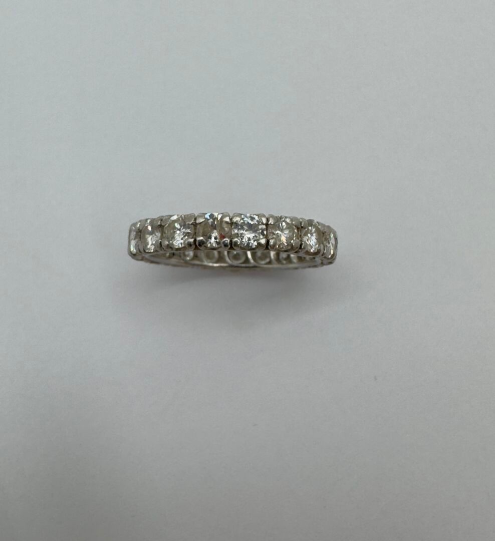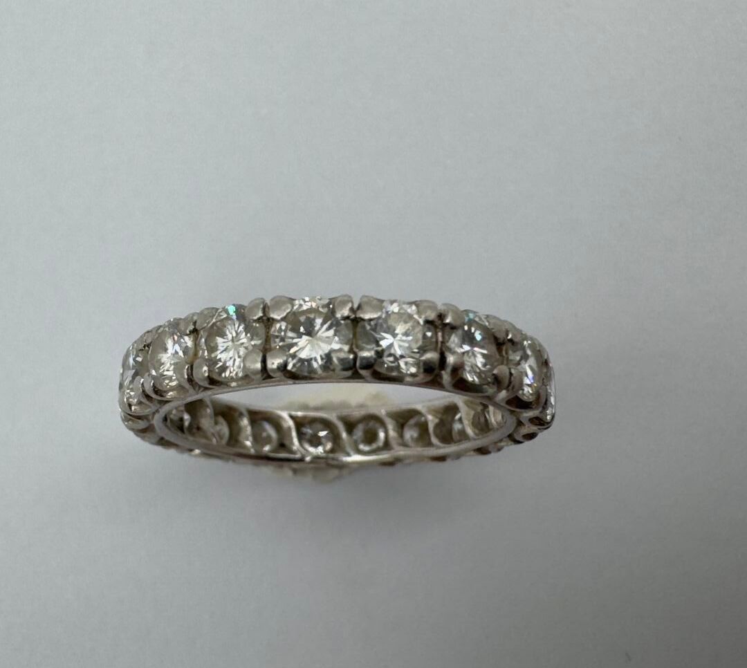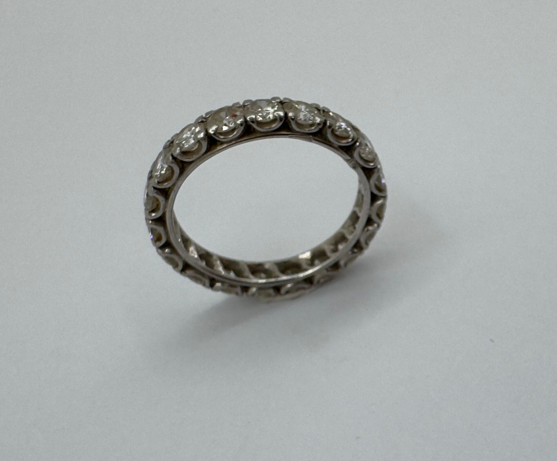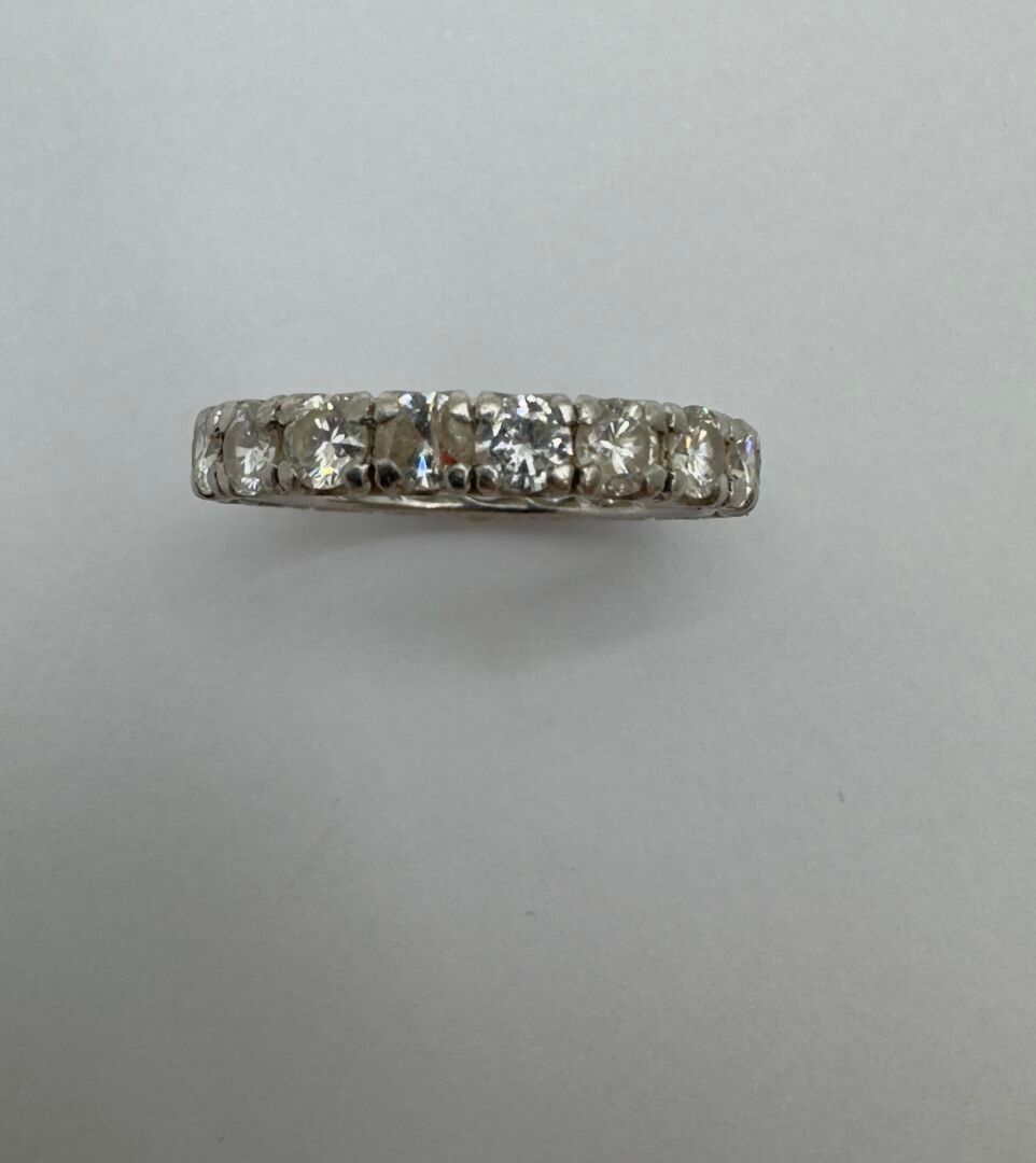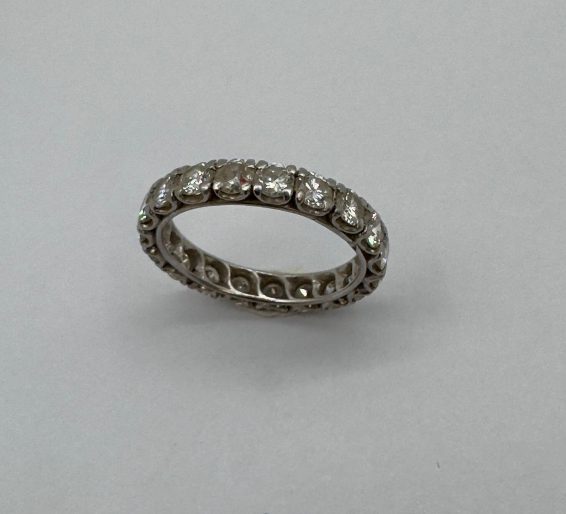 American wedding ring set with 19 modern-cut diamonds (material missing on three stones), totalling more than 2 carats. The setting is in platinum (800 thousandths).