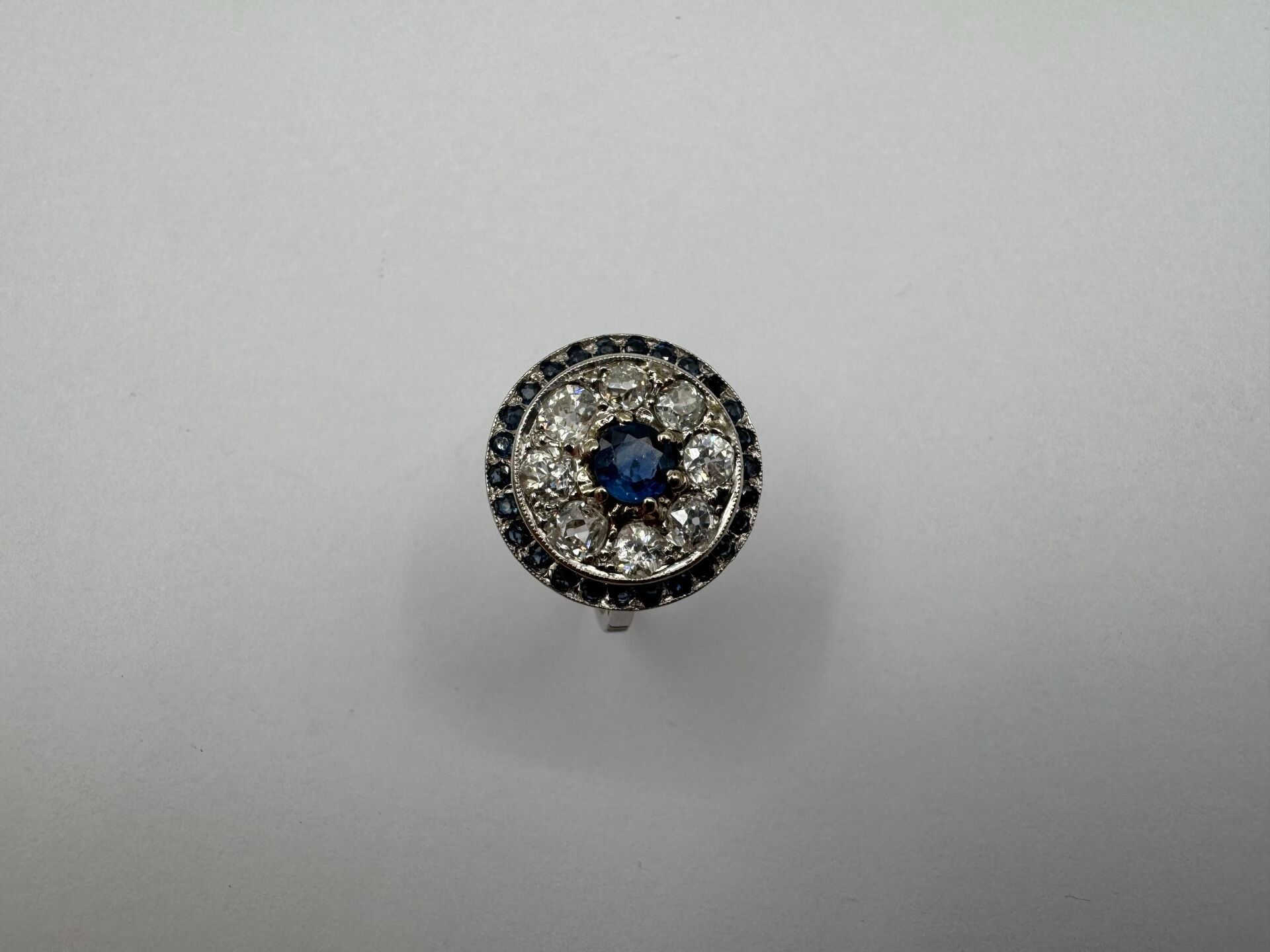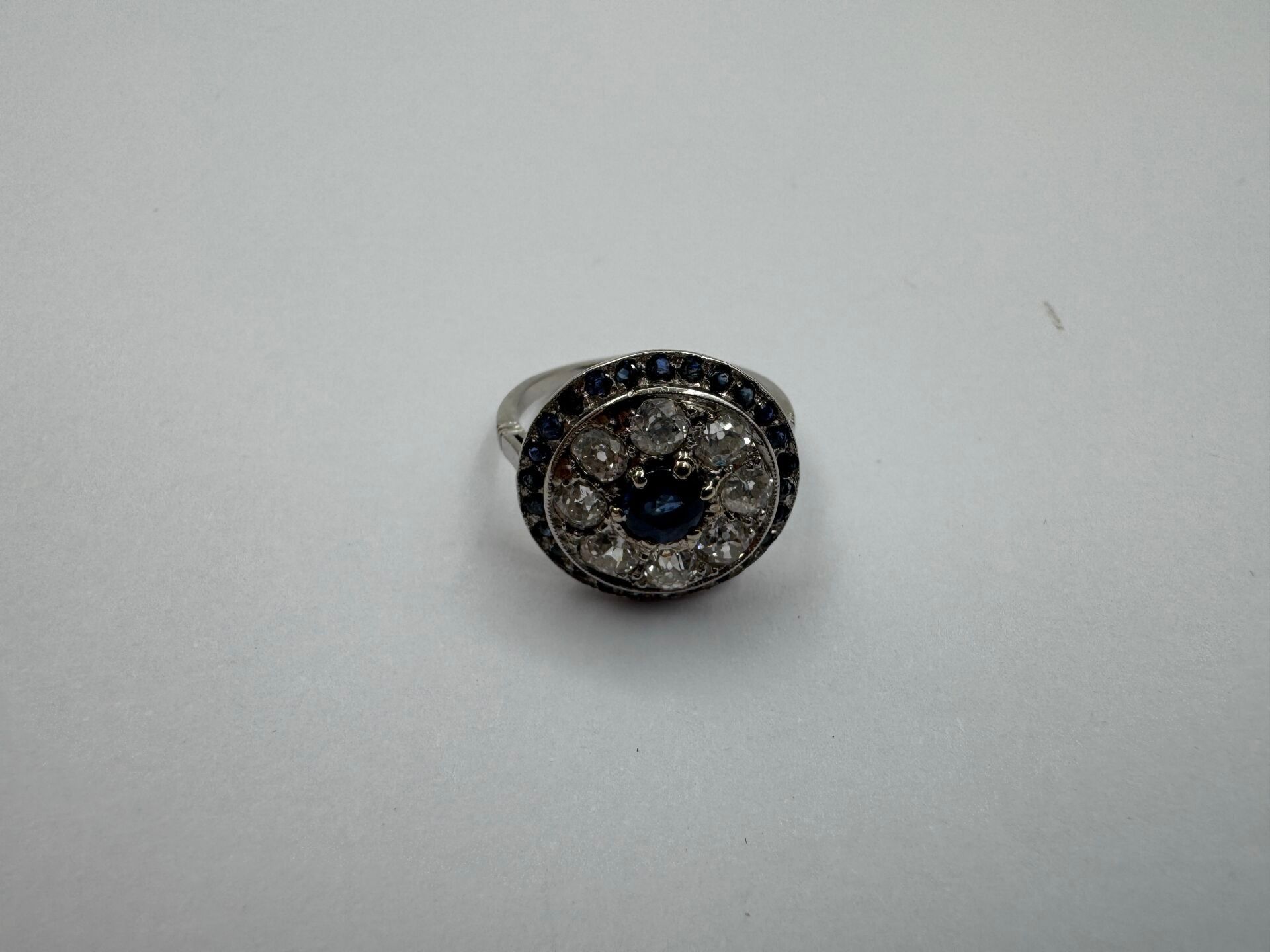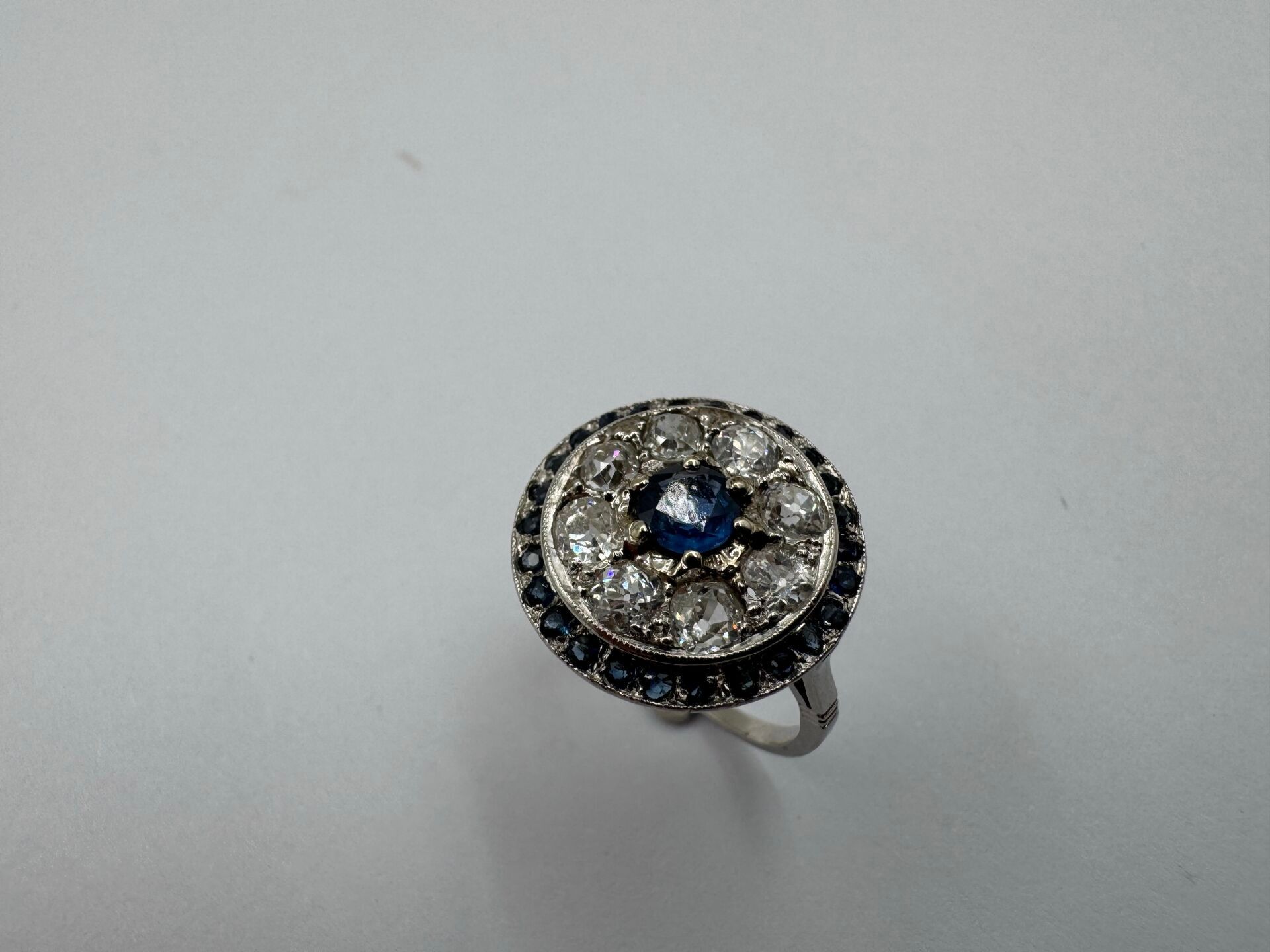 Platinum rosette ring centred on a sapphire set in a double border of old-cut diamonds and sapphires.
