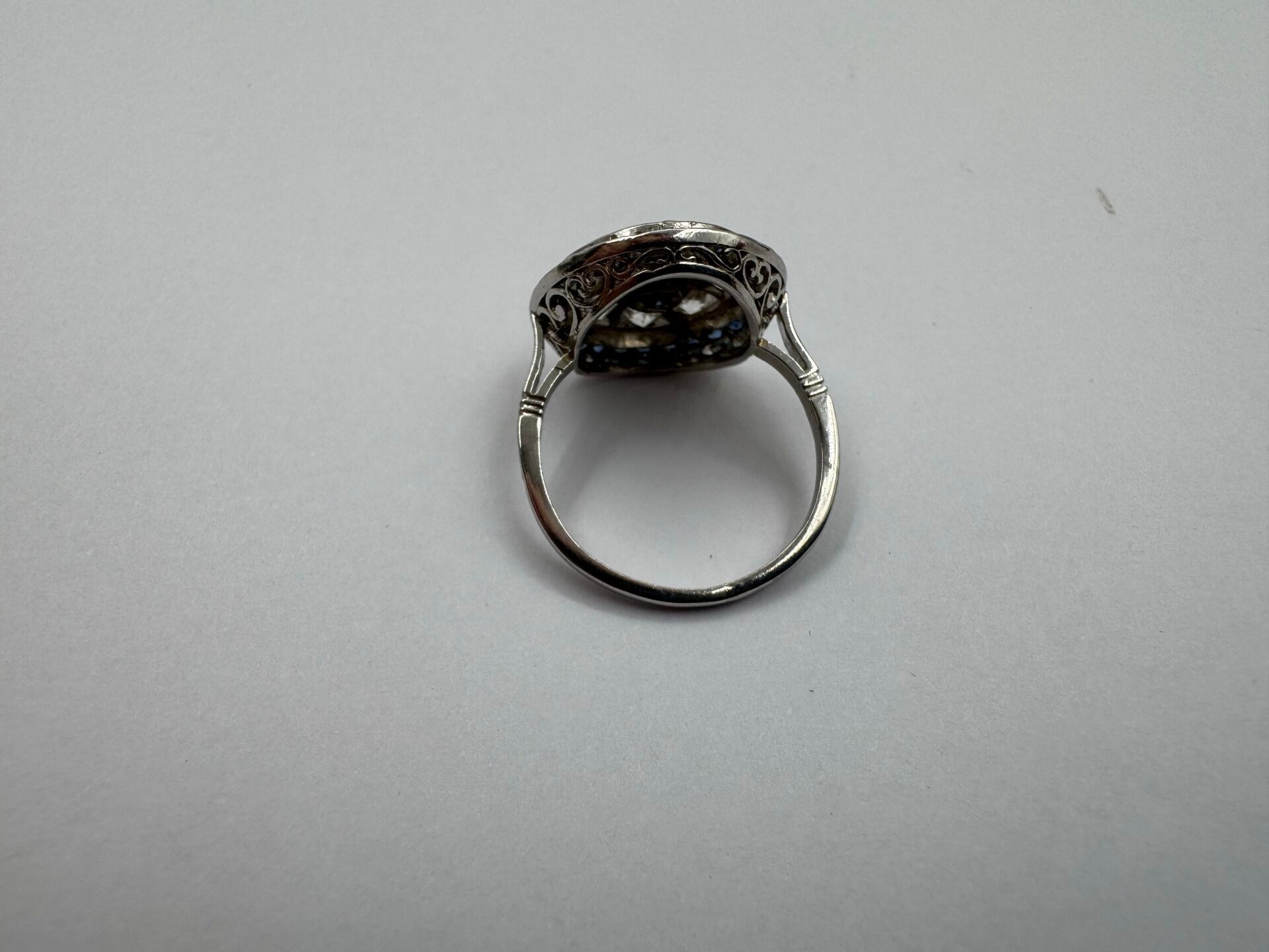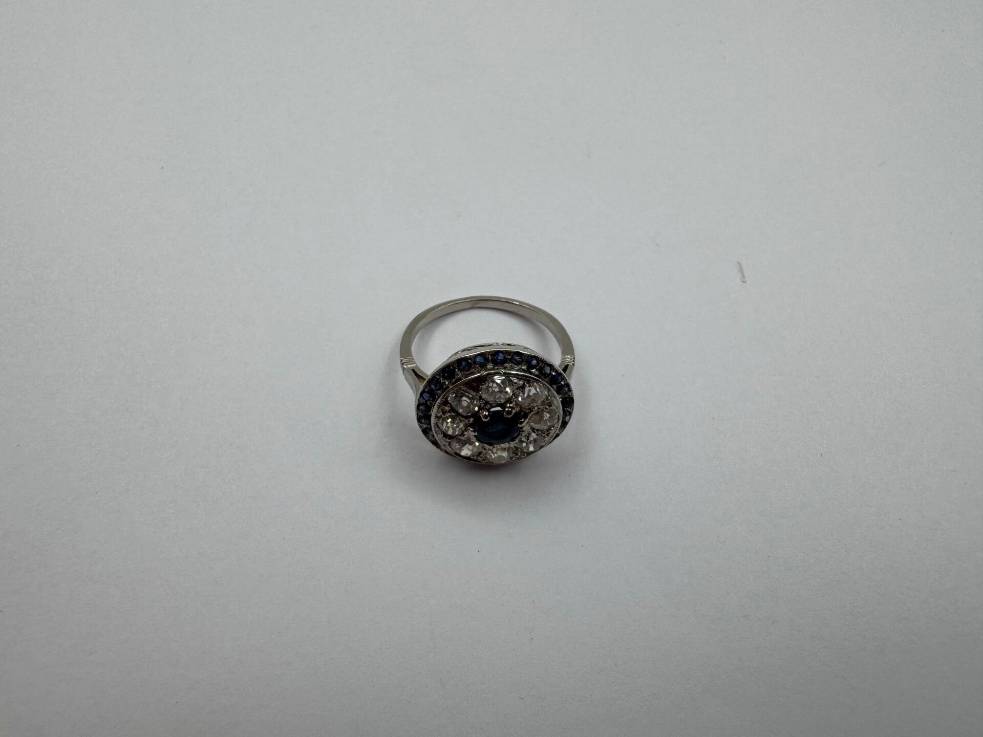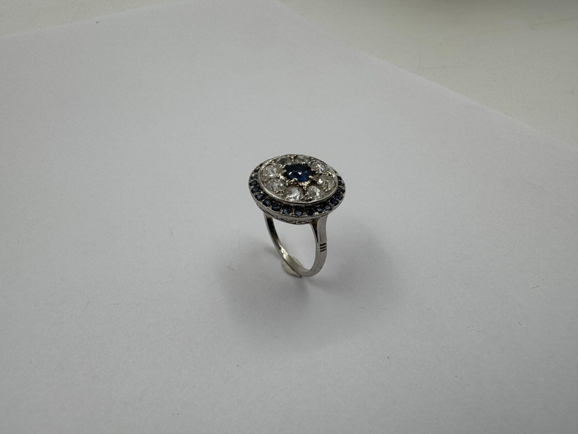 Platinum rosette ring centred on a sapphire set in a double border of old-cut diamonds and sapphires.