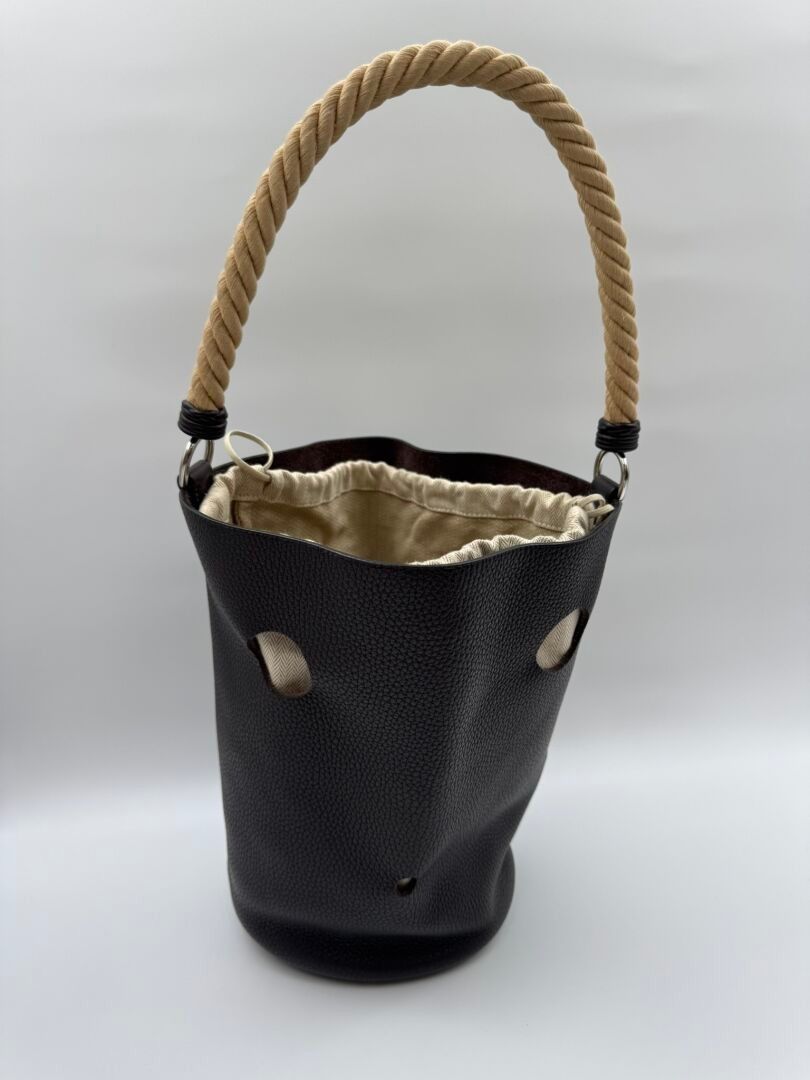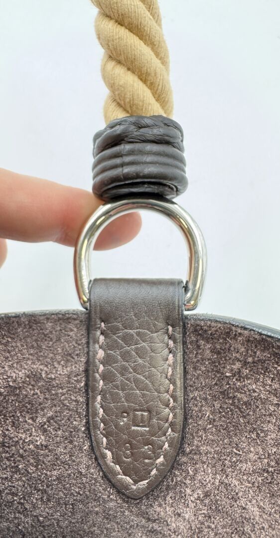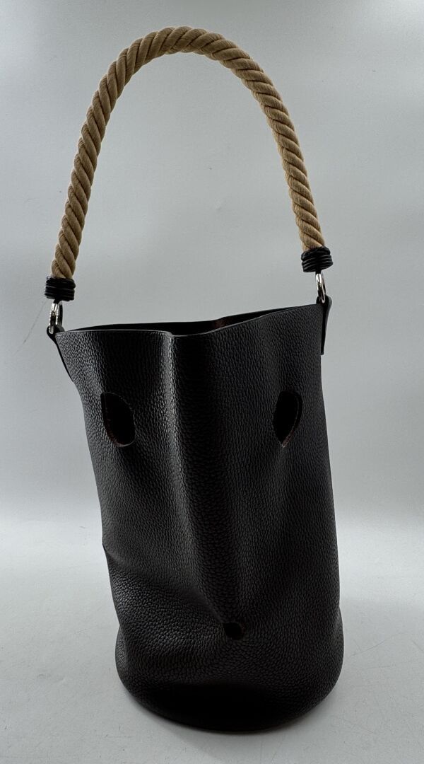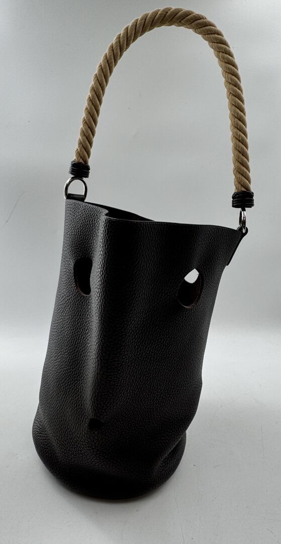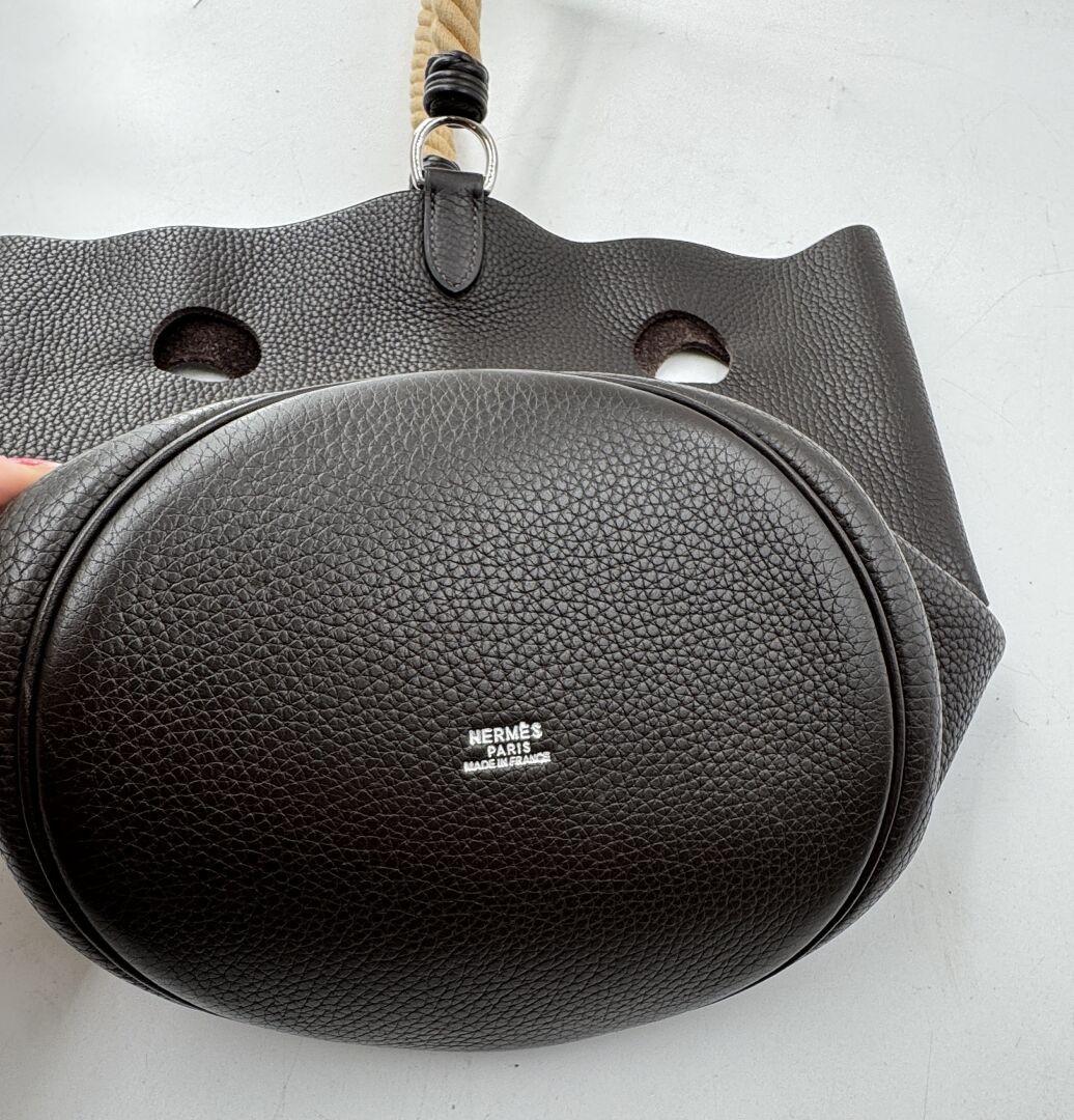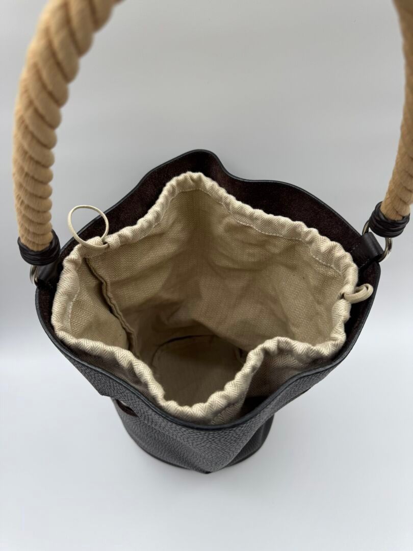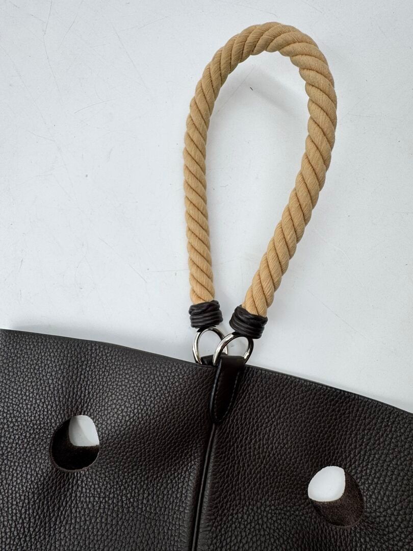 Mangeoire bag in chocolate brown Togo leather, natural braided rope handle, with its herringbone canvas cover with removable sliding closure.