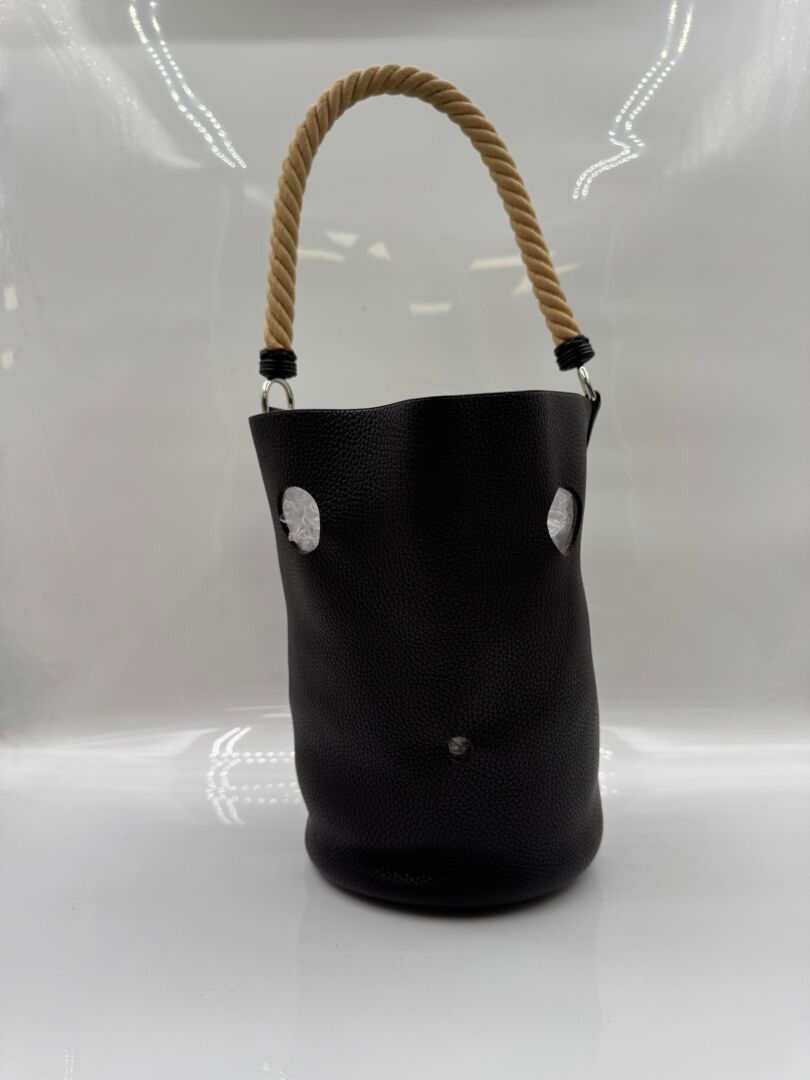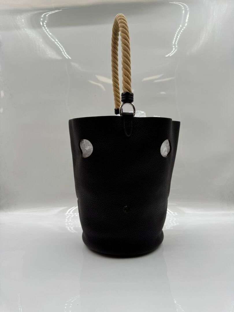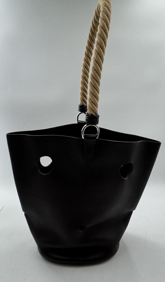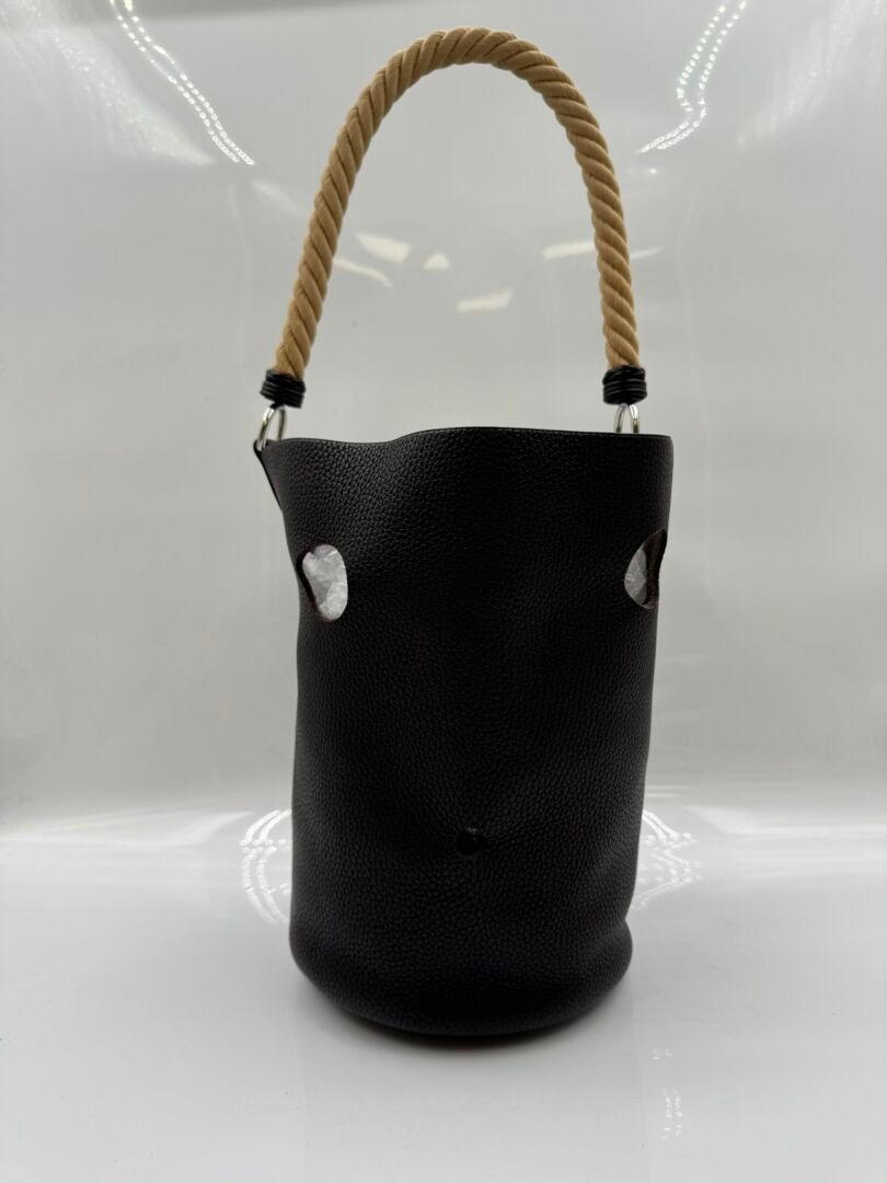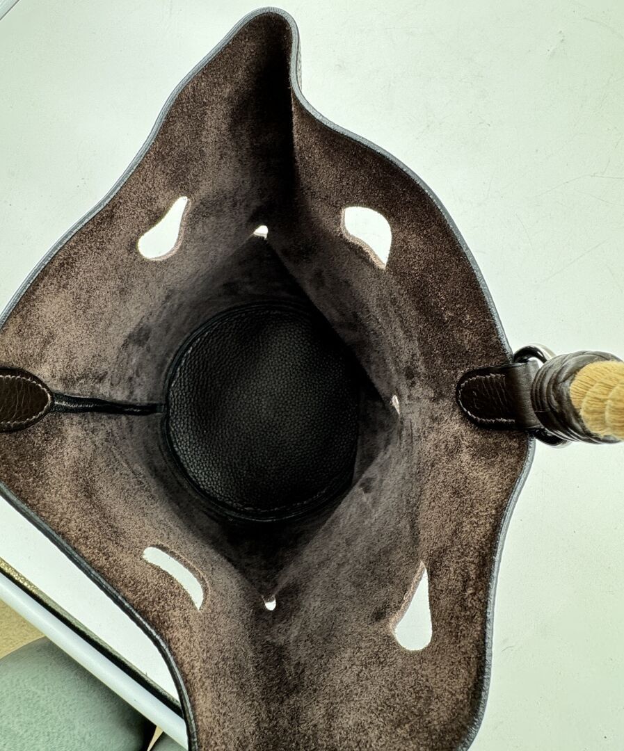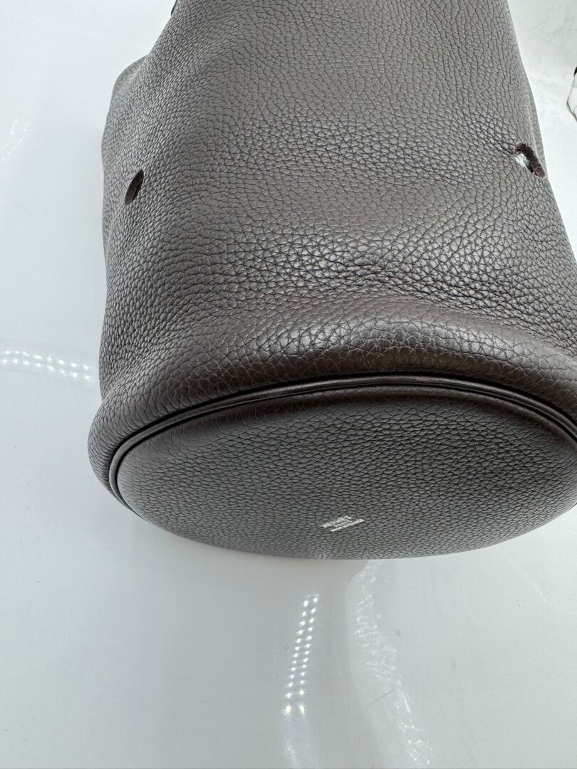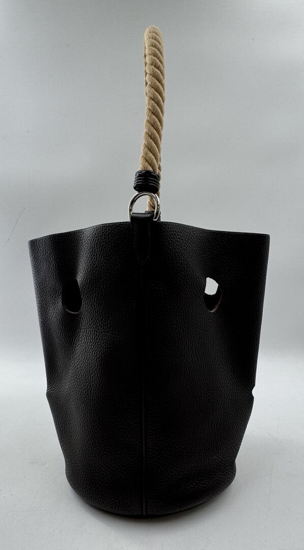 Mangeoire bag in chocolate brown Togo leather, natural braided rope handle, with its herringbone canvas cover with removable sliding closure.