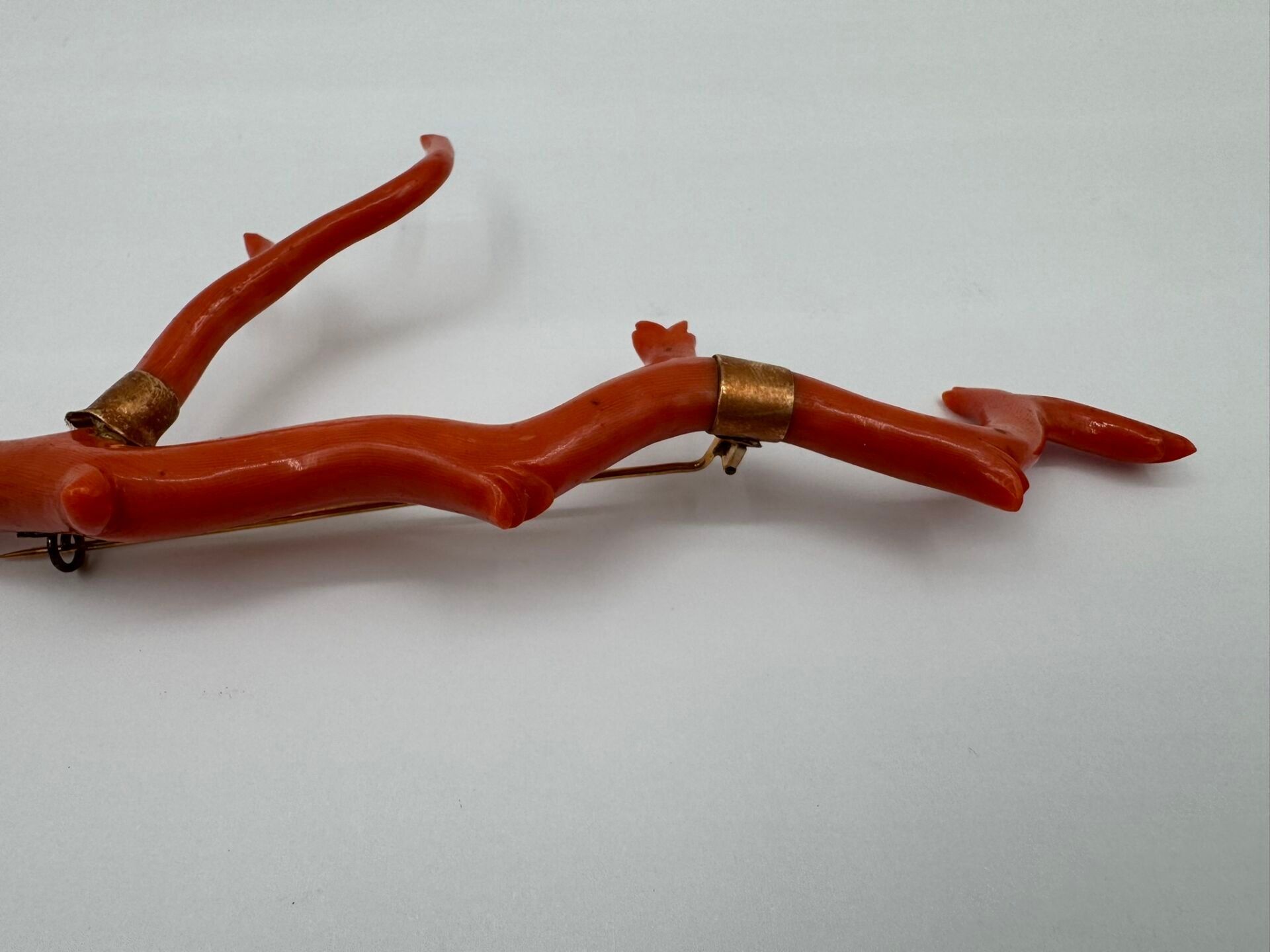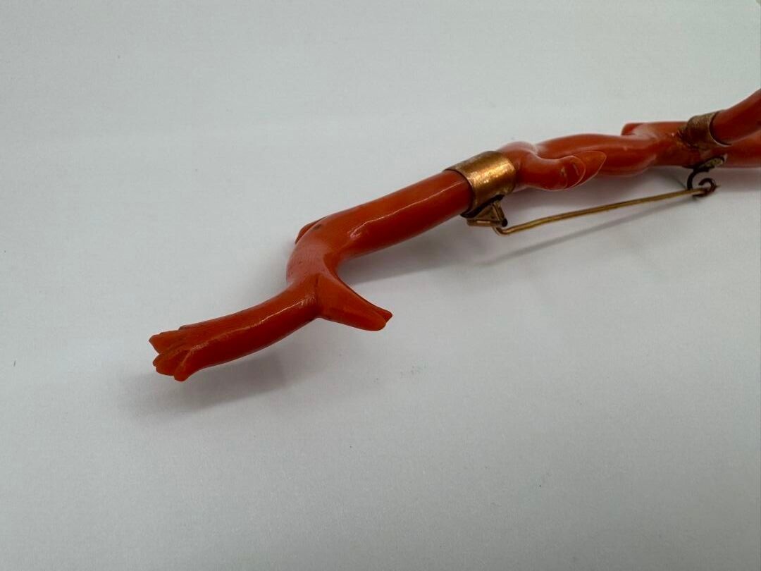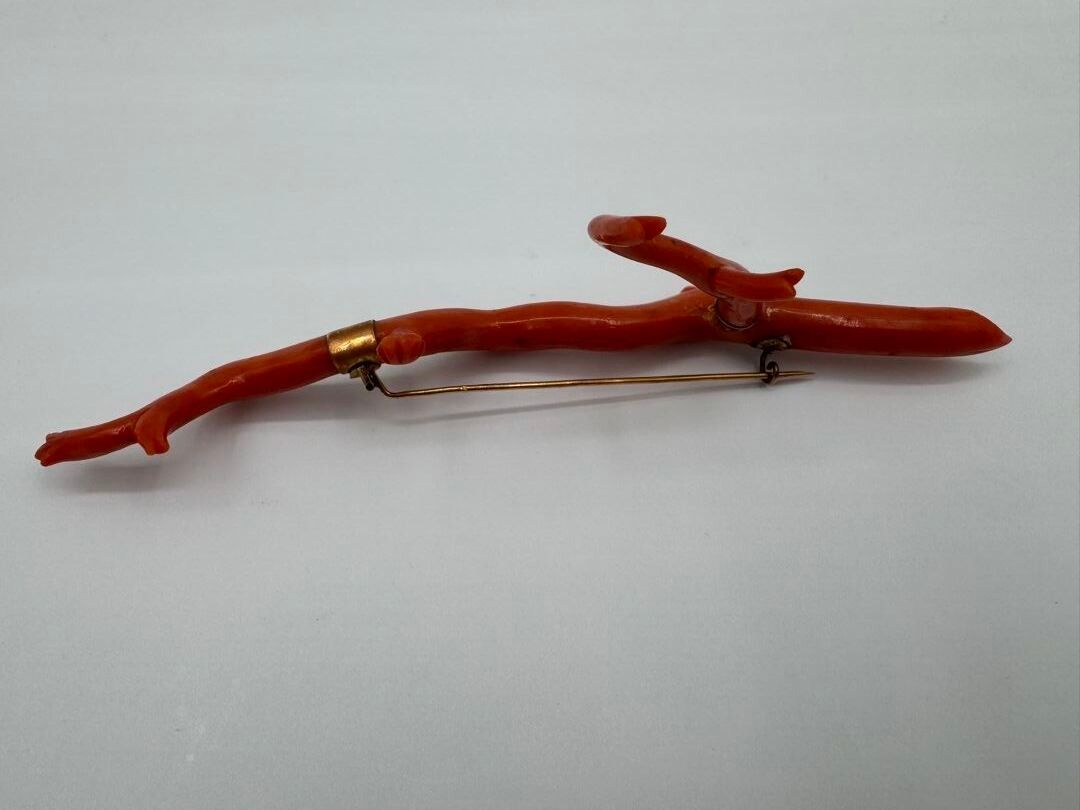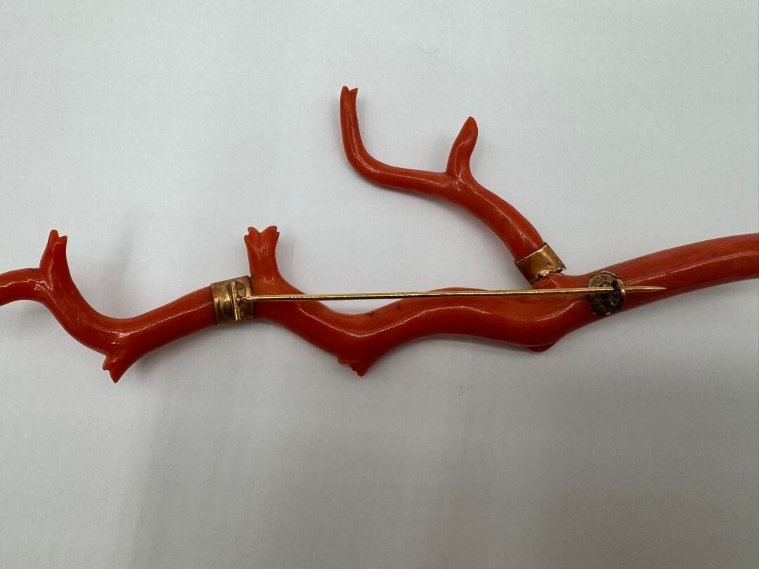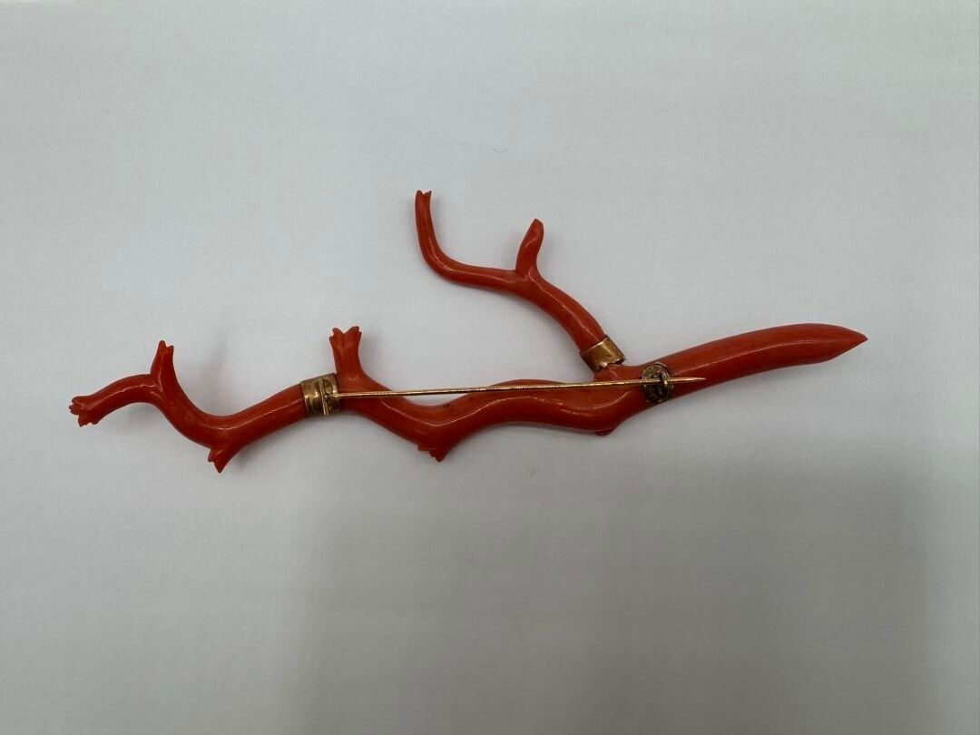 Important brooch consisting of a branch of natural coral, carved on the ends. Mounted in 18 carat (750 thousandths) yellow gold, stamped with a horse's head.