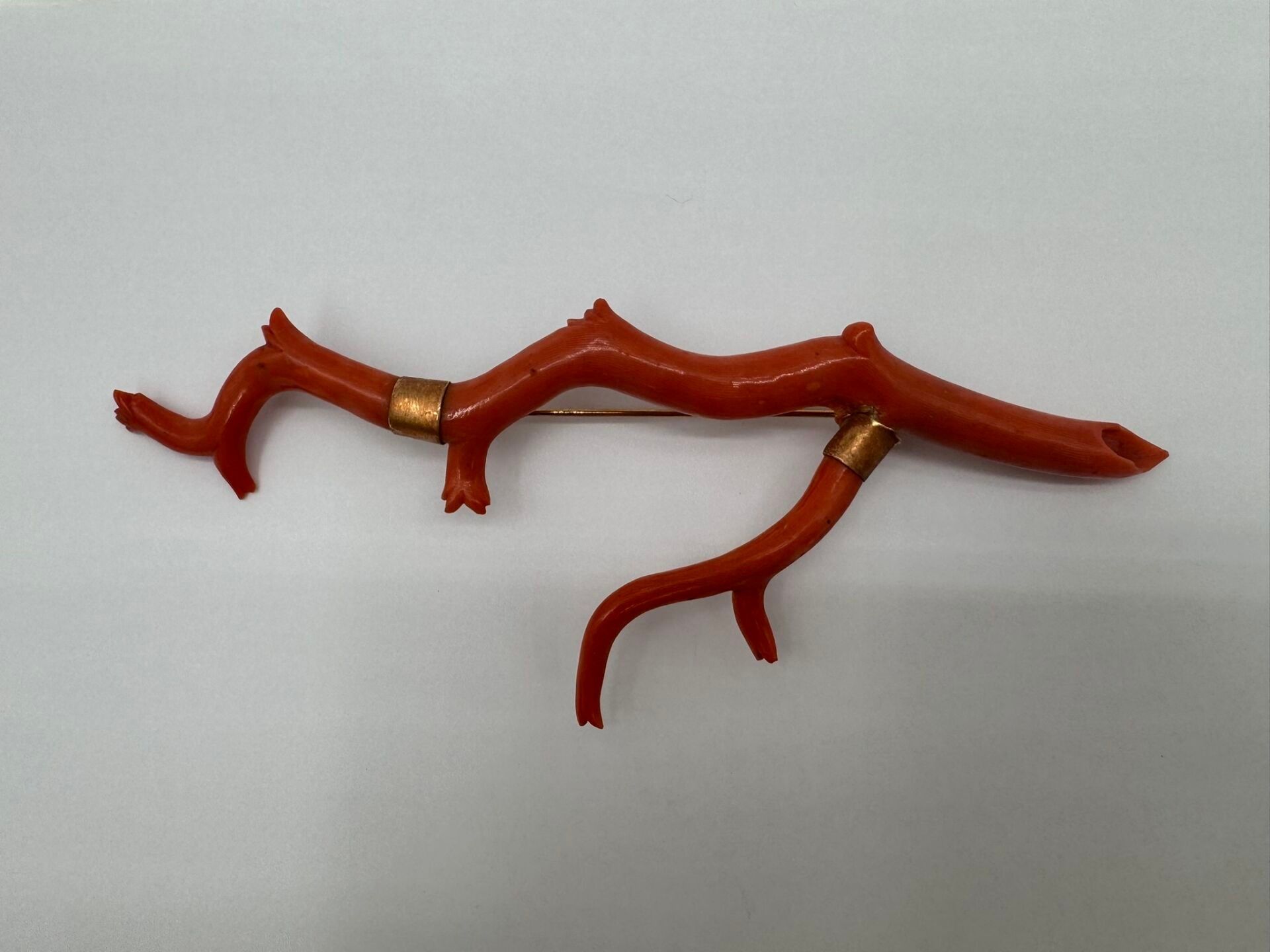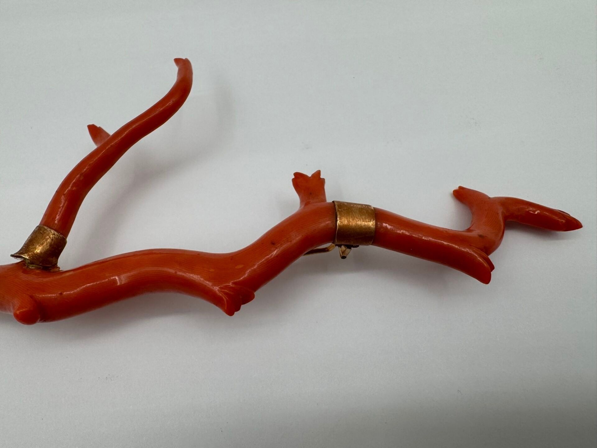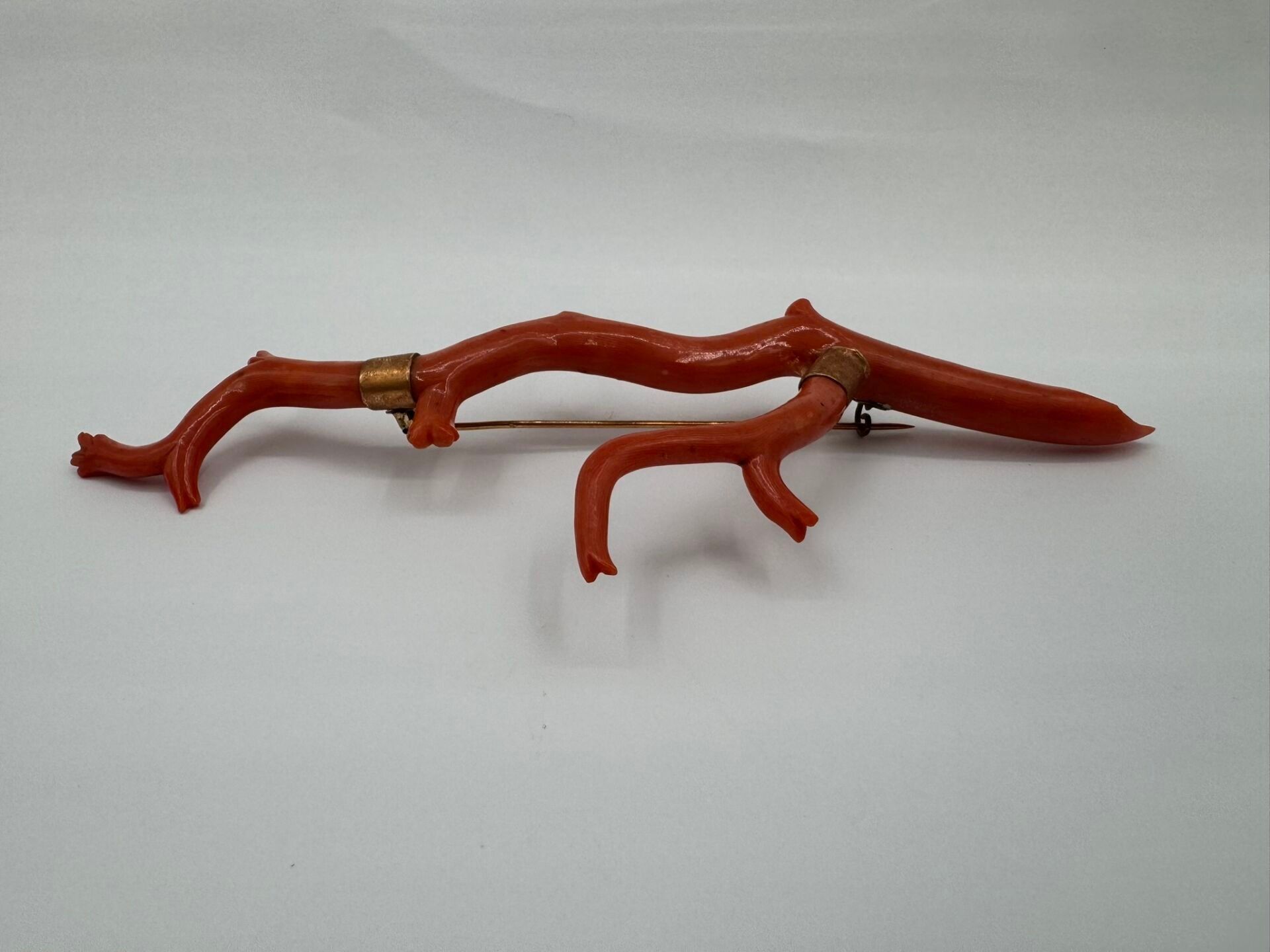 Important brooch consisting of a branch of natural coral, carved on the ends. Mounted in 18 carat (750 thousandths) yellow gold, stamped with a horse's head.