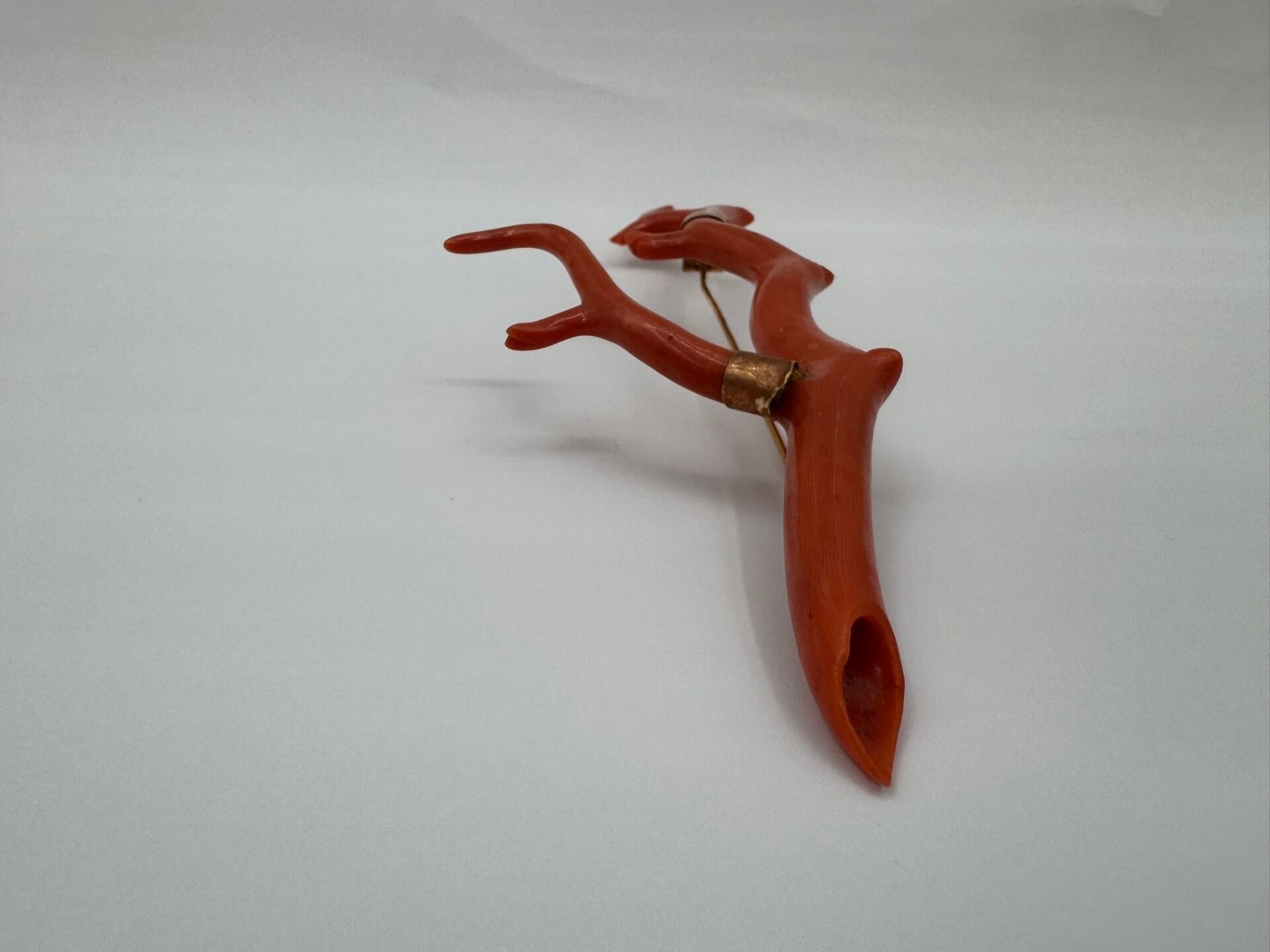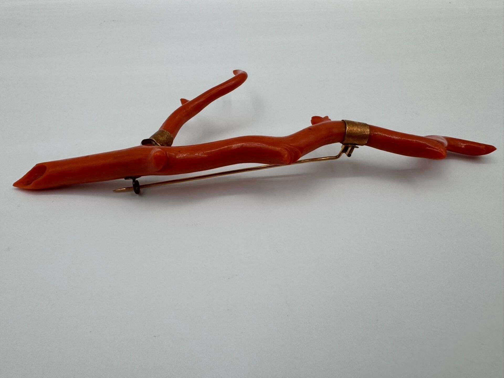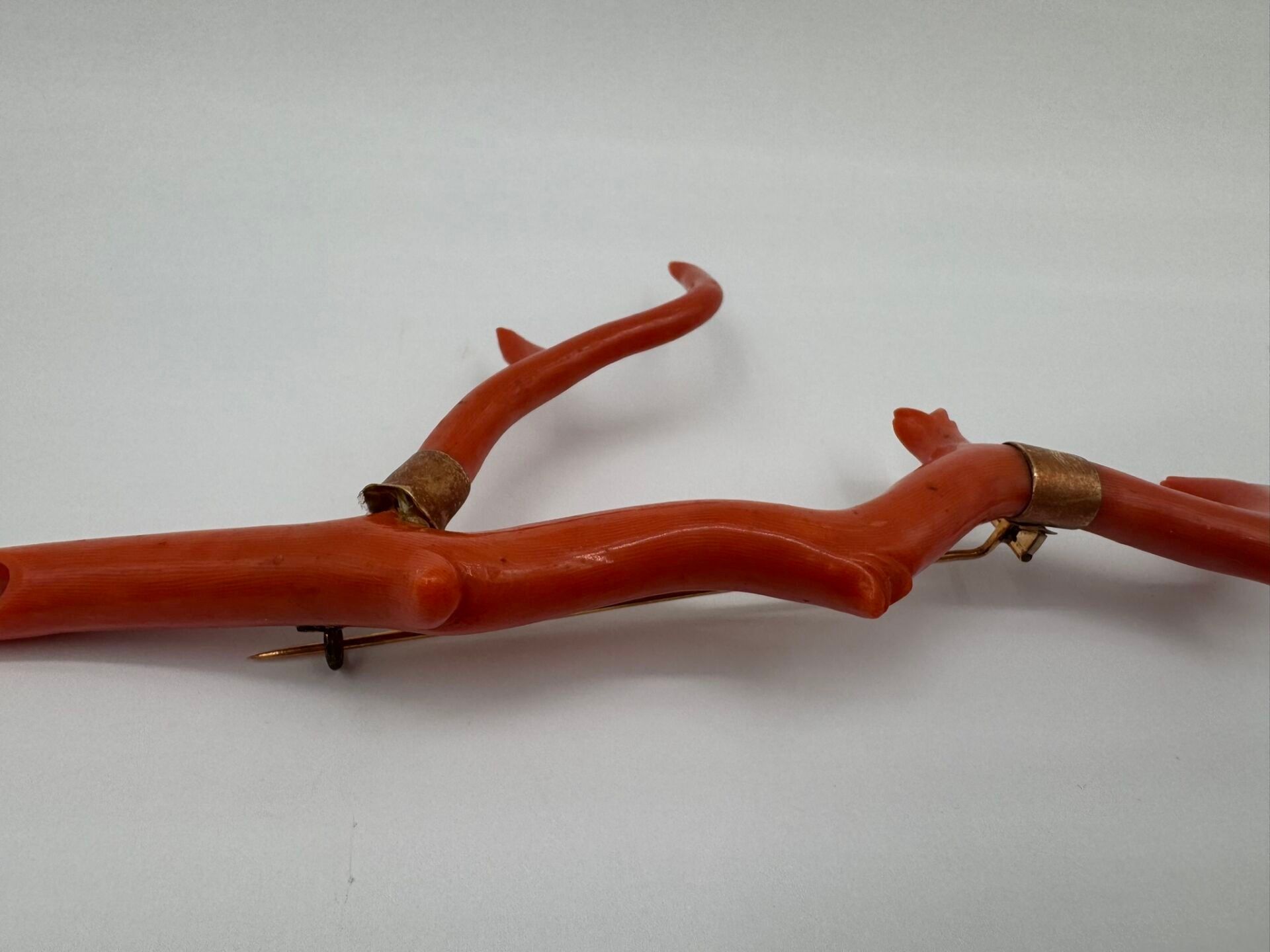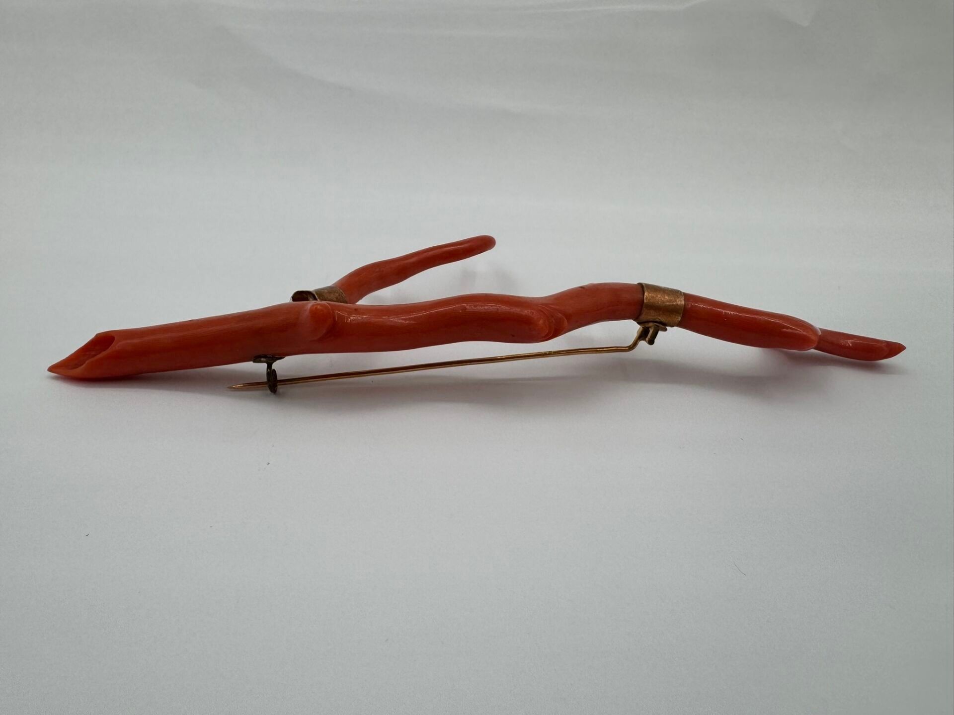 Important brooch consisting of a branch of natural coral, carved on the ends. Mounted in 18 carat (750 thousandths) yellow gold, stamped with a horse's head.