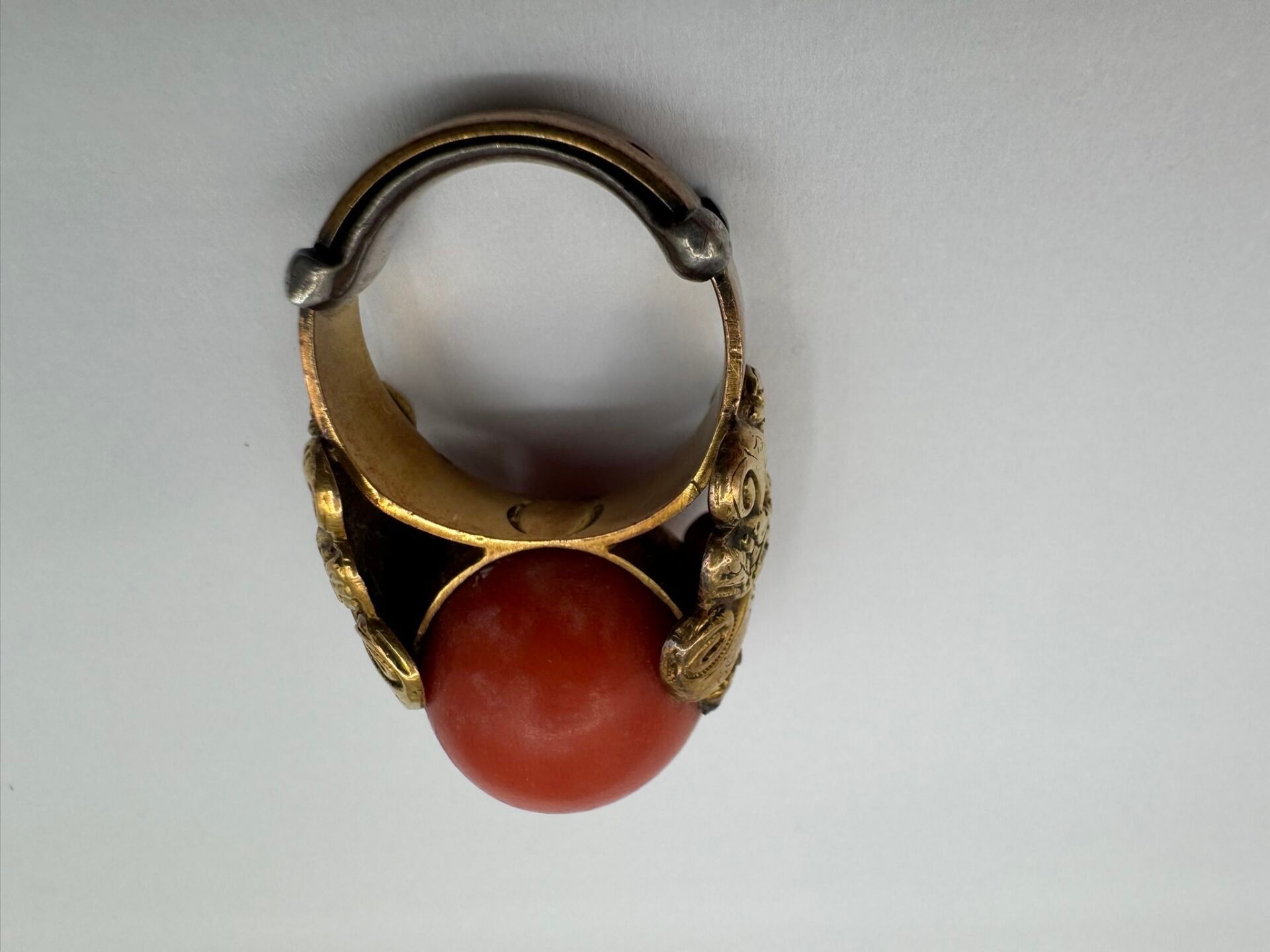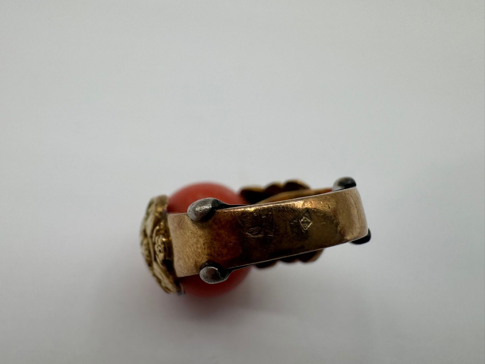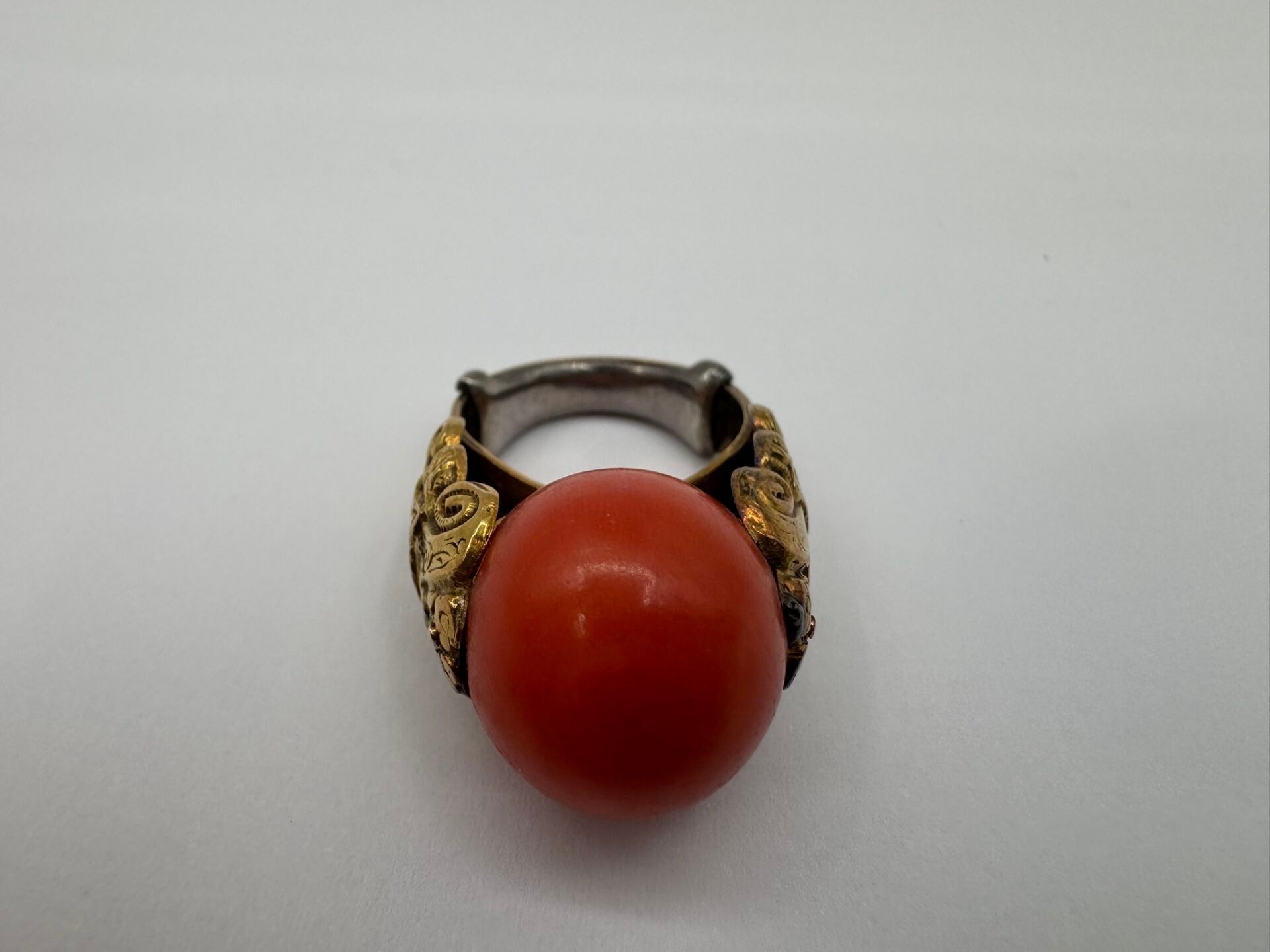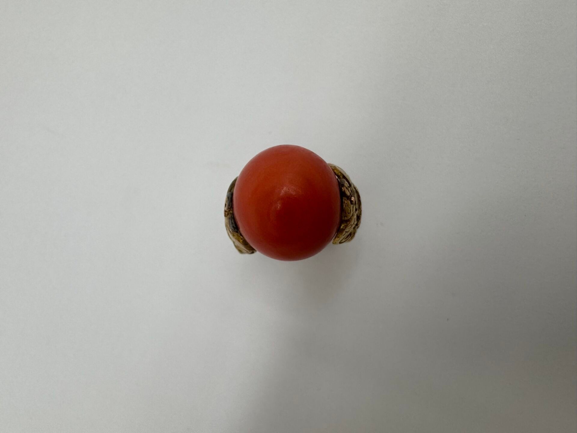 Important ring centred on a natural coral pearl (diameter 15.7 mm) in a shoulder with flower and scroll motifs.