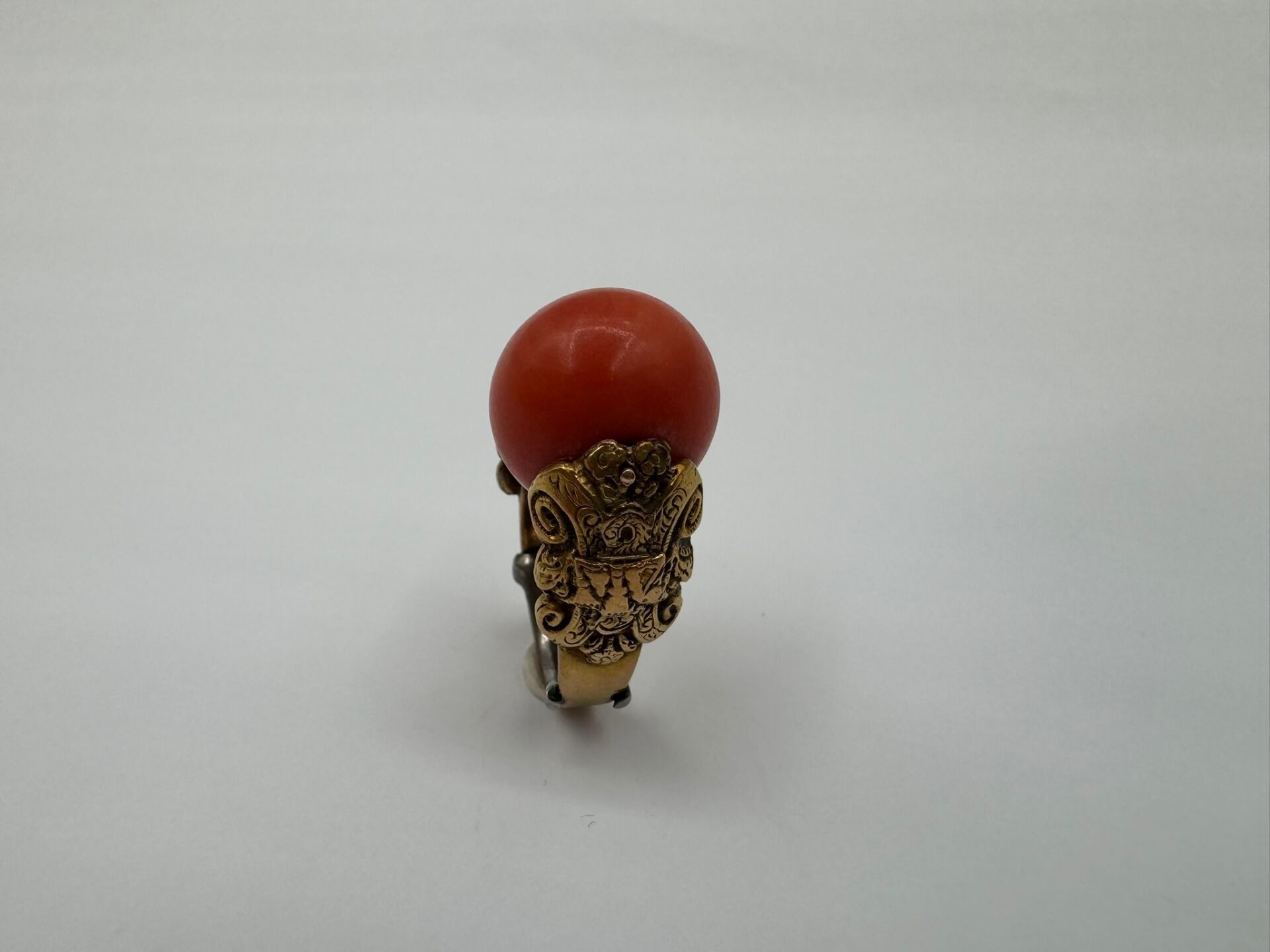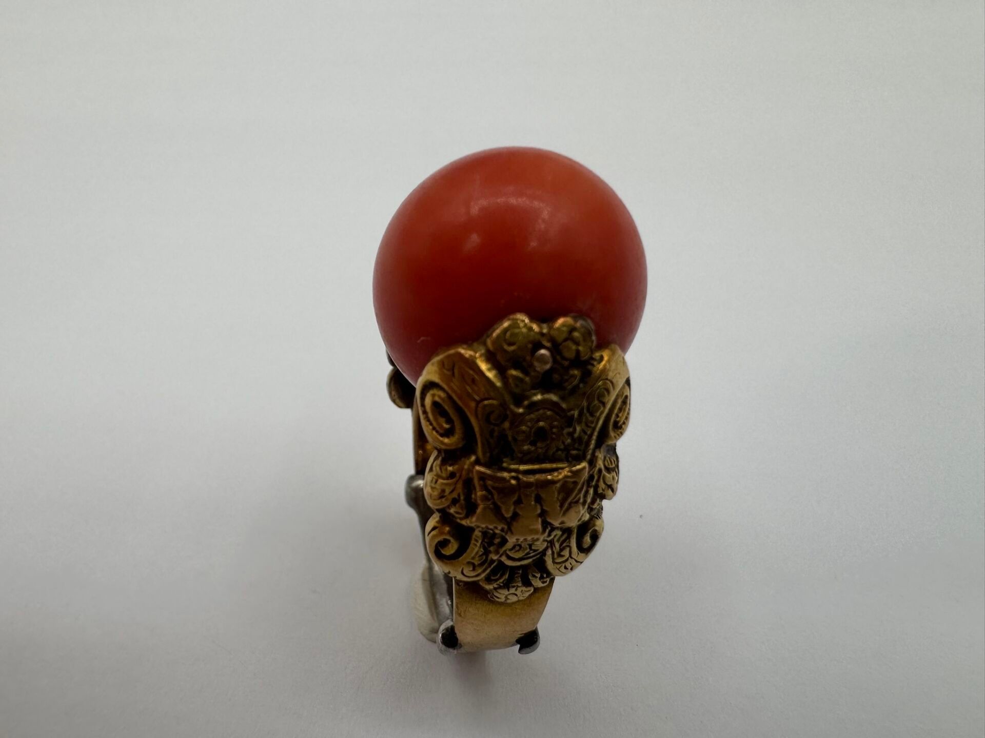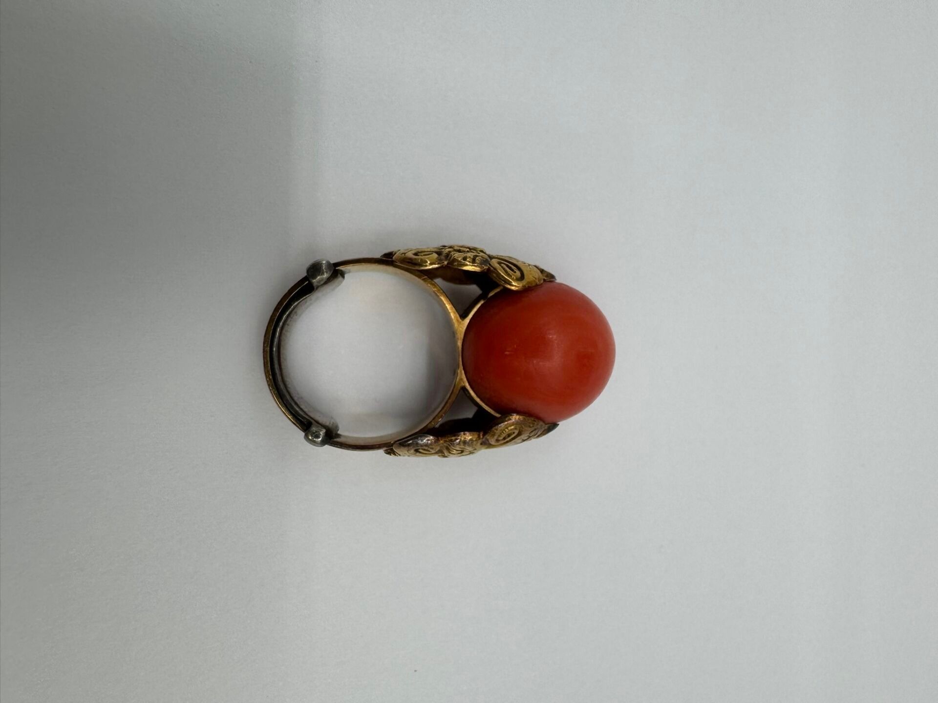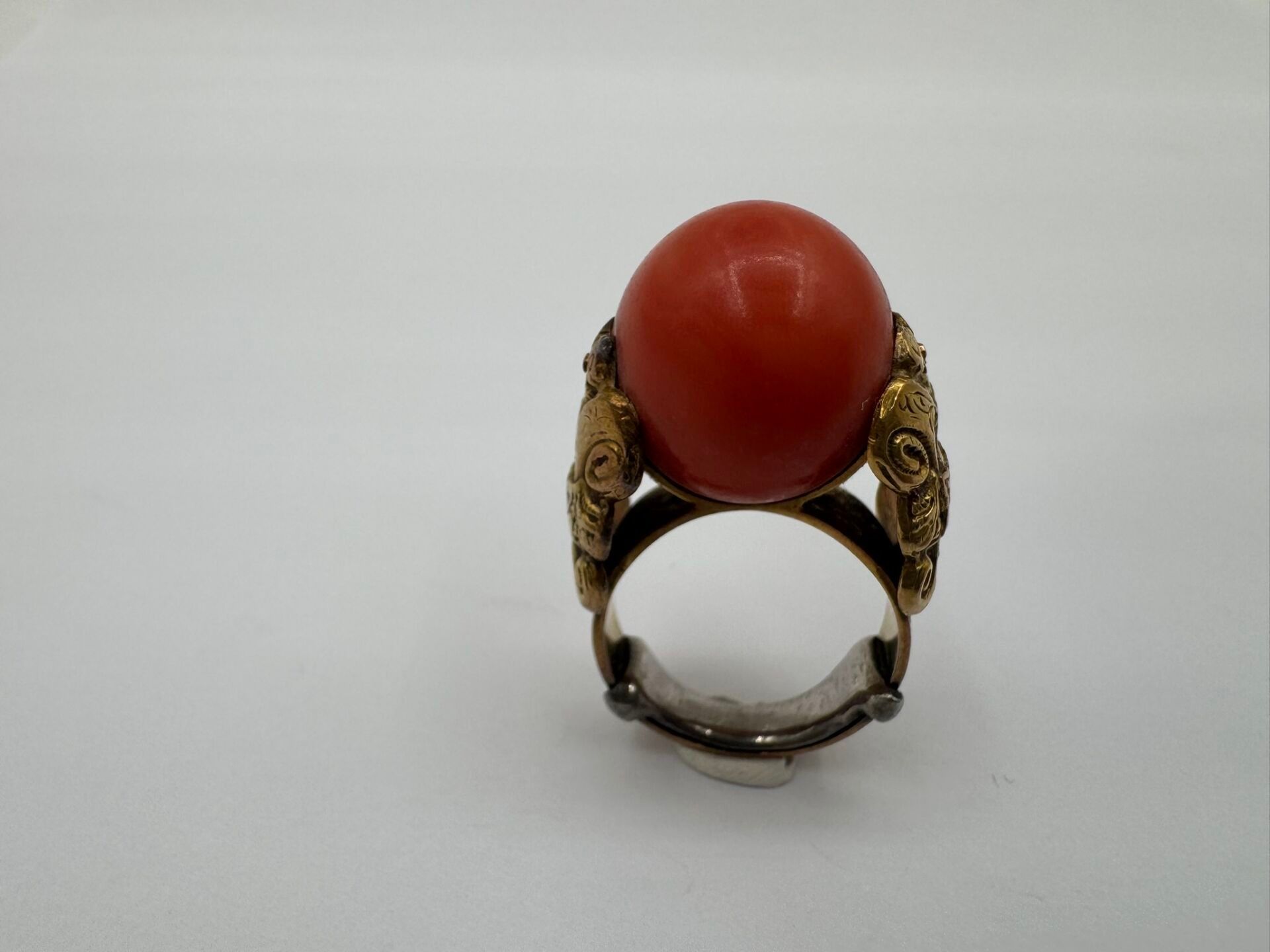 Important ring centred on a natural coral pearl (diameter 15.7 mm) in a shoulder with flower and scroll motifs.