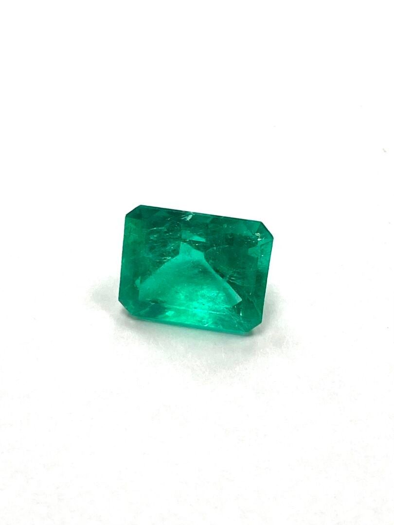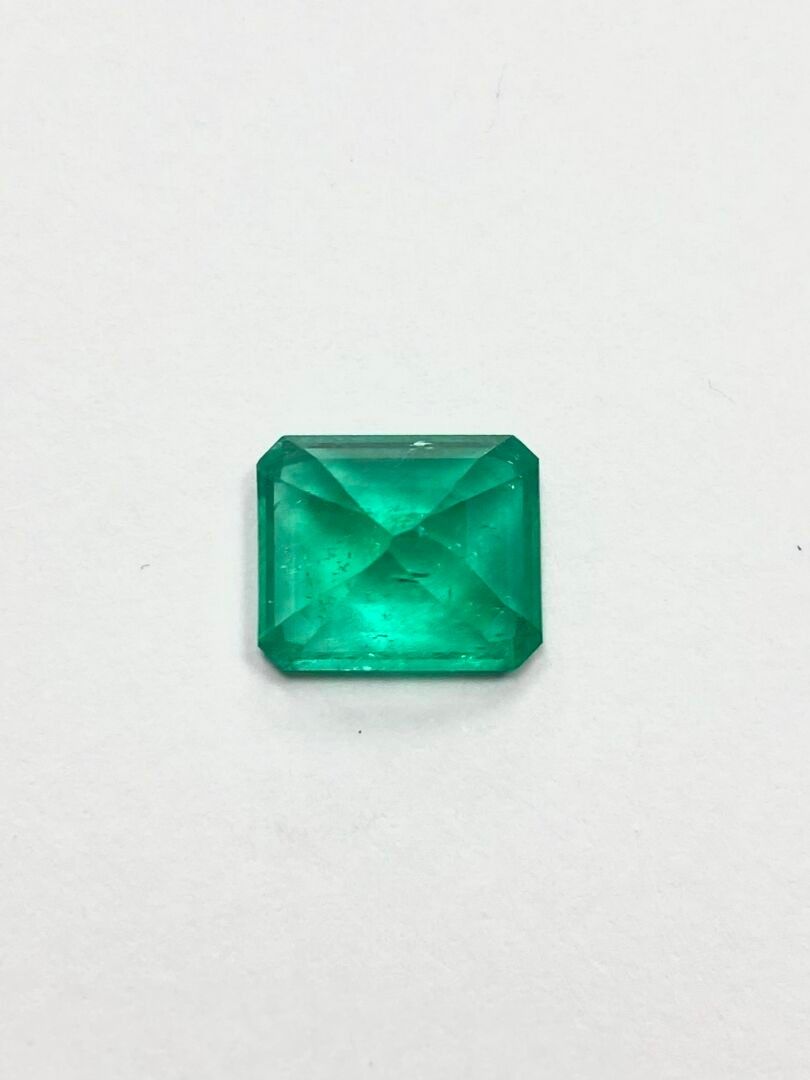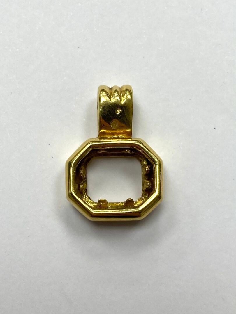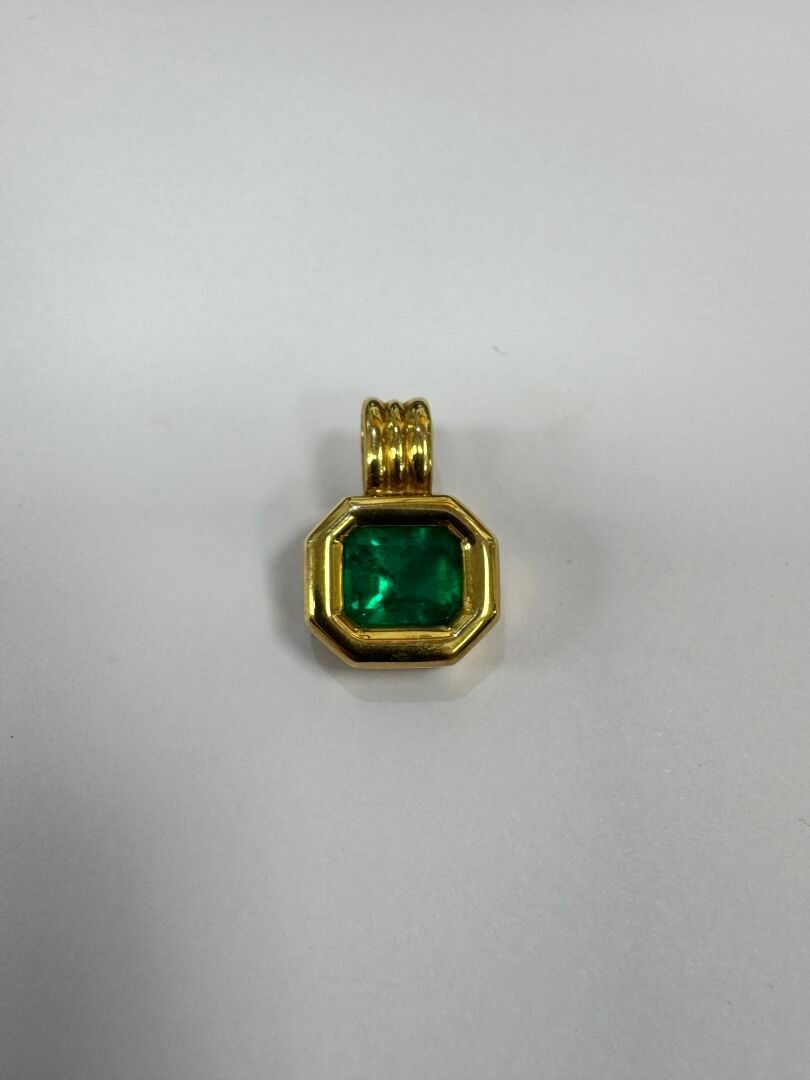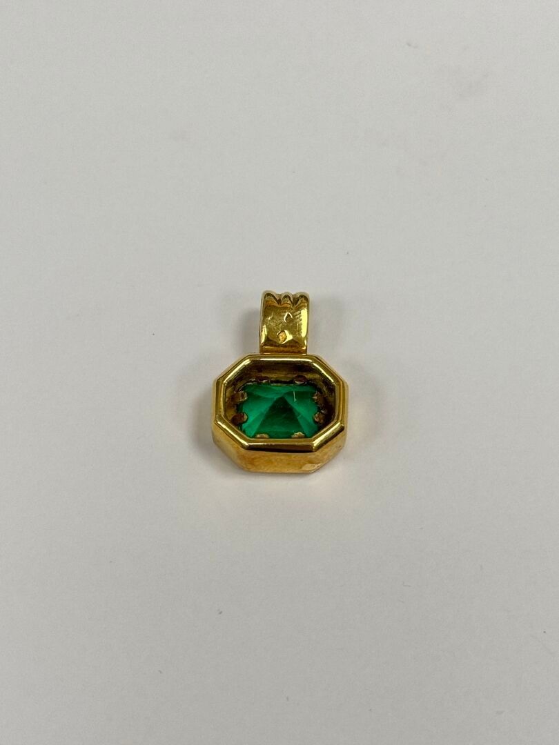 18 carat (750 thousandths) yellow gold pendant set with a rectangular cut emerald from Colombia weighing 3.24 carats (10 x 8.32 x 6.13 mm).