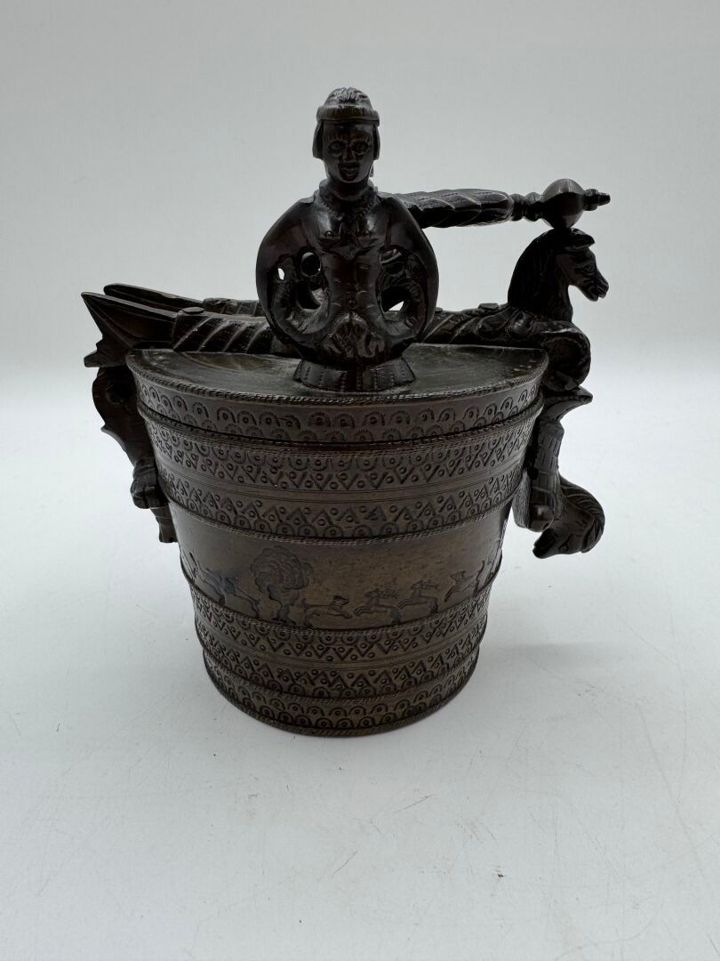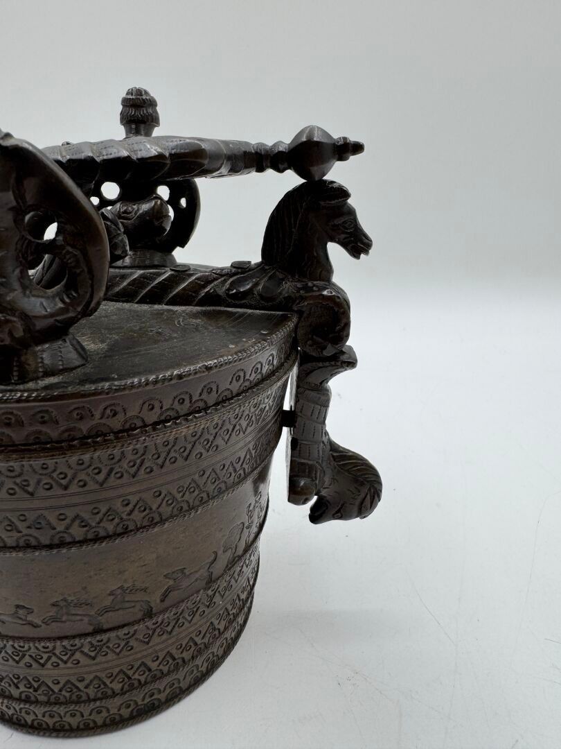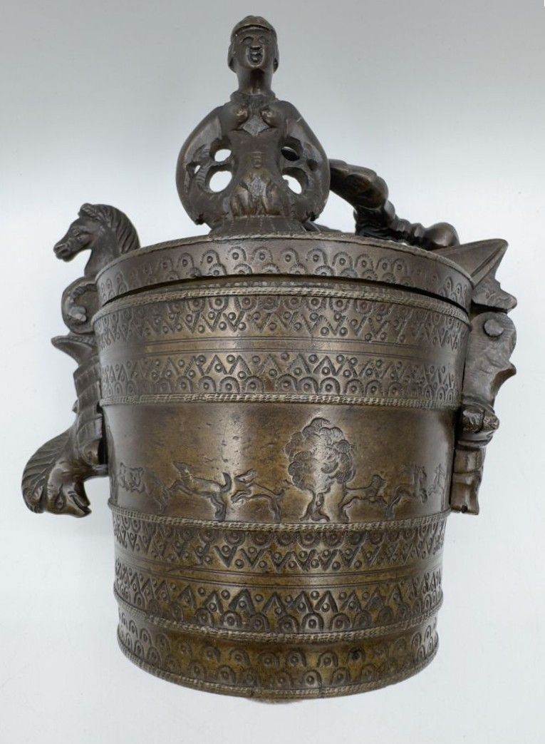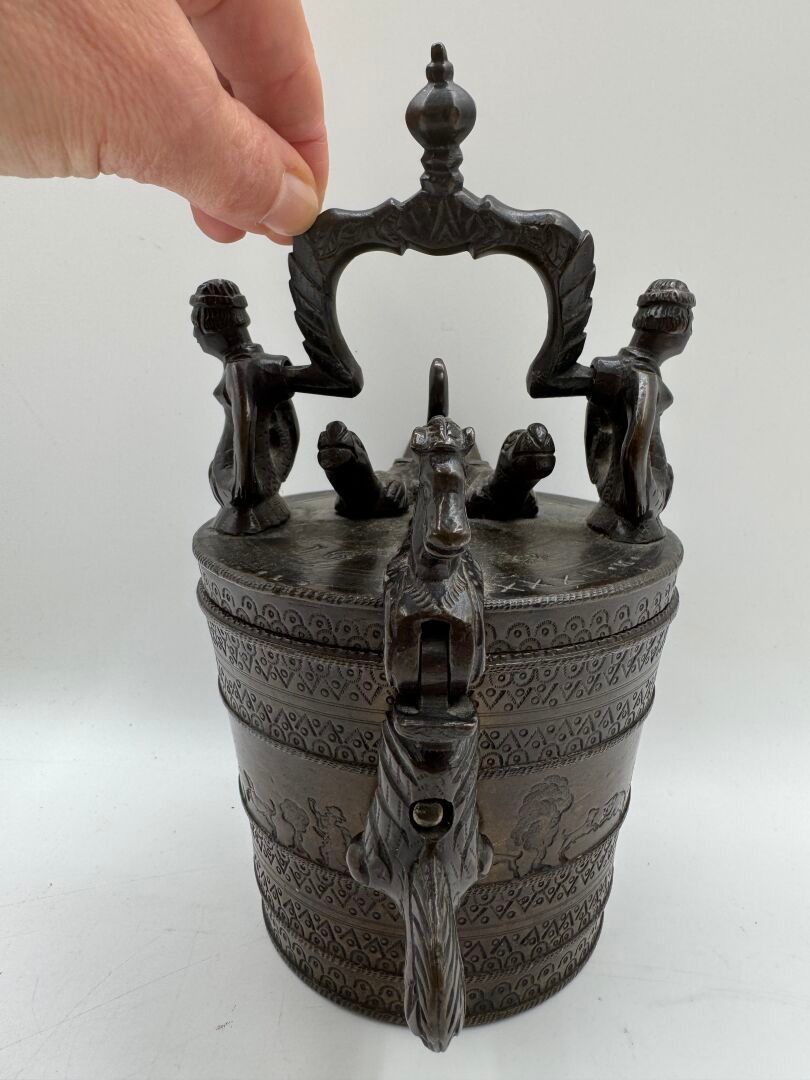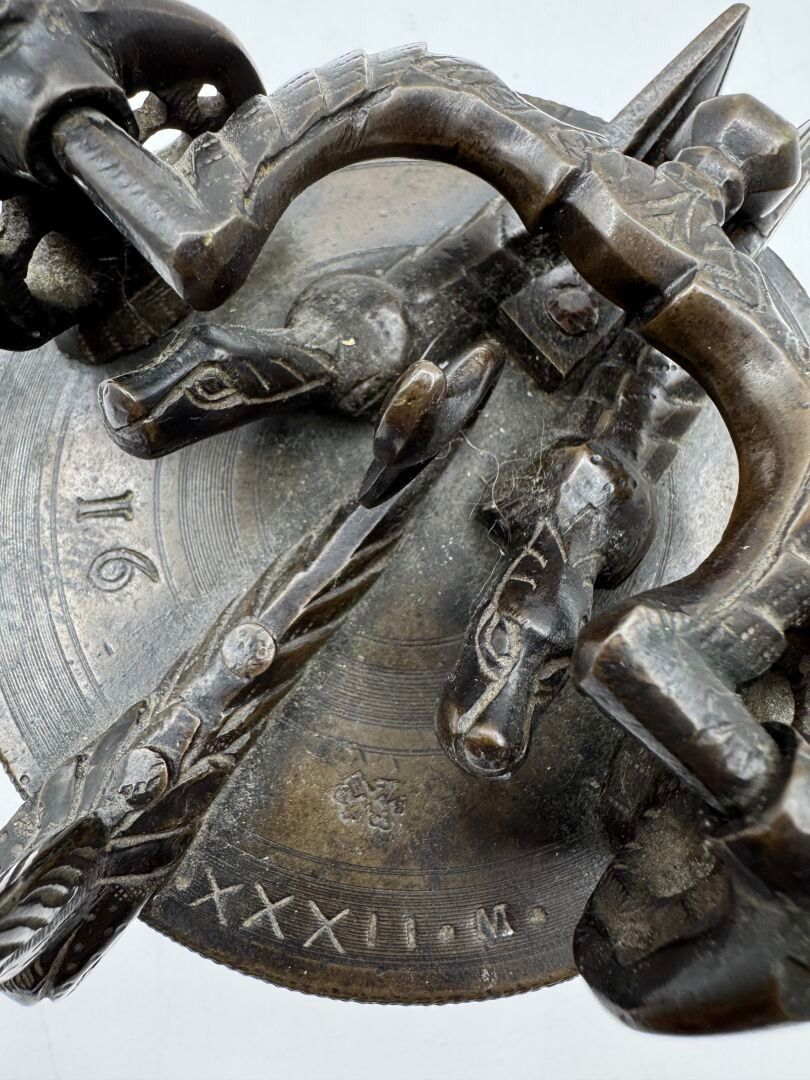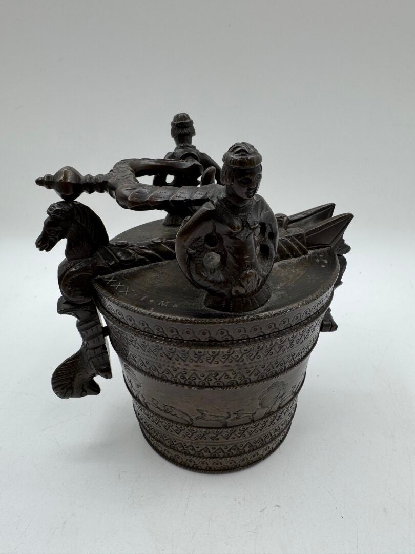 A 16-pound bronze "Nuremberg" weight stack, the body decorated with geometric friezes separated by cords and a hunting scene of running dogs. The hinged handle is supported by two busts of two-tailed mermaids. Hasp lock in the shape of sea horses. Nine buckets. Mark of the "balancier fondeur", Georg Schiller received master in 1633 still active in 1656. For a similar battery: Victoria & Albert Museum, London, number 559:1 17th century. (Two weights missing) Total height: 21 cm.