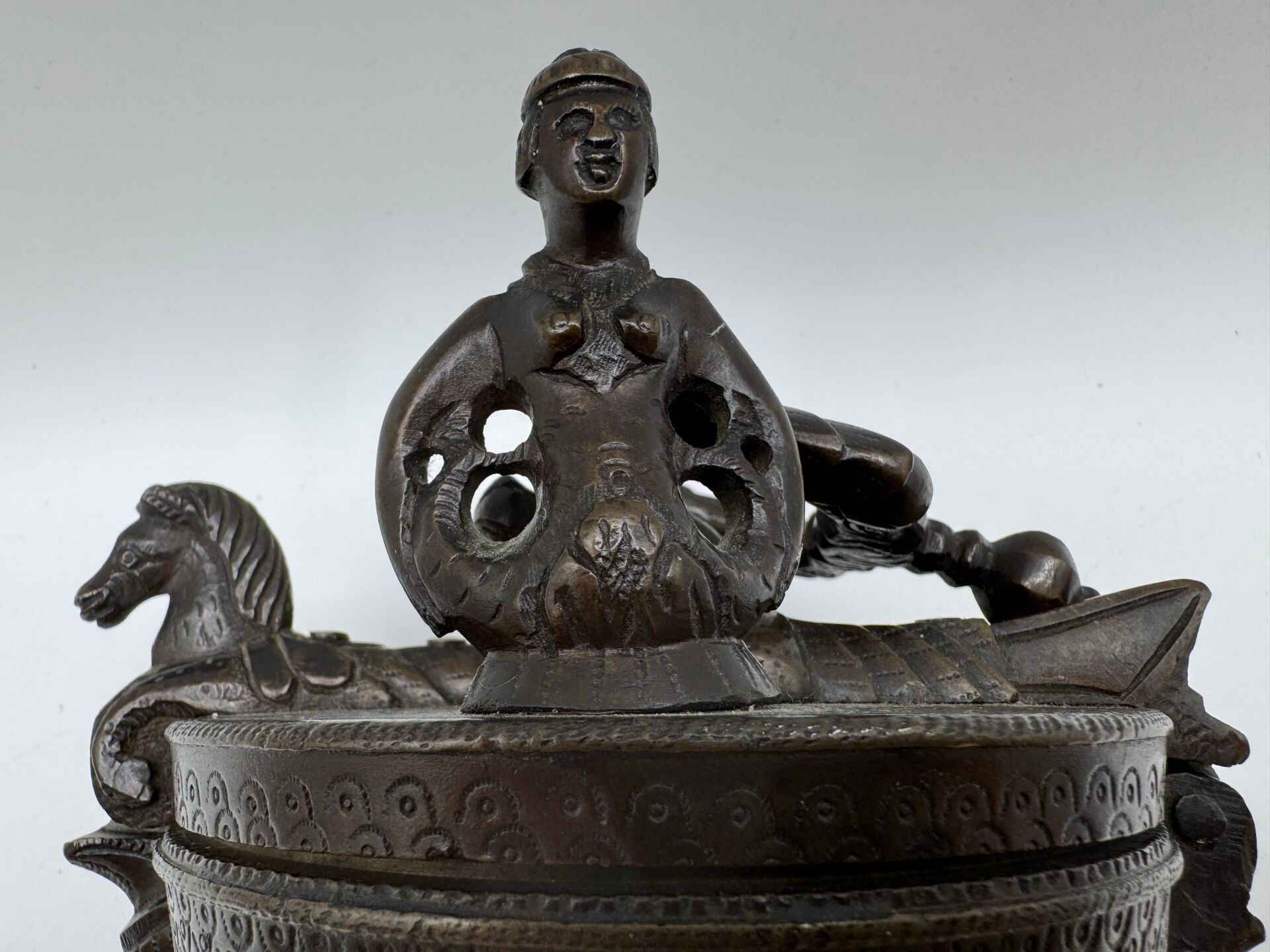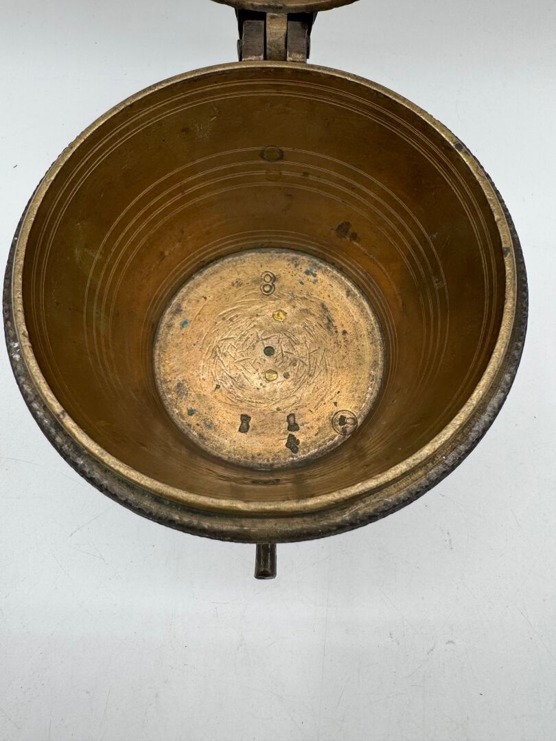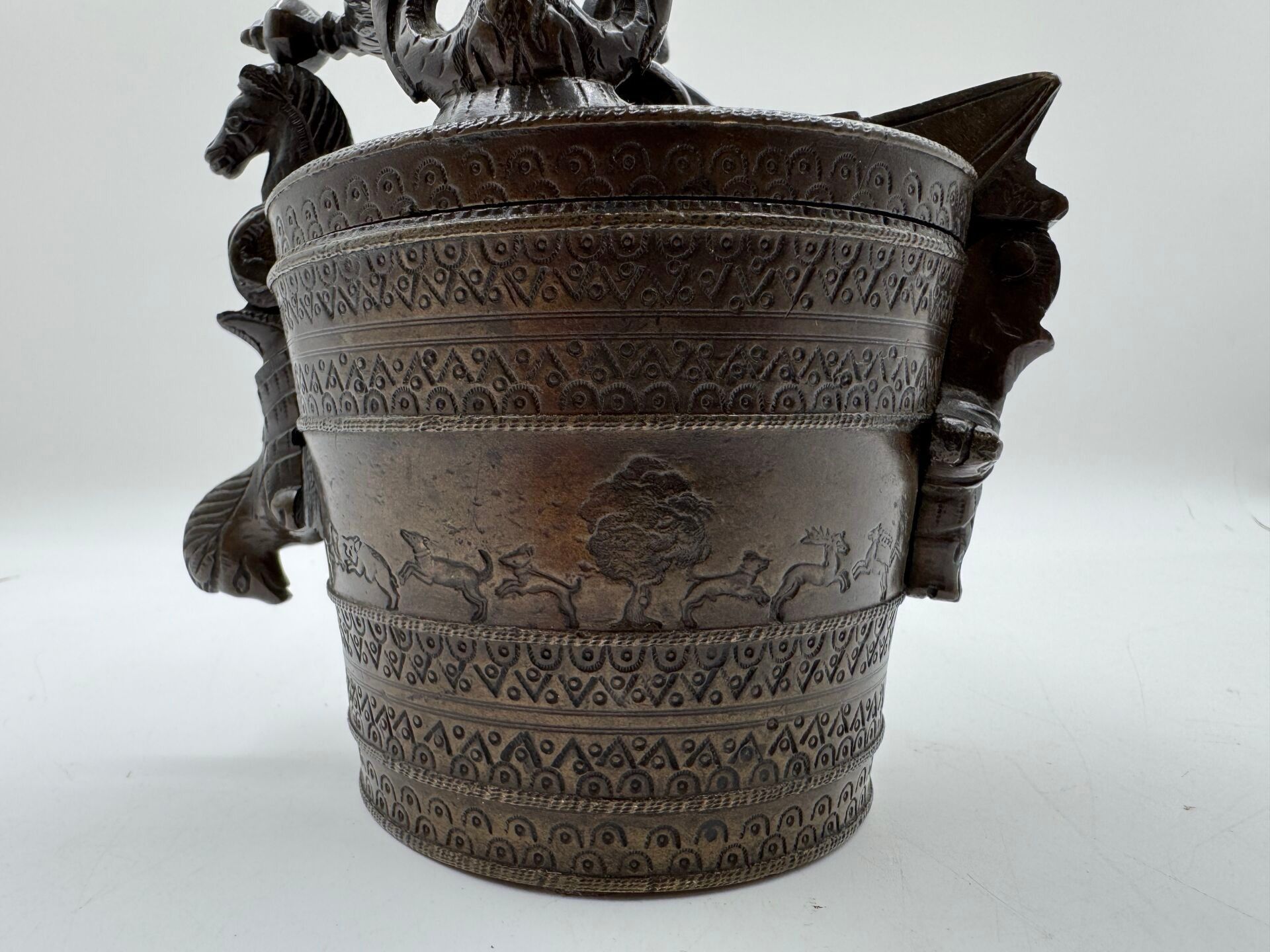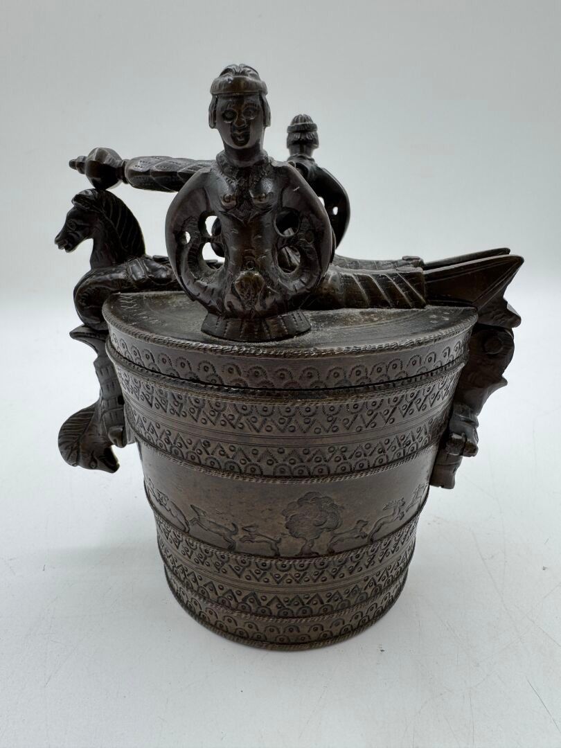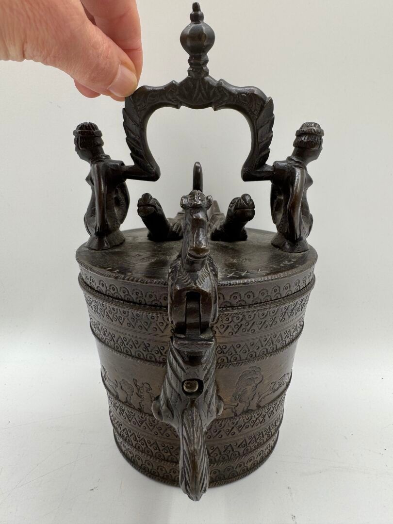 A 16-pound bronze "Nuremberg" weight stack, the body decorated with geometric friezes separated by cords and a hunting scene of running dogs. The hinged handle is supported by two busts of two-tailed mermaids. Hasp lock in the shape of sea horses. Nine buckets. Mark of the "balancier fondeur", Georg Schiller received master in 1633 still active in 1656. For a similar battery: Victoria & Albert Museum, London, number 559:1 17th century. (Two weights missing) Total height: 21 cm.