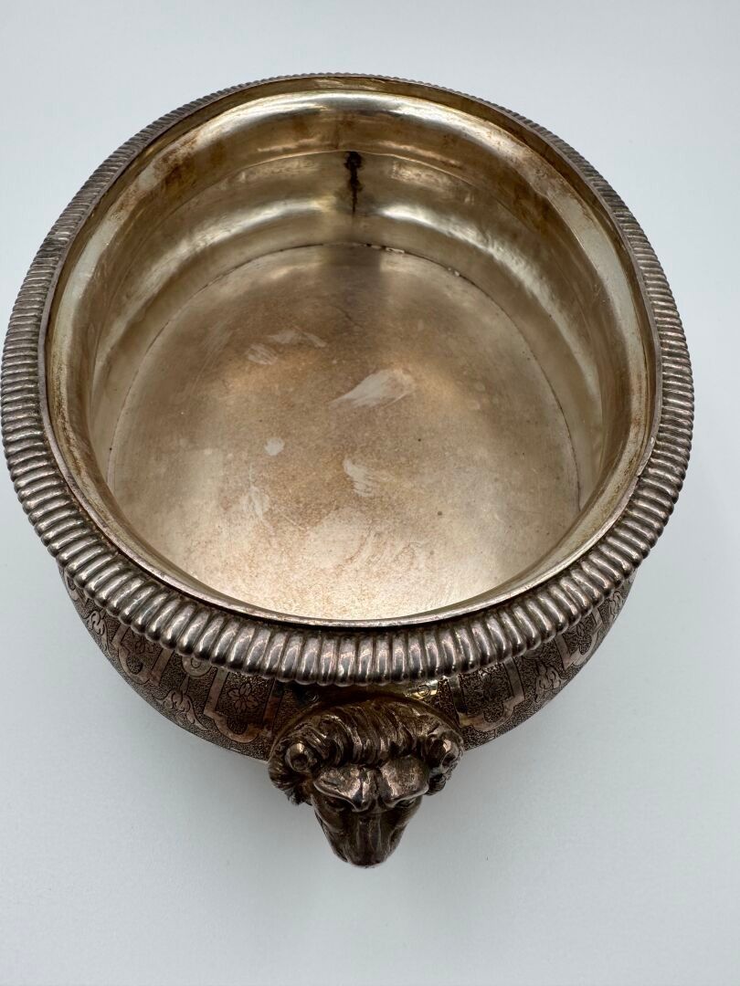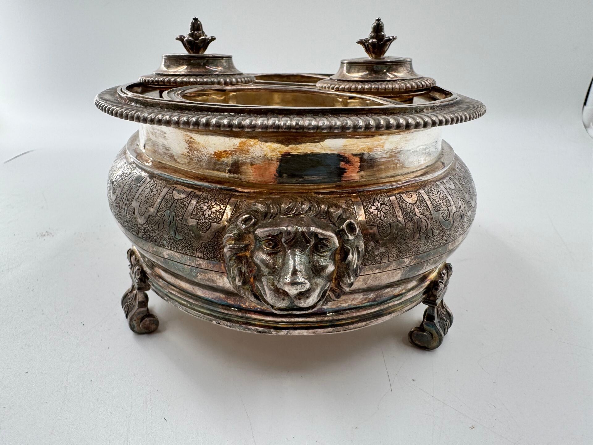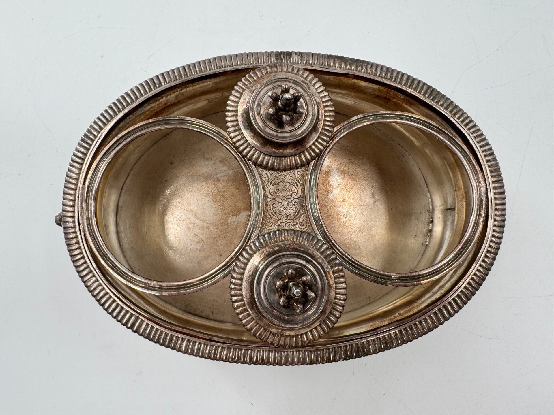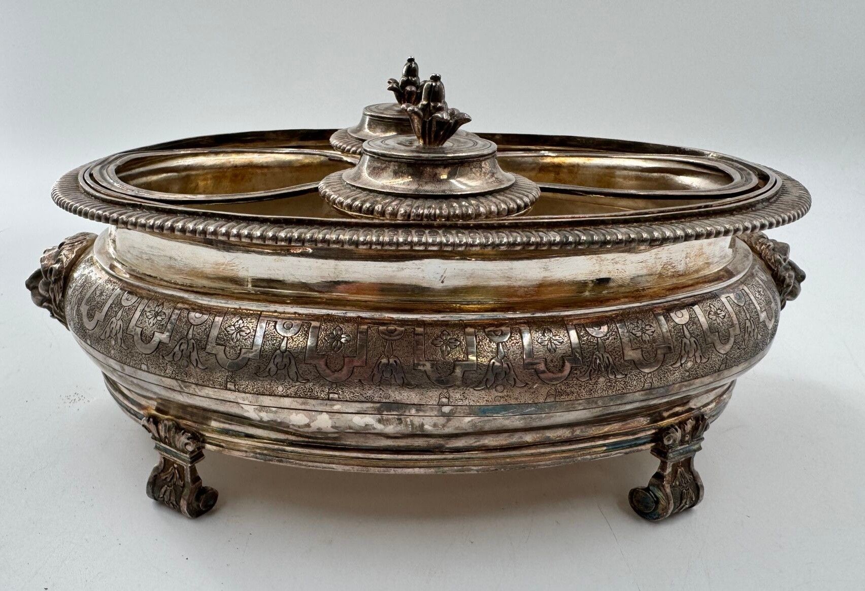 A silver oval oil basin. It stands on four console and scrolled feet, chased with a fall of fleurons and attached to the body by an acanthus scroll. The central part of the body, which is curved, is carved with alternating fleurons and lambrequins with tassels and flowers on an amati background. At the ends are lion's head masks. The upper border is chased with gadroons. The removable grille, chiselled with fillets, holds the bottles and stoppers. In the centre, a compartment chased with scrolls and flowers on a bitter background. The stoppers, edged with gadroons and with a doucine, are surmounted by an exploded fleuron.