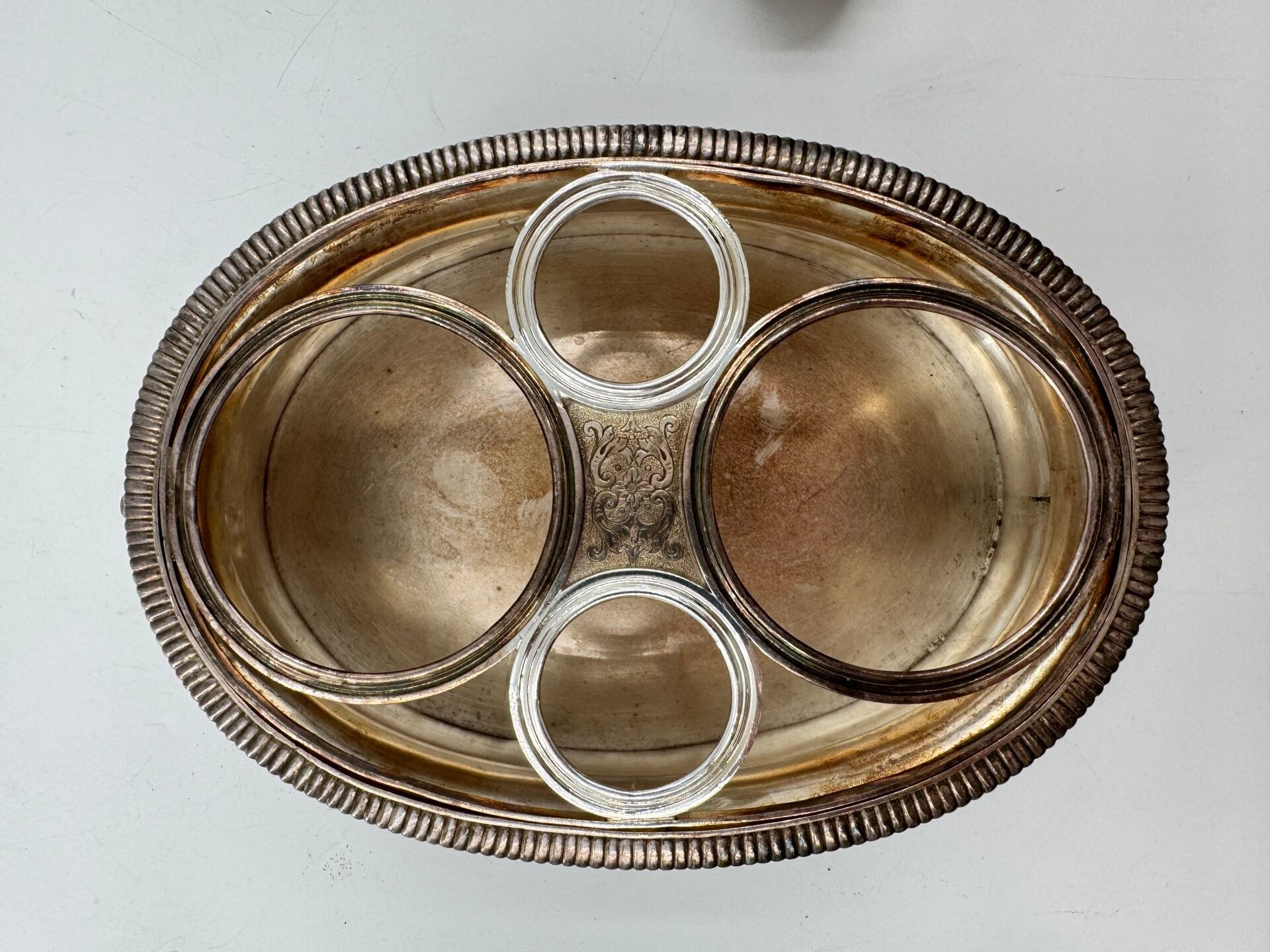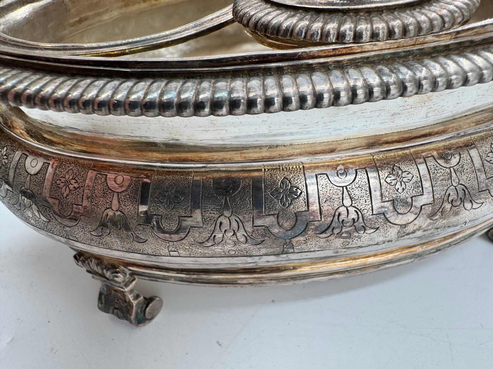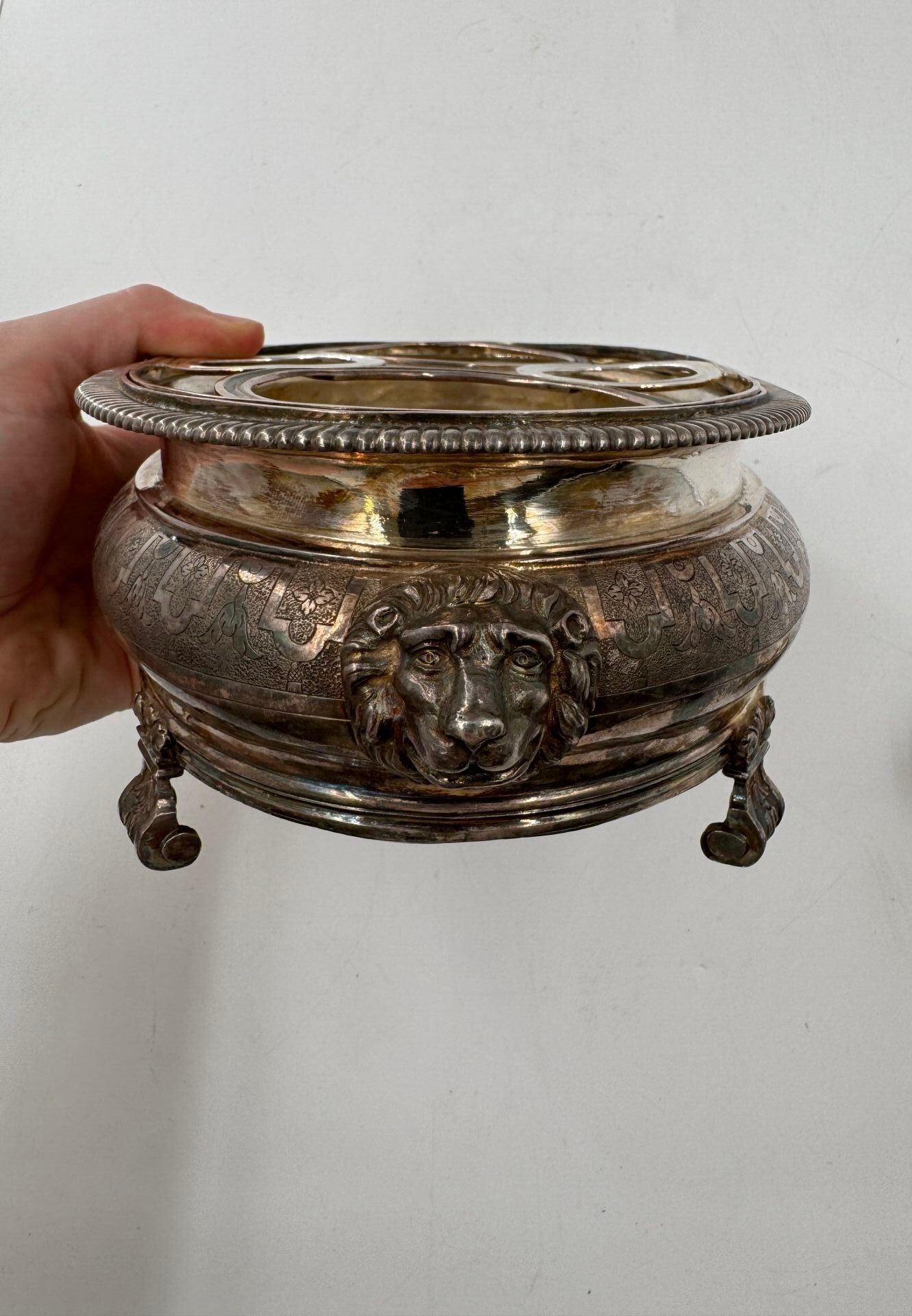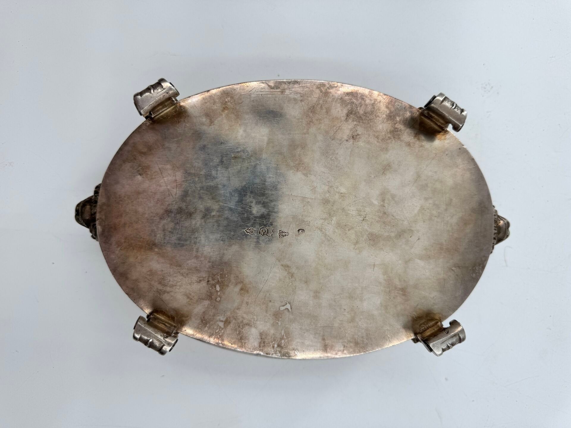 A silver oval oil basin. It stands on four console and scrolled feet, chased with a fall of fleurons and attached to the body by an acanthus scroll. The central part of the body, which is curved, is carved with alternating fleurons and lambrequins with tassels and flowers on an amati background. At the ends are lion's head masks. The upper border is chased with gadroons. The removable grille, chiselled with fillets, holds the bottles and stoppers. In the centre, a compartment chased with scrolls and flowers on a bitter background. The stoppers, edged with gadroons and with a doucine, are surmounted by an exploded fleuron.